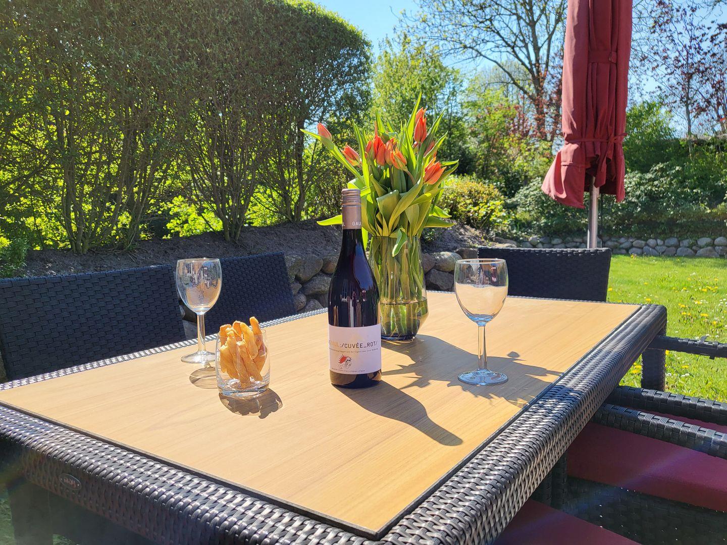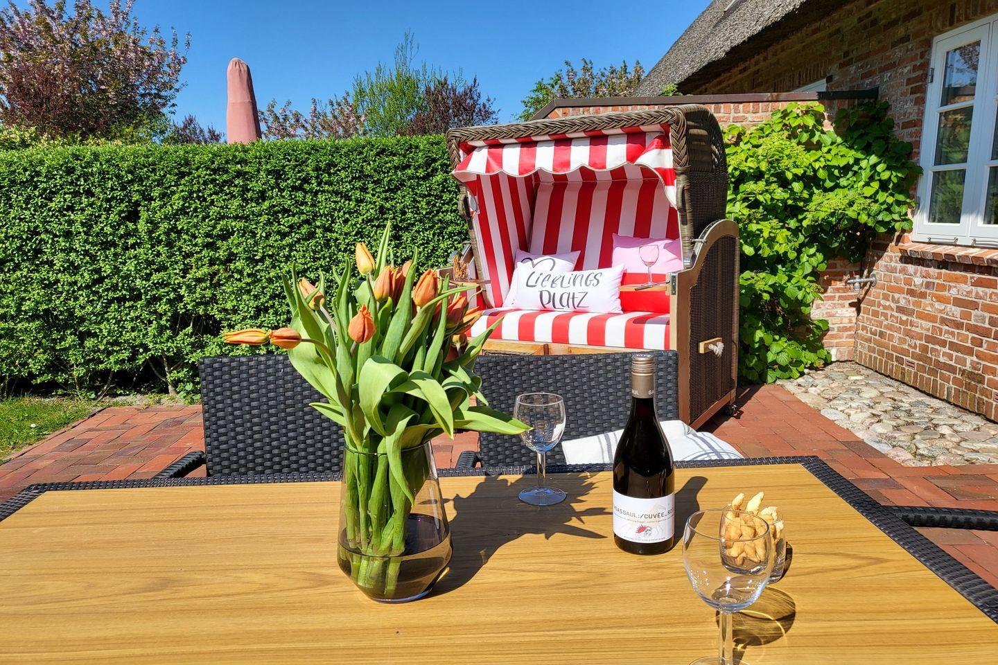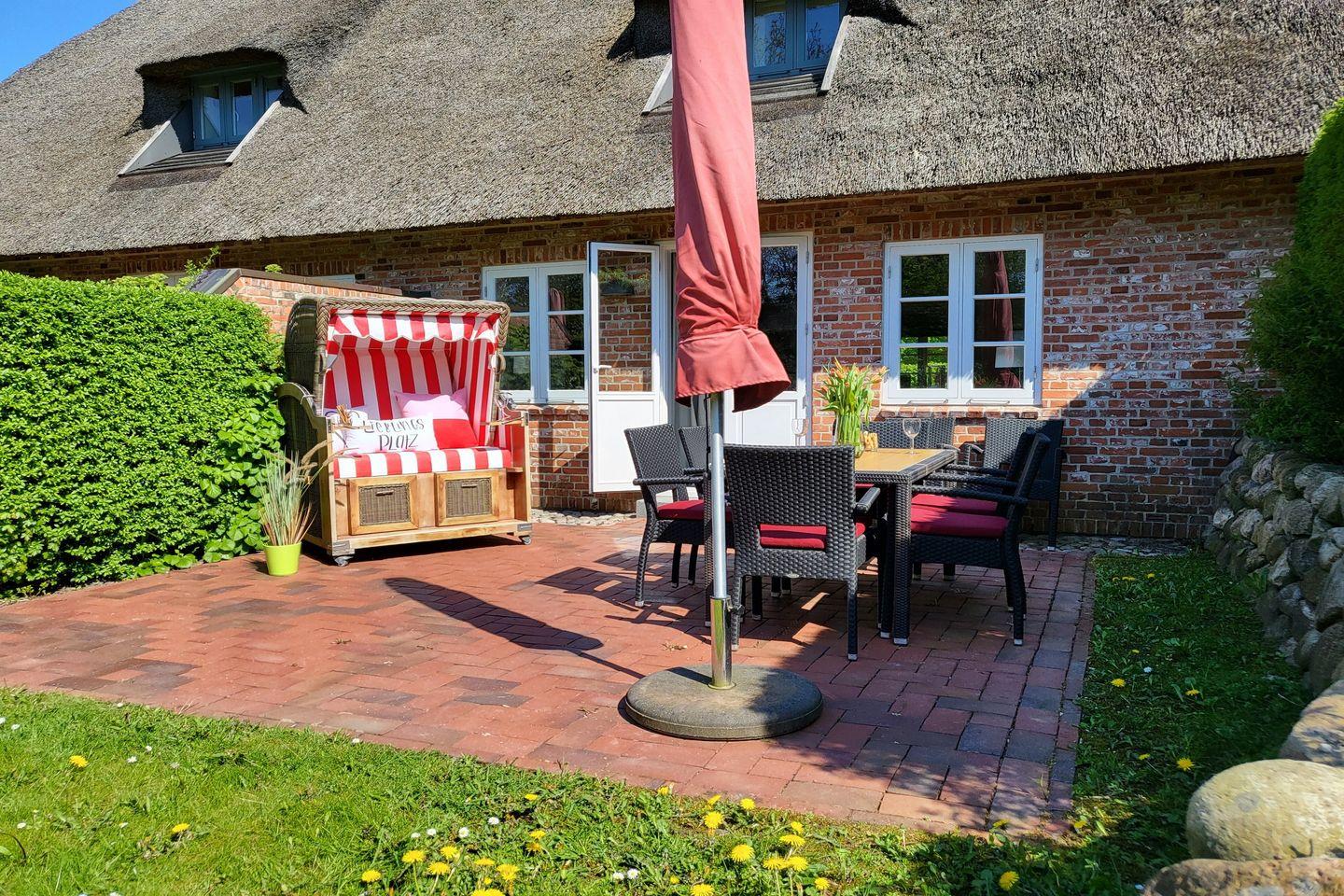 Zur Ferienwohnung gehört eine möblierte Terrasse, in der Saison steht hier ein typisch norddeutscher Strandkorb zur Verfügung. Bei gutem Wetter bietet sich das gemeinsame Essen und Sonnen auf der Terrasse wunderbar an.