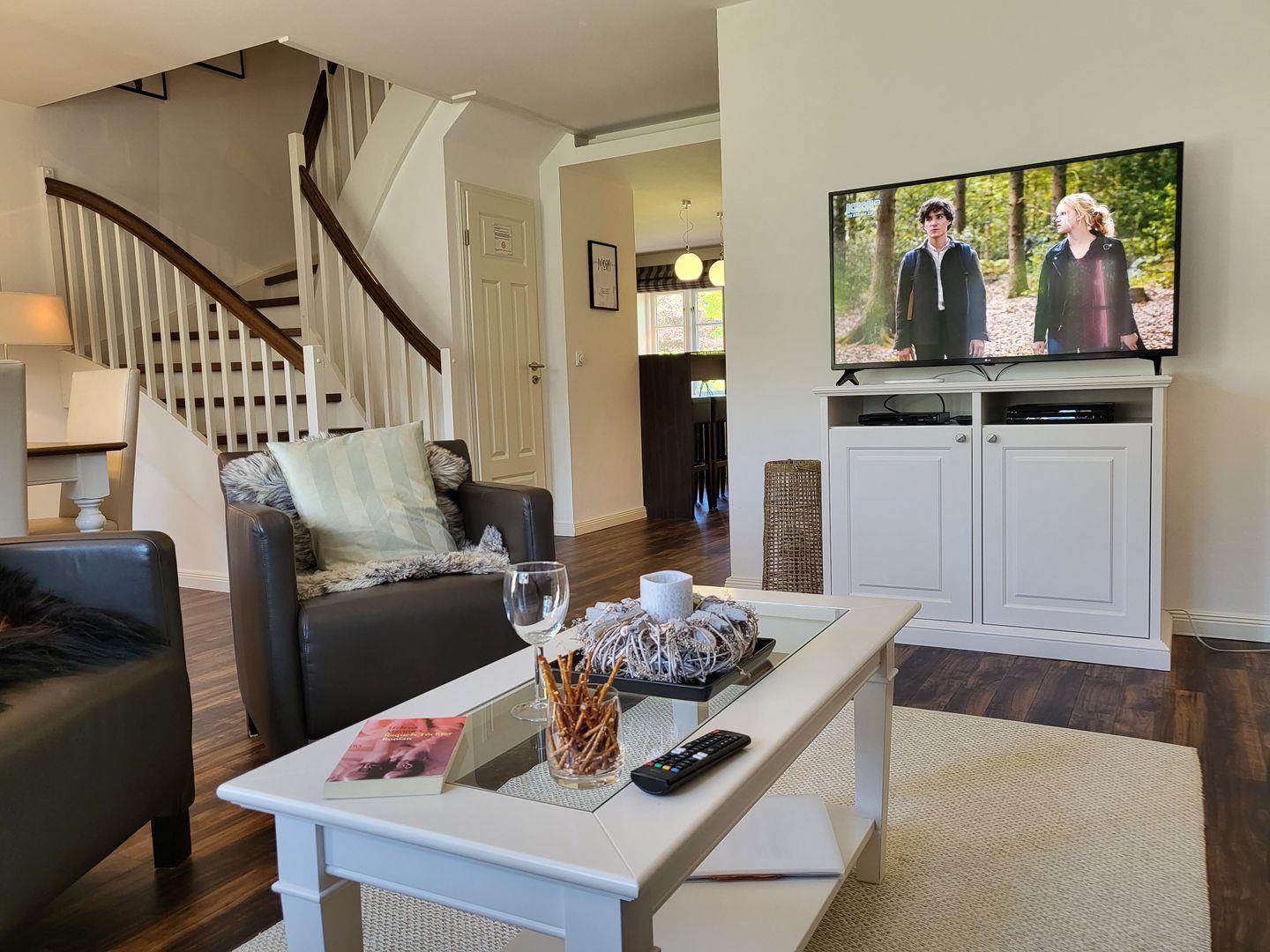 Für die multimediale Unterhaltung ein großer 50" Ultra-HD-TV samt DVD-Player, Netflix Streaming (kostenlos), Disney Plus Streaming (kostenlos),