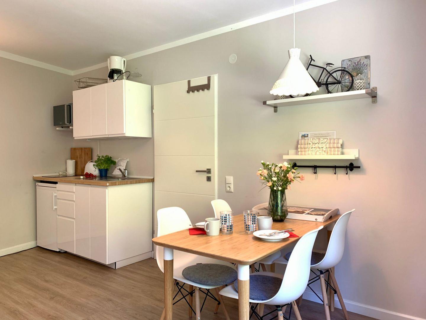 Der Wohnraum ist modern und hell gestaltet, er ist ausgestattet mit gemütlicher 120x200cm Schlafcouch, einer kleinen Essecke sowie einem Flachbild-TV. Kostenfreies W-LAN ist vorhanden. Die anliegende Küchenzeile ist gut ausgestattet und verfügt über ein kompaktes Cerankochfeld, Mikrowellenbackofen, Kühlschrank und Kaffeemaschine.