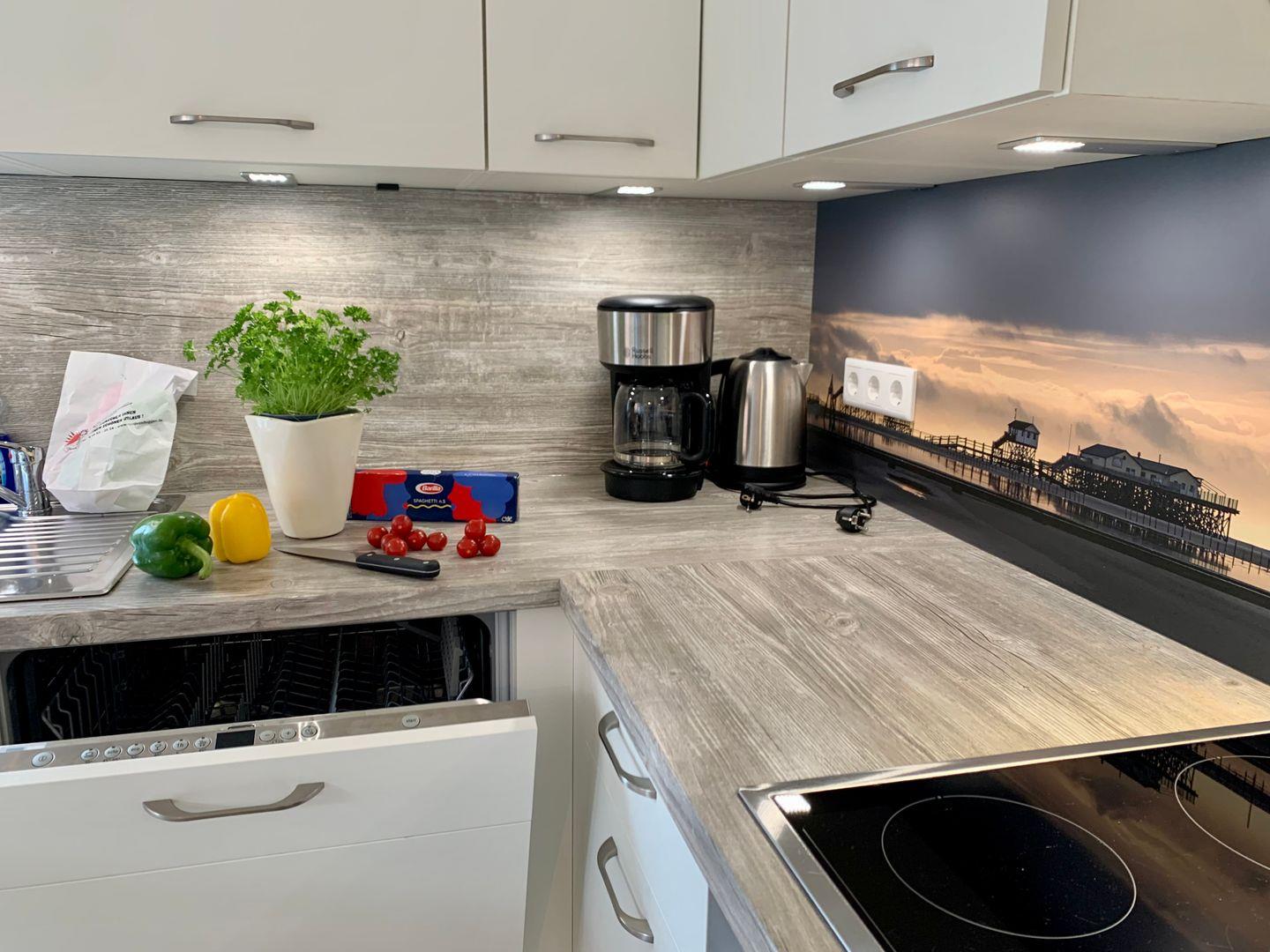 In den Raum integriert liegt die hochwertige Küche, zu deren Ausstattung unter anderem Cerankochfeld und Herd, ein Kühlschrank mit Gefrierfach sowie Geschirrspüler und Kaffeemaschine.