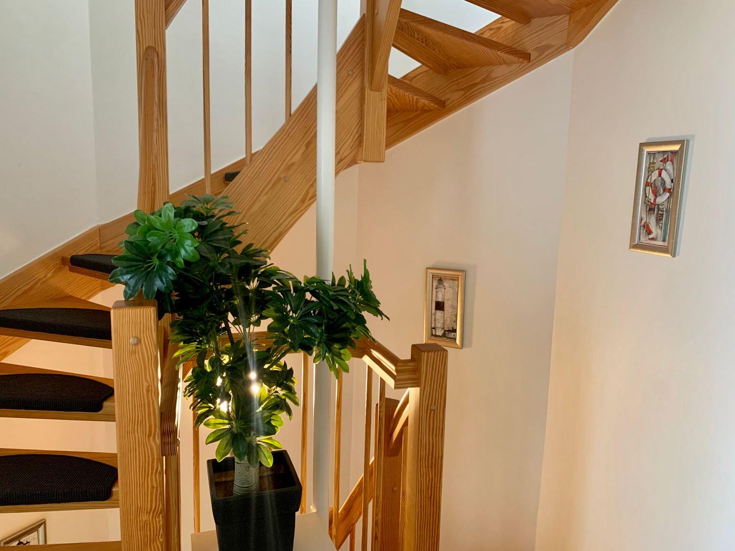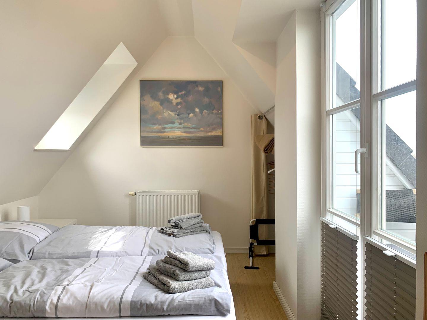 Im ersten OG finden befinden sich zwei Schlafzimmer: eines mit 2 Einzelbetten, ein weiteres mit einem Einzelbett. Das Badezimmer mit Dusche sowie Waschtrockner ist ebenfalls auf der Etage. Das Dachgeschoss bietet vom dritten Schlafzimmer, ausgestattet mit Doppelbett und hochwertigen Matratzen (August 2025) auf offener Galerie, eine Dachloggia mit traumhaftem Blick auf den Ordinger Strand.