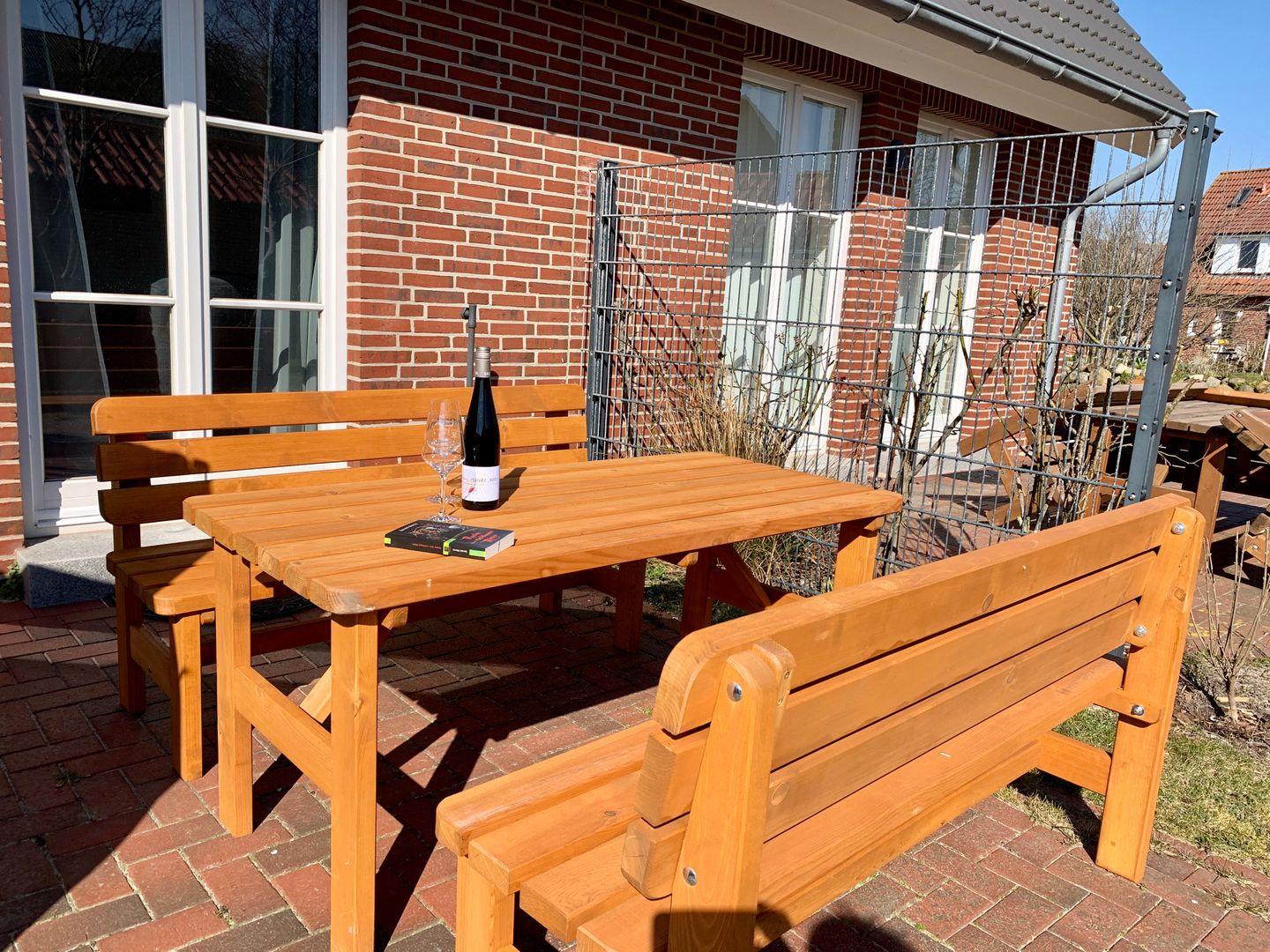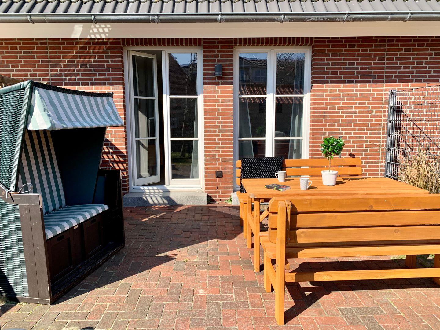 Die angrenzende, separate Küche verfügt über hochwertige Ausstattung und bietet Ceranfeld sowie Backofen und Geschirrspüler. Die Terrasse ist mit hochwertigen Holzmöbeln ausgestattet, ein Strandkorb steht in der Saison zur Nutzung bereit.
