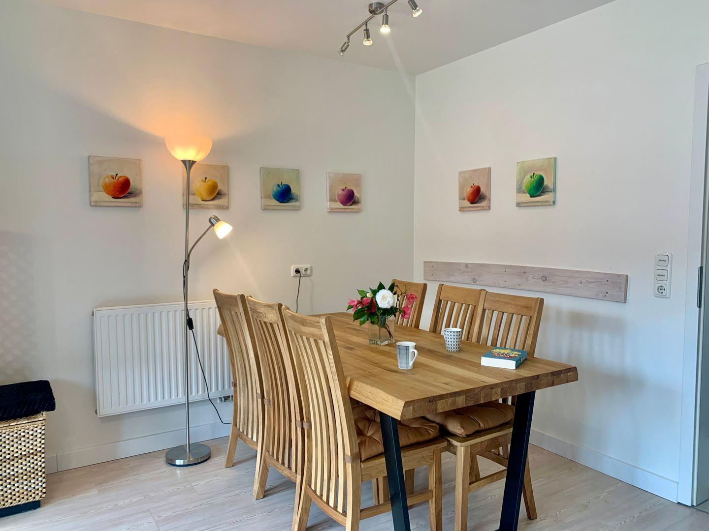 Ein großer hölzerner Esstisch, die sehr komfortable Couch und ein charmanter Sessel laden zum gemeinsamen Essen, Verweilen und Genießen ein. Hier finden Smart-TV mit DVD und Blue-Ray-Player Platz.