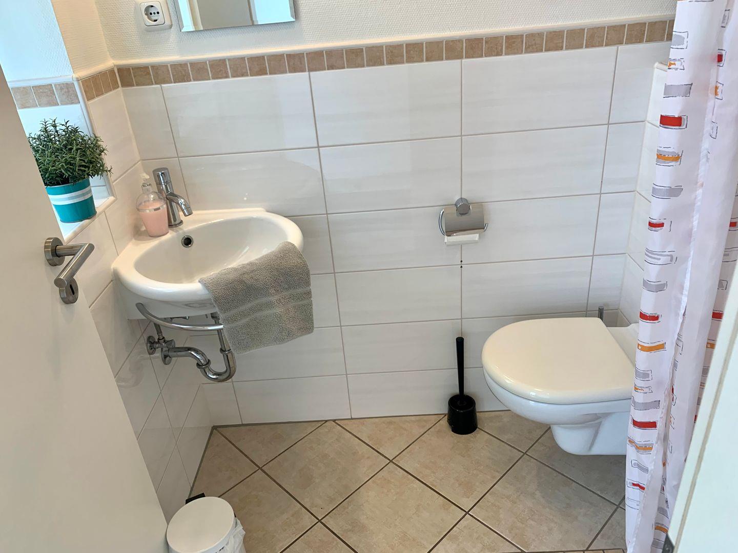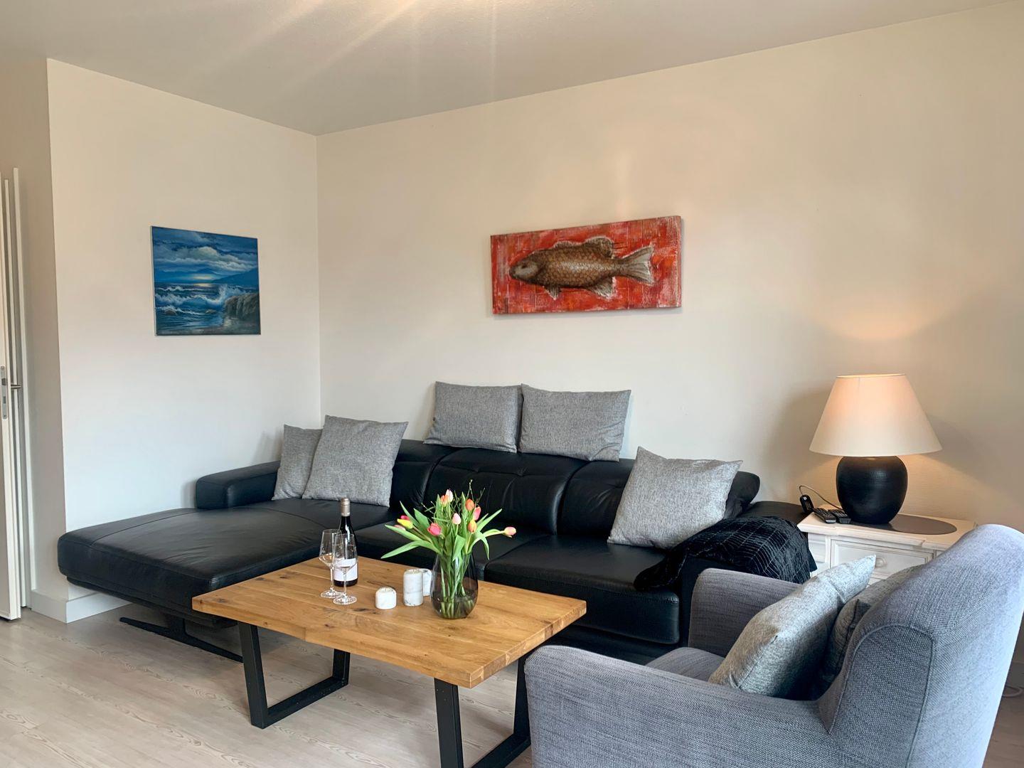Helles Wohnzimmer, moderne Küche, Gäste-WC mit Dusche, ein separates Schlafzimmer mit 2