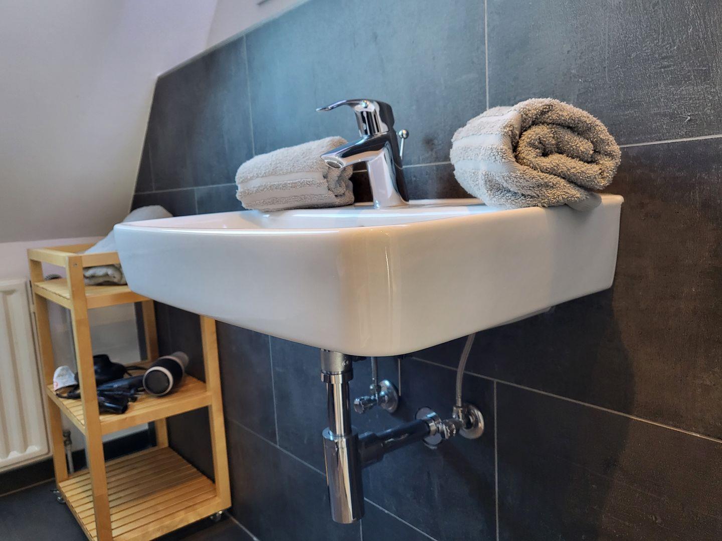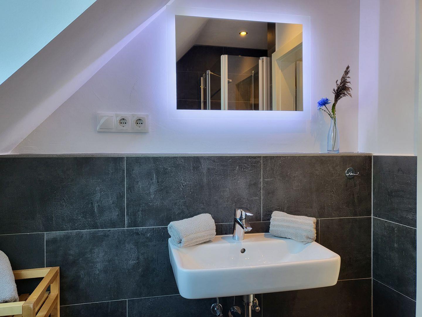 Zur Ferienwohnung gehört ein modern gestaltetes Badezimmer mit Veluxfenster, Dusche, Waschbecken und WC.