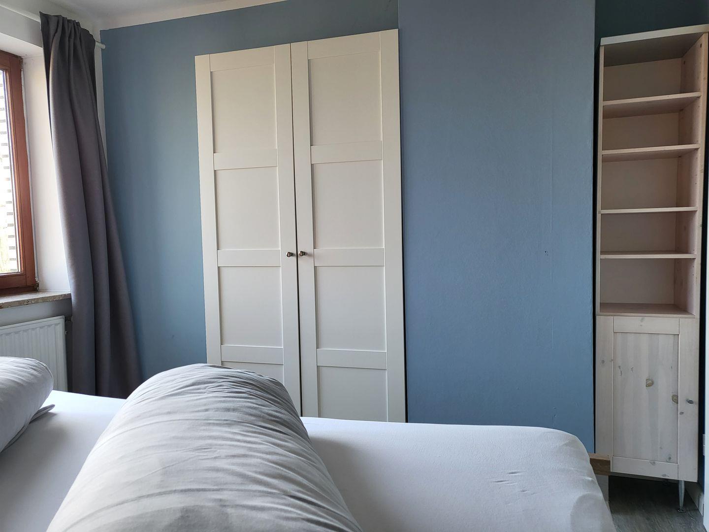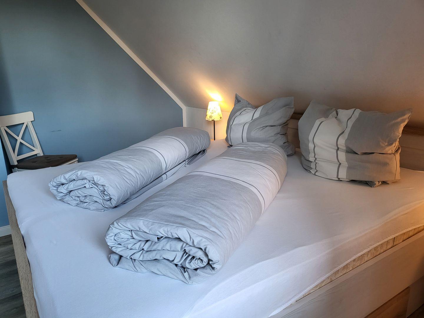 Das Schlafzimmer ist ausgestattet mit komfortablem 180x200cm Doppelbett und einem großen Kleiderschrank. Ein Babyreisebett und ein Kinderhochstuhl stehen kostenfrei zur Verfügung.