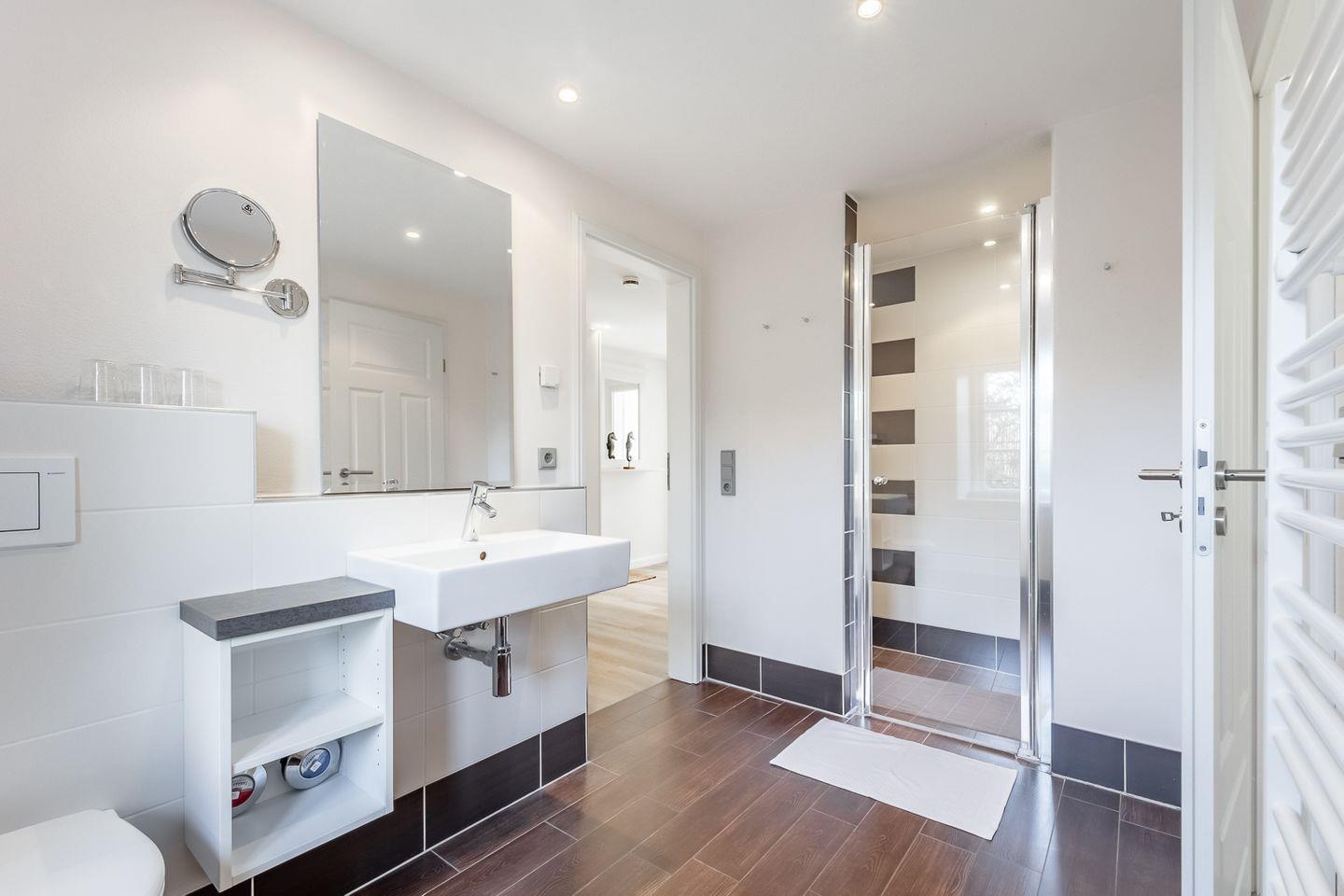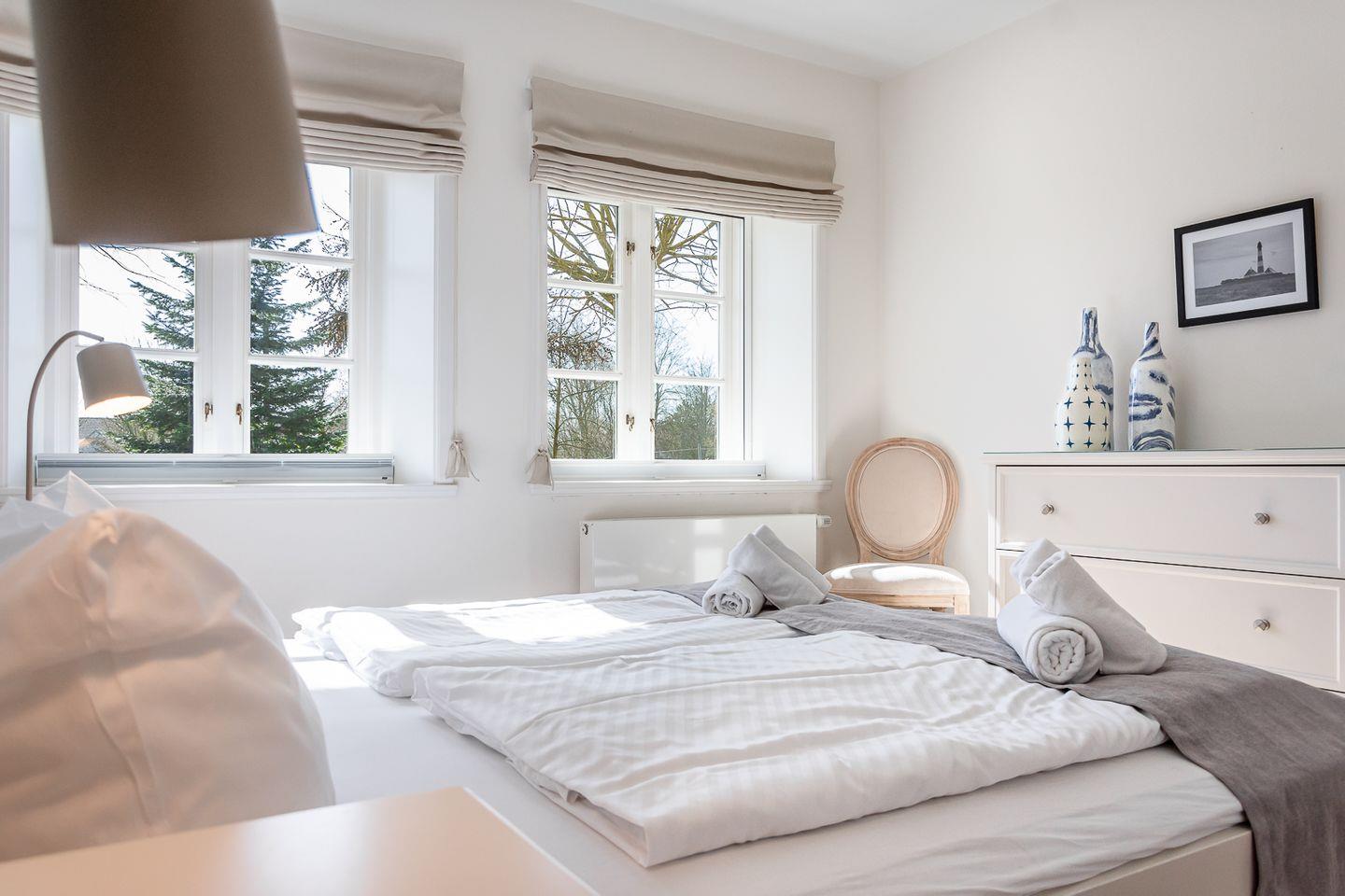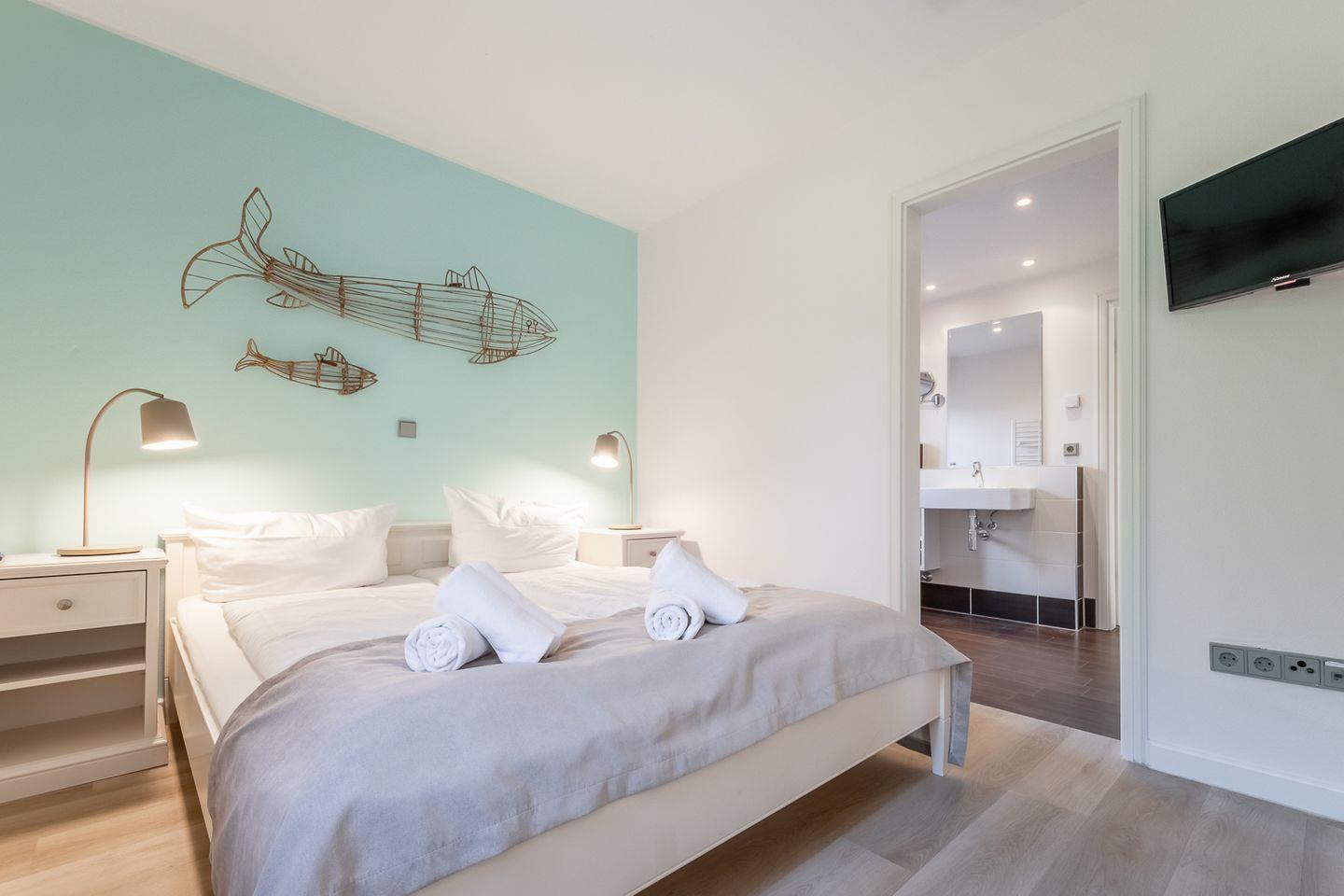 Am Esstisch findet die gesamte Familie Platz, für die multimediale Unterhaltung sorgen Flachbild-TV und kostenfreies W-LAN. Angrenzend liegt die sehr gut ausgestattete, integrierte Küche. Dort stehen unter anderem Cerankochfeld und Backofen, Kühlschrank mit Gefrierfach sowie Geschirrspüler und Mikrowelle zur Verfügung. Weiterhin stehen eine Kaffeemaschine für Filterkaffee sowie eine weitere für Kaffee-Pads zur Verfügung. Zur Ferienwohnung gehören 2 geräumige Schlafzimmer. Eines ist ausgestattet mit großen180x200cm Doppelbett, im zweiten steht ein 160x200cm Doppelbett zur Verfügung. In einem Schlafzimmer steht ein Safe für Wertsachen zur Verfügung. Ein edles Badezimmer mit bodengleicher Dusche und WC gehört ebenfalls zur Ausstattung der hochwertigen Ferienwohnung.