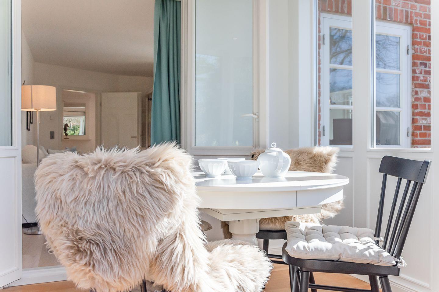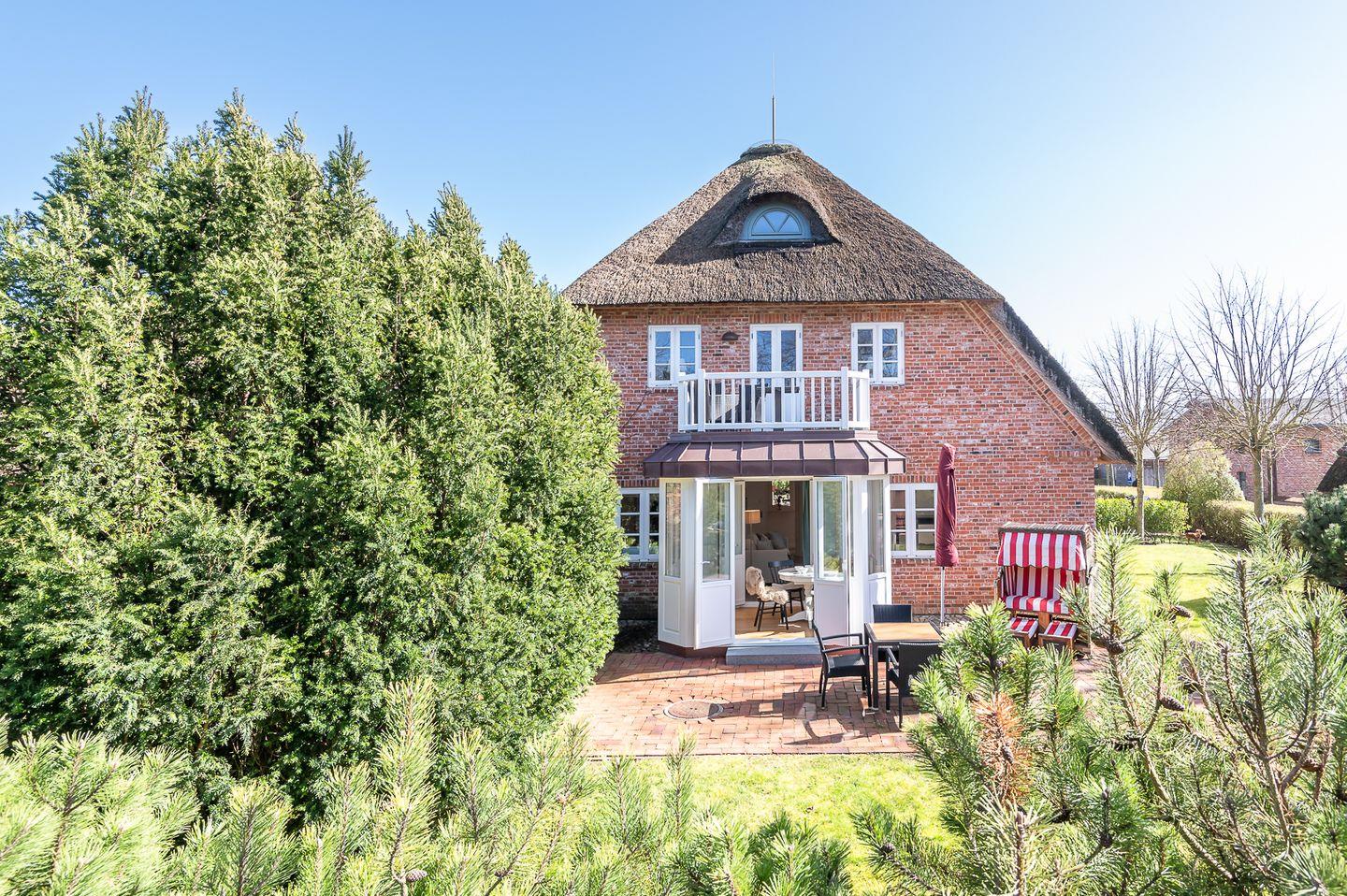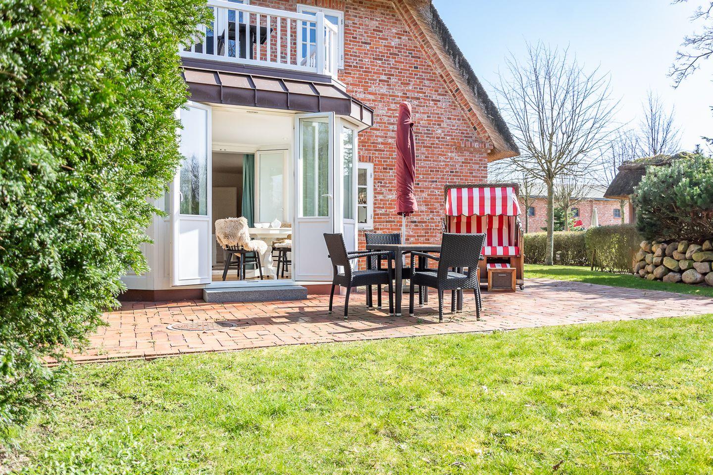 Zur Ferienwohnung gehört eine möblierte Terrasse, in der Saison steht hier ein typisch norddeutscher Strandkorb zur Verfügung.