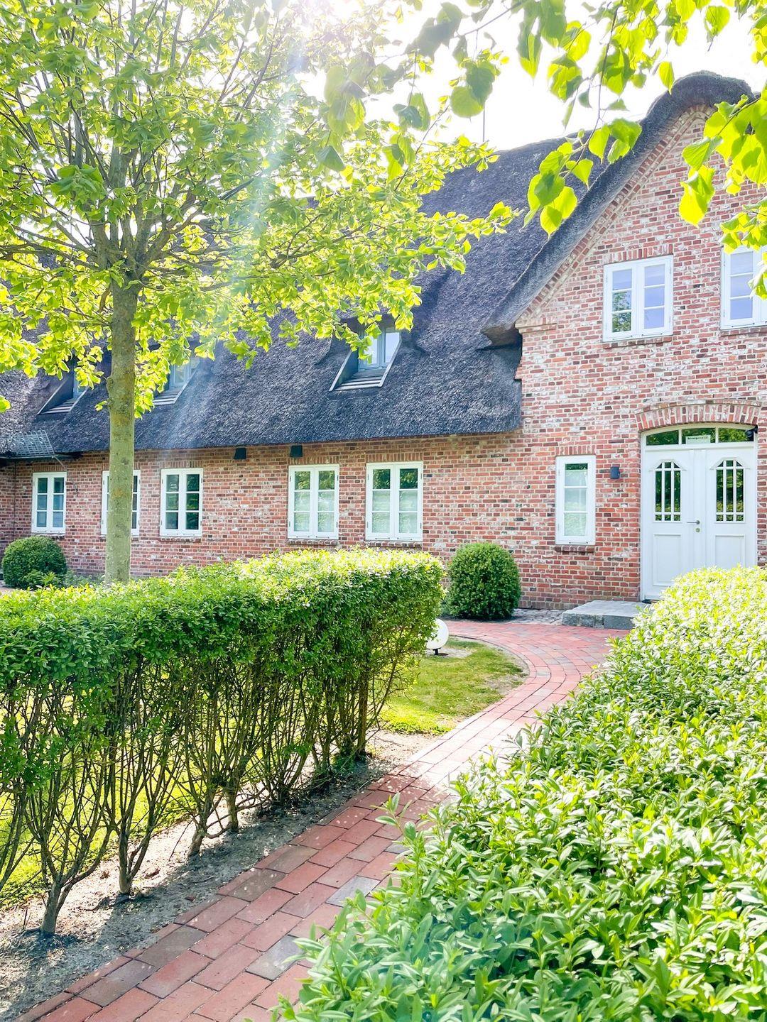 Durch den Übergang zur Terrasse wirkt der modern und lebendig gestaltete Wohnraum wunderbar hell und einladend. Durch die Holzsprossenfenster bietet sich ein toller Ausblick auf den Garten und das Reetdach.