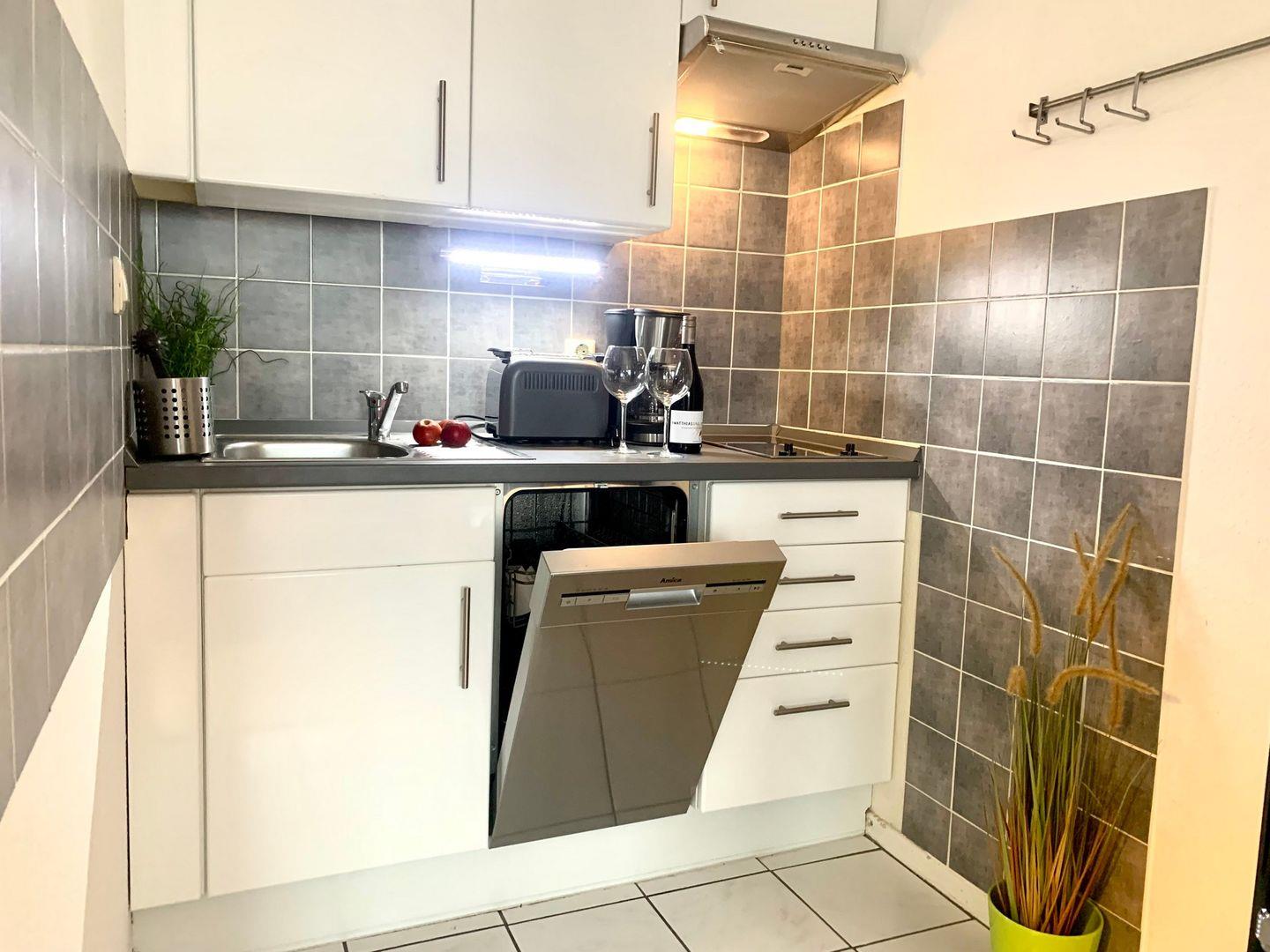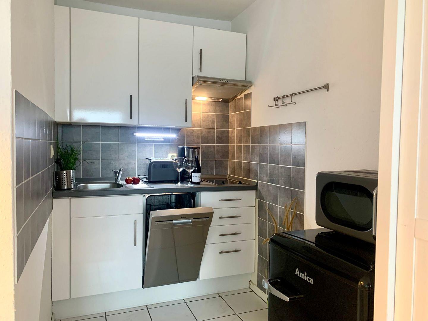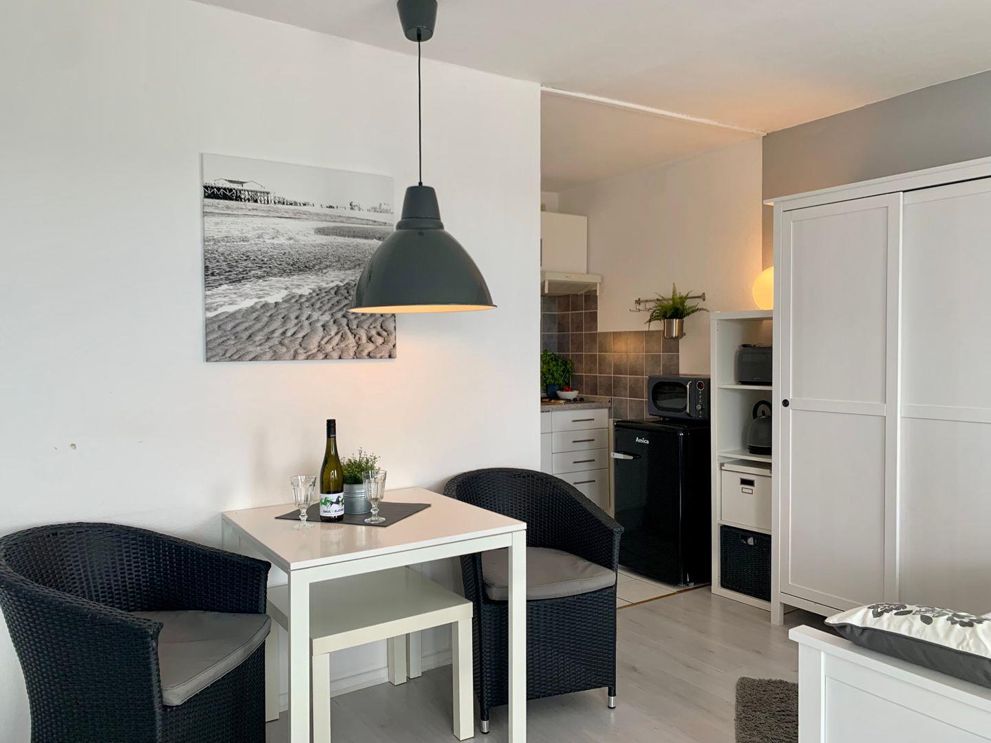 Die in den Raum integrierte Küchenzeile ist gut ausgestattet, unter anderen sind Kochfeld und Mikrowelle sowie Kaffeemaschine und Kühlschrank mit Gefrierfach vorhanden.
