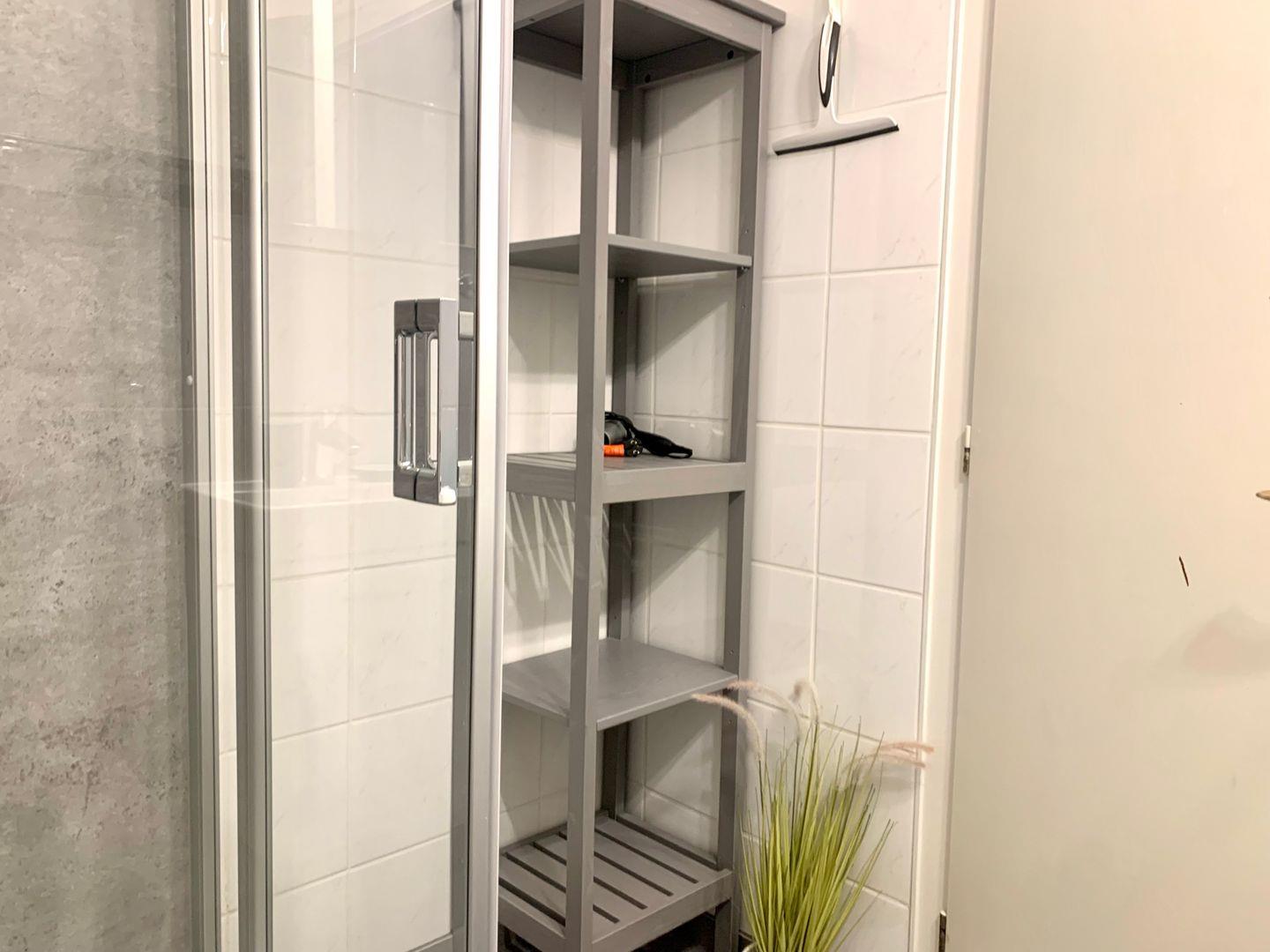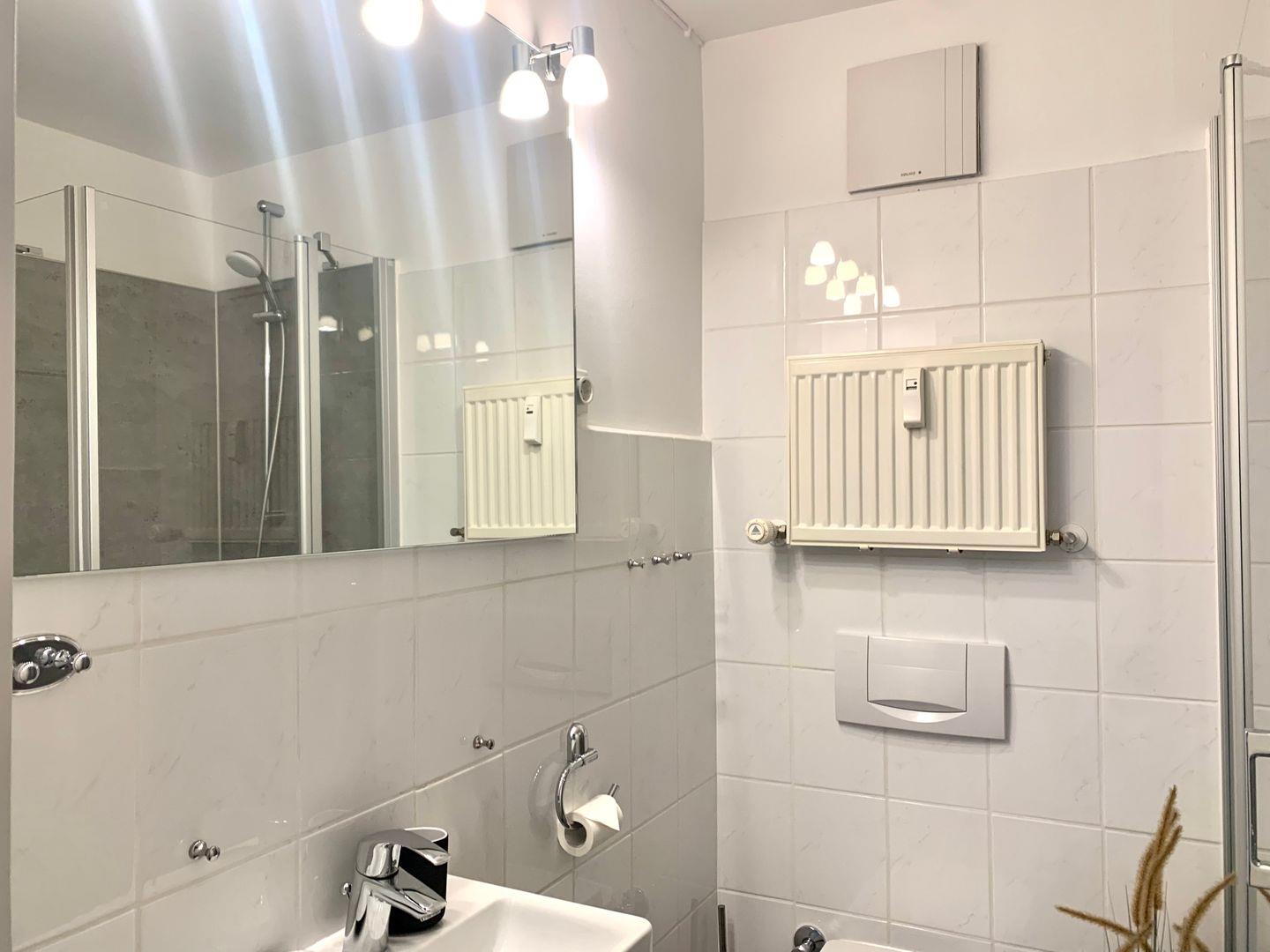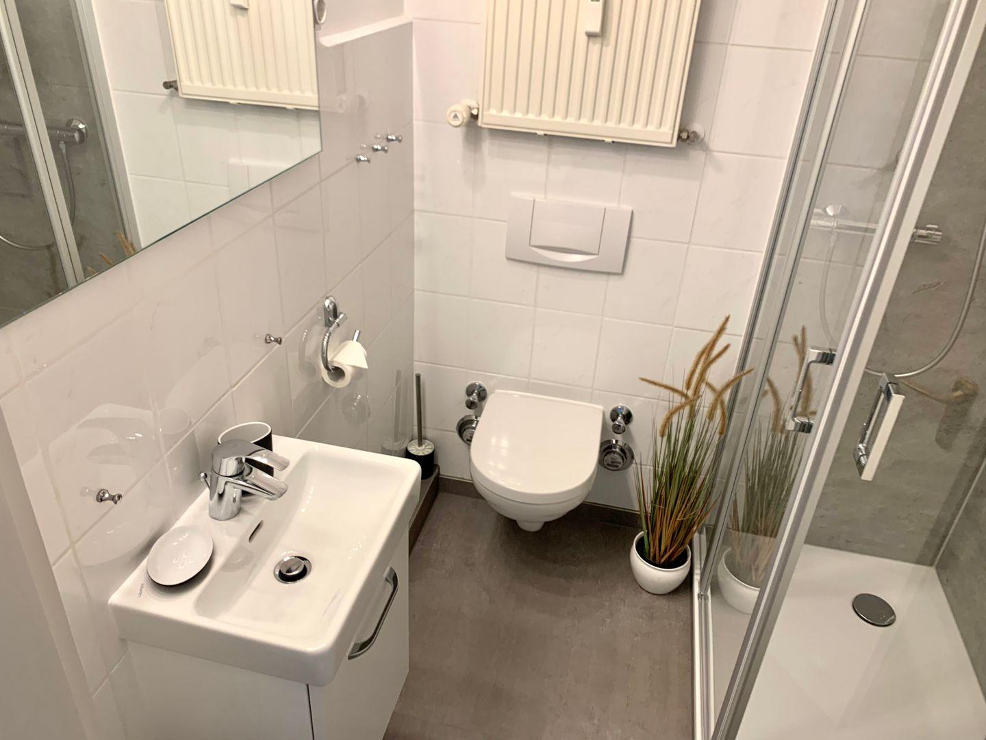 Das moderne Duschbad mit WC verfügt über einen sehr niedriger Duscheinstieg und ist unter anderem mit einem Haartrockner ausgestattet.