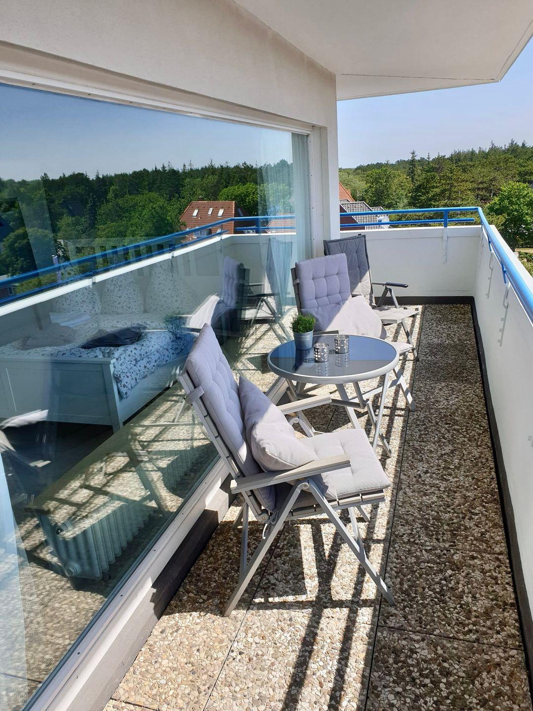 Zur Ferienwohnung gehört ein großzügiger, möblierter Eckbalkon mit seitlichem Meerblick.