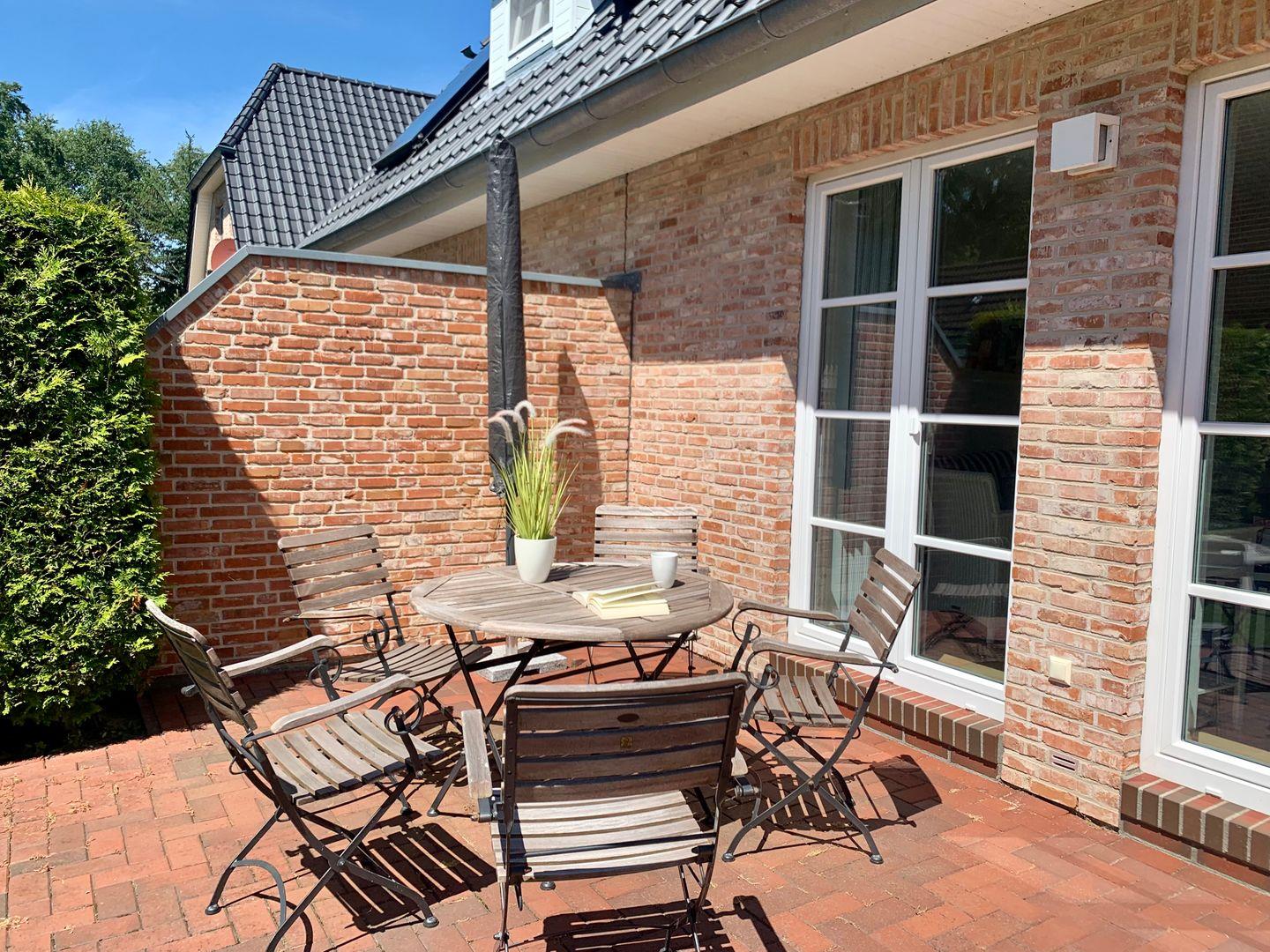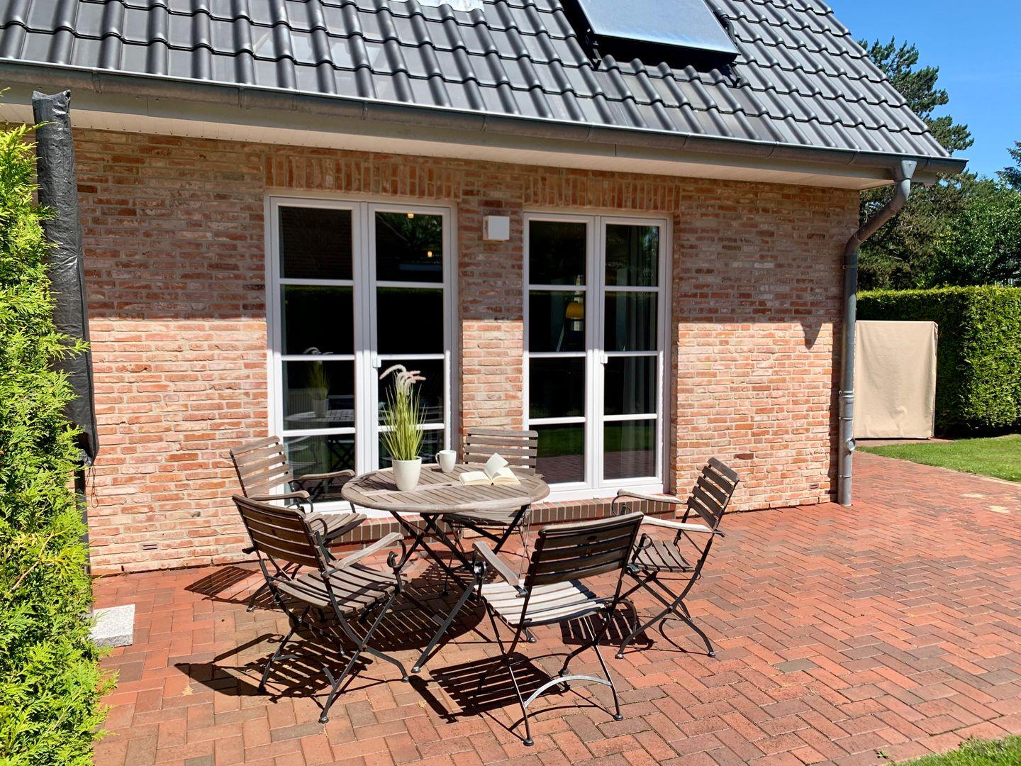 Zum modern und maritim eingerichteten Ferienhaus gehört eine große, möblierte Terrasse sowie ein Gartenstück.
