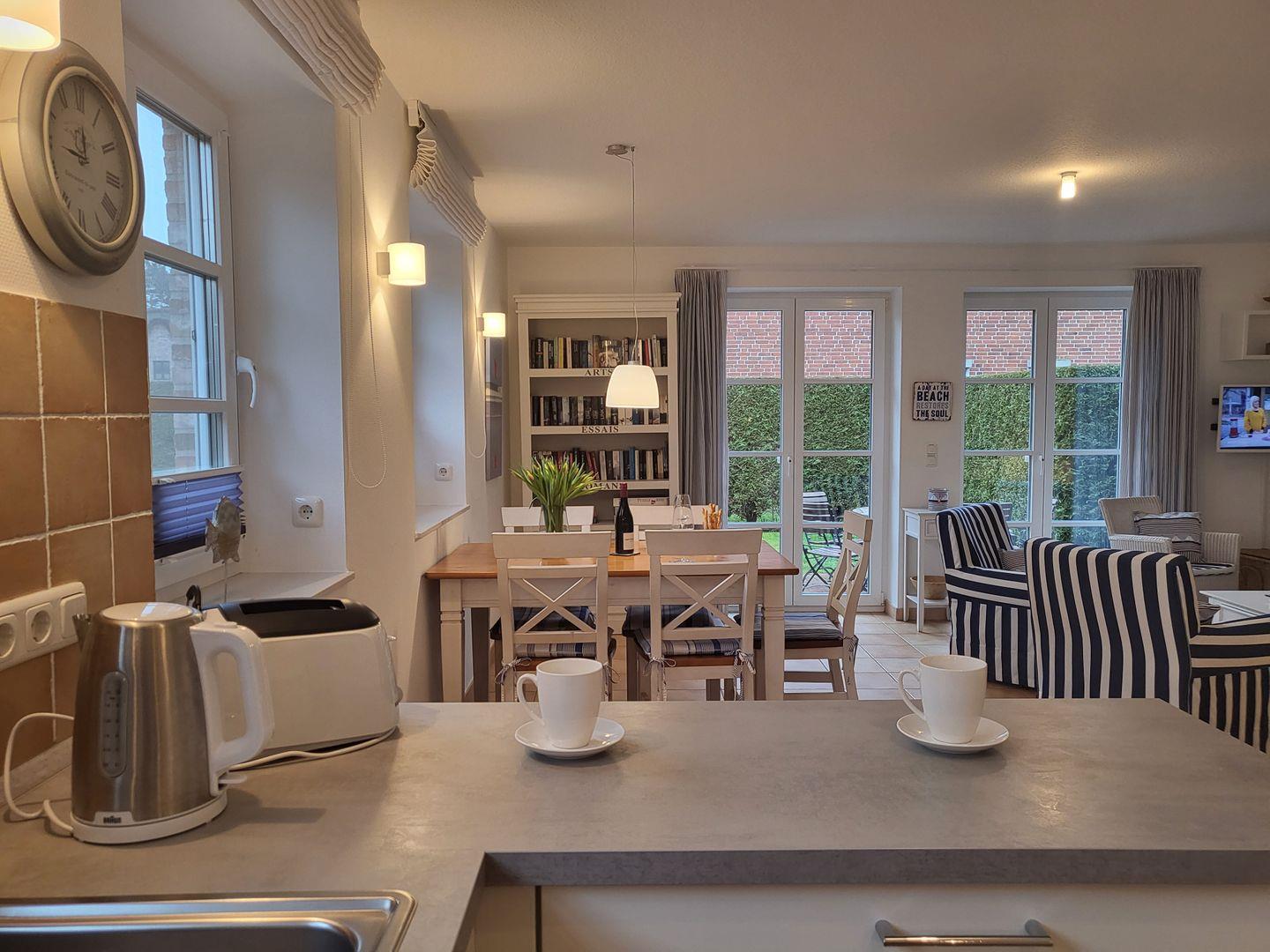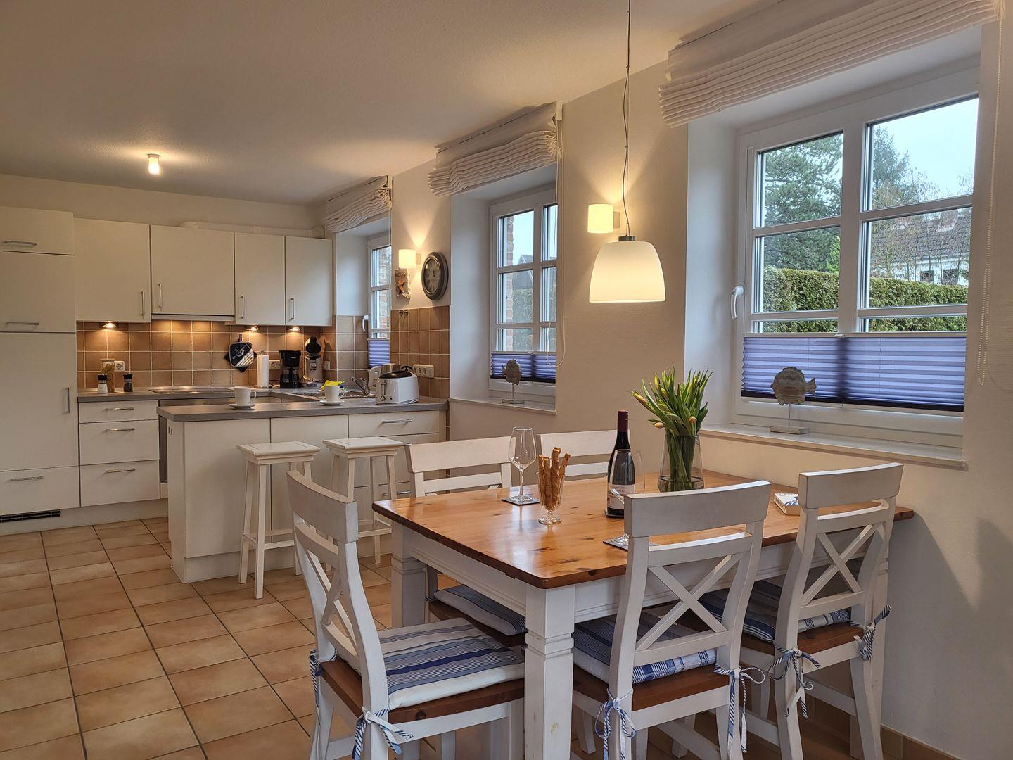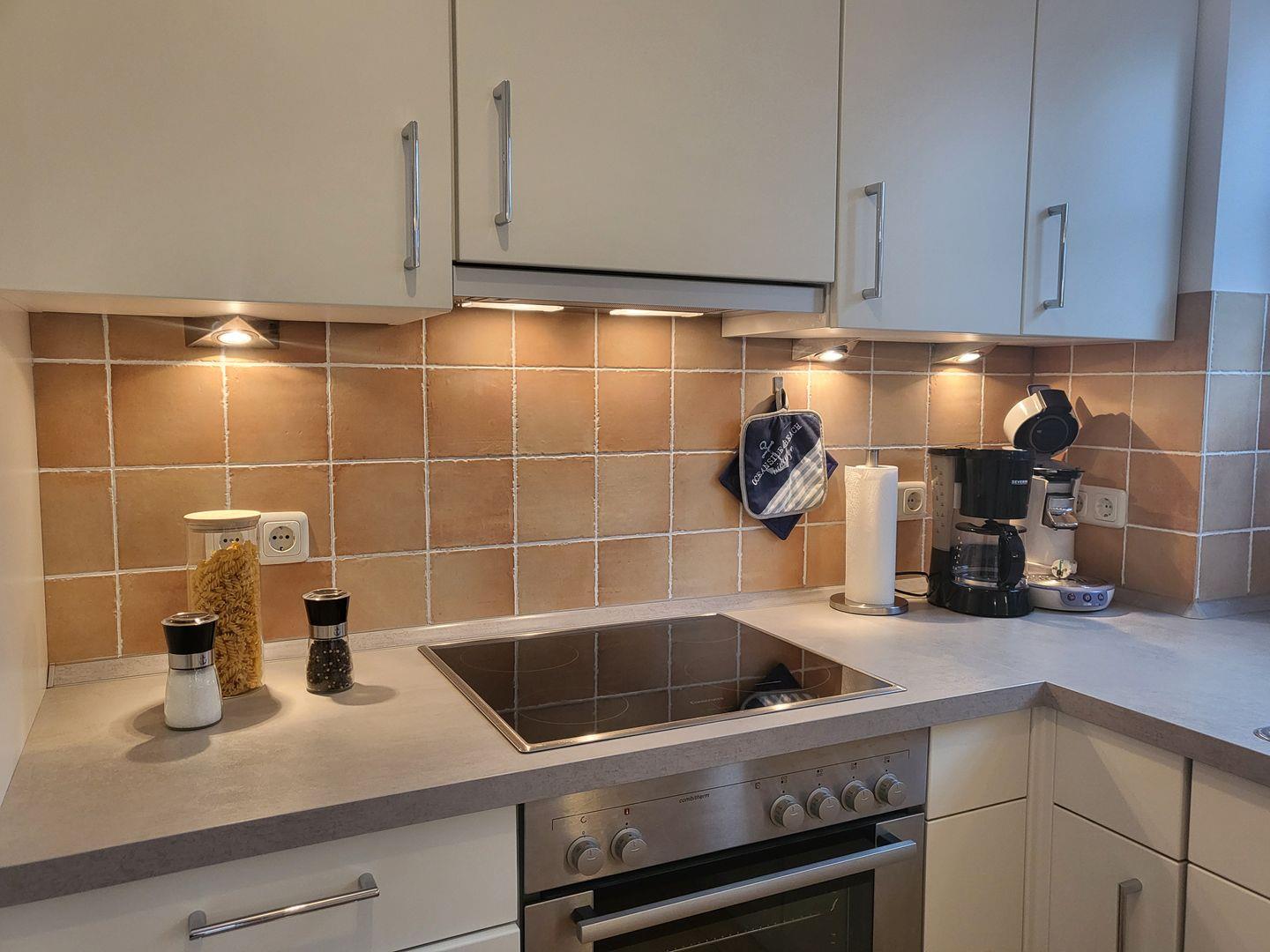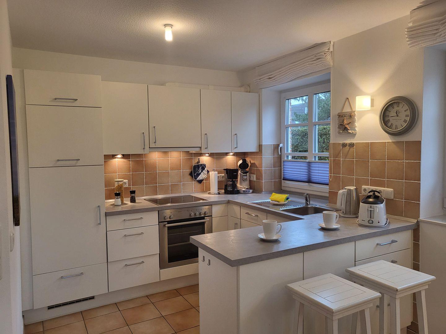 Zur sehr gut ausgestatteten Küche gehört hier unter anderem Cerankochfeld und Backofen, Kühlschrank sowie Kaffee- und Kaffee-Padmaschine und ein Geschirrspüler zur Ausstattung.