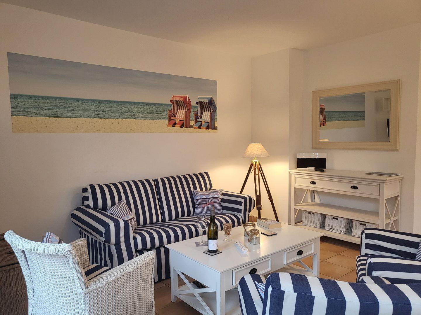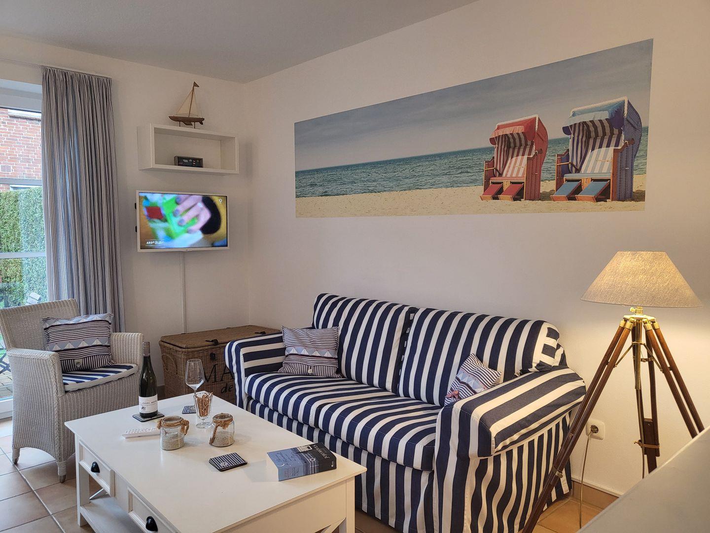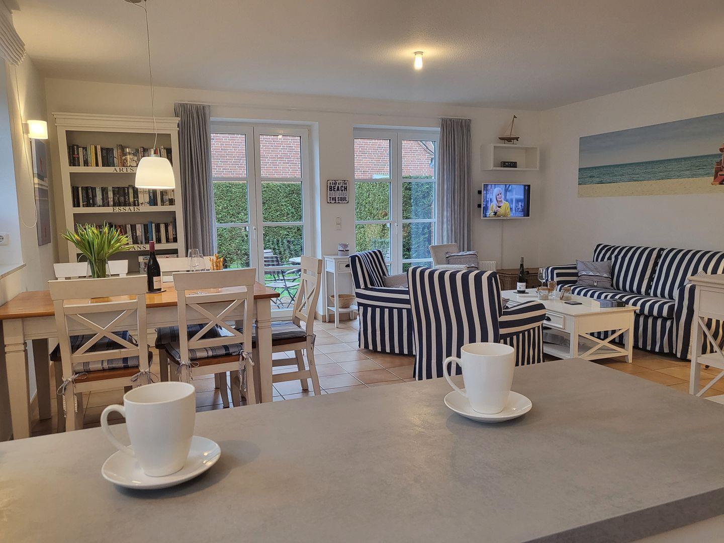 Durch den Übergang zur großen Terrasse wirkt das maritim und freundlich eingerichtete Wohnzimmer wunderbar hell und einladend. Hier gehört eine gemütliche Sitzgruppe aus Couch und Sesseln zur Ausstattung, für die multimediale Unterhaltung sorgen Flachbild-TV und kostenfreies W-LAN. Am Esstisch ist Platz für die ganze Familie, eine große Auswahl an Büchern steht zur Verfügung.