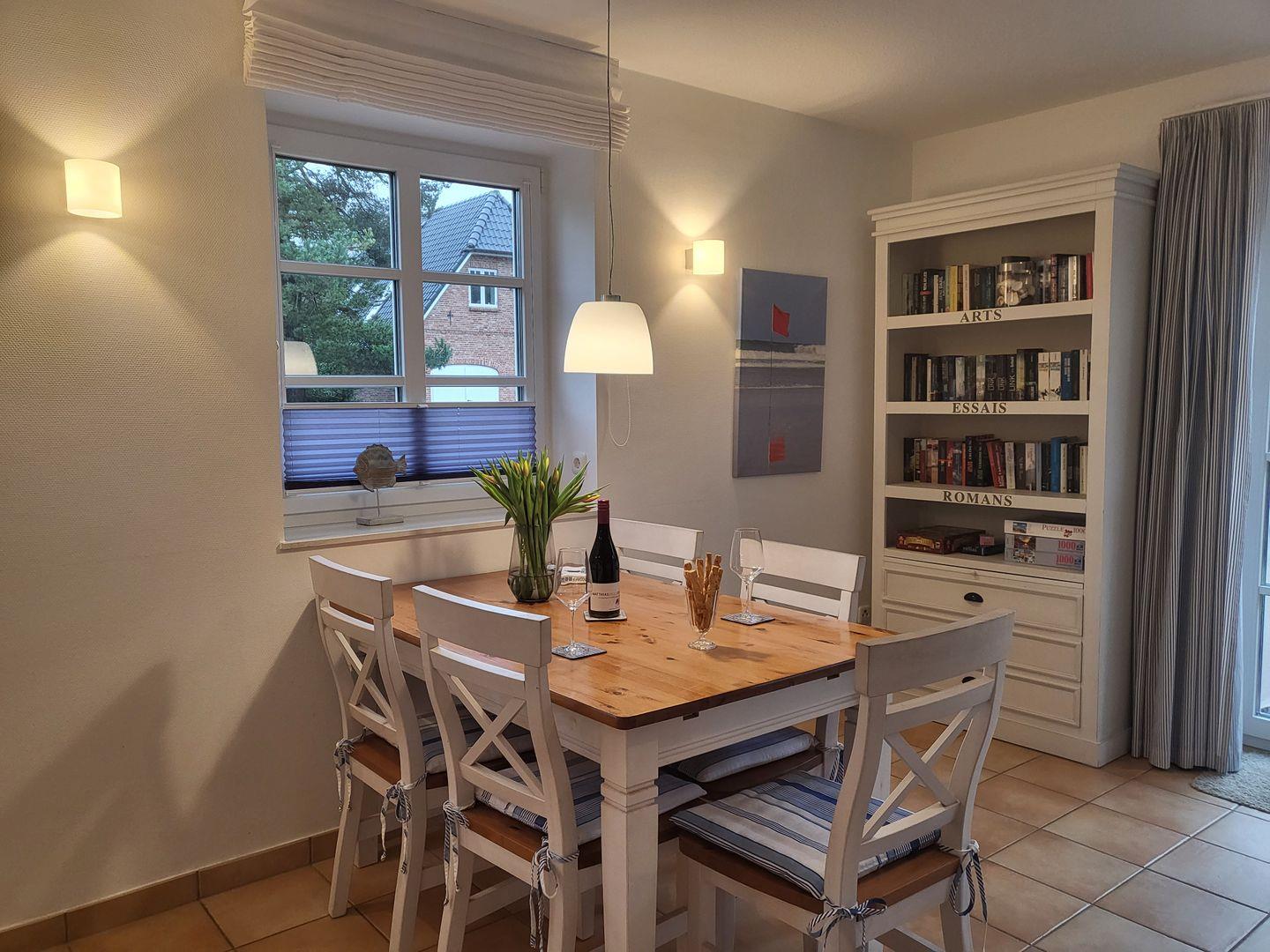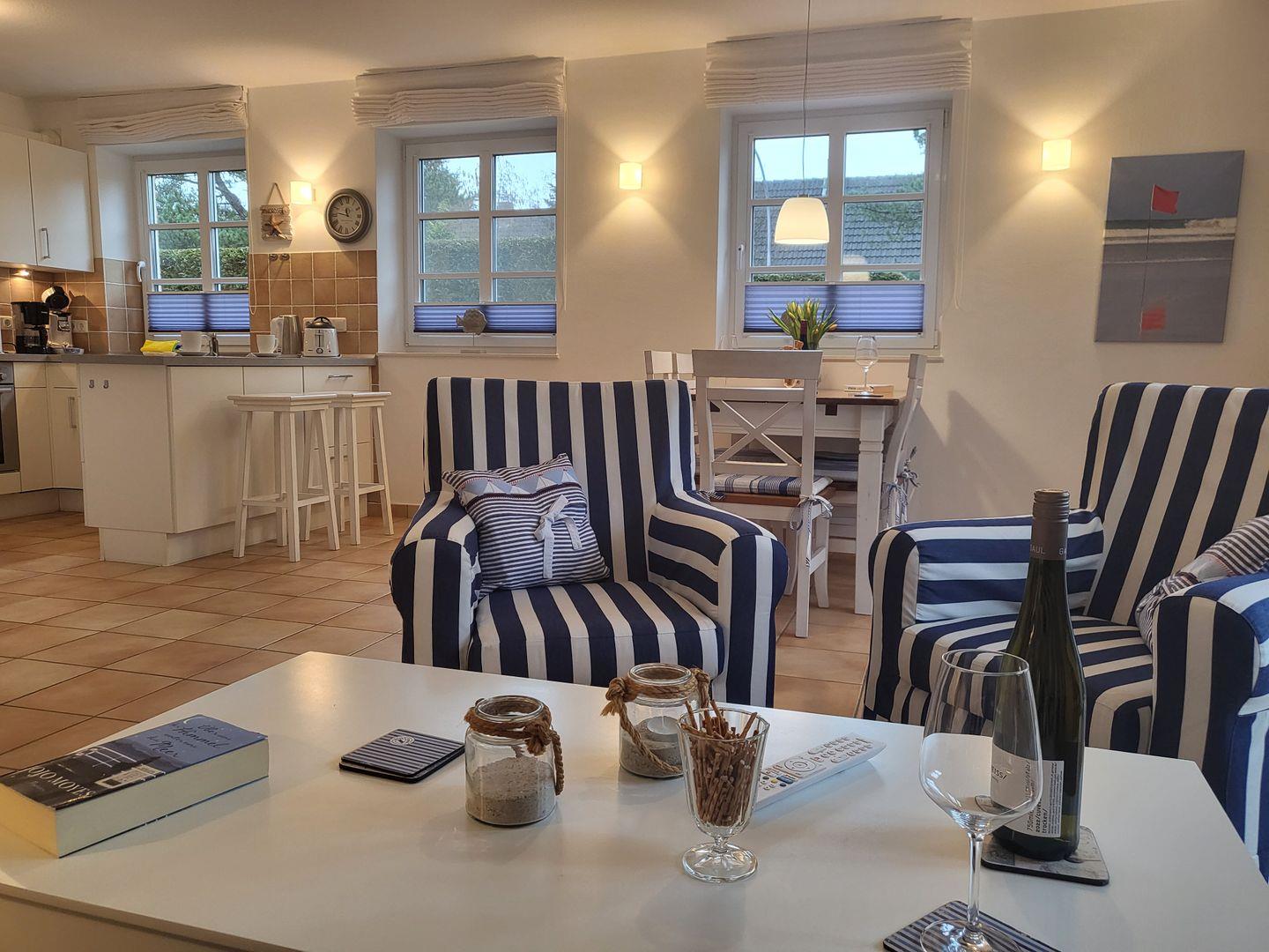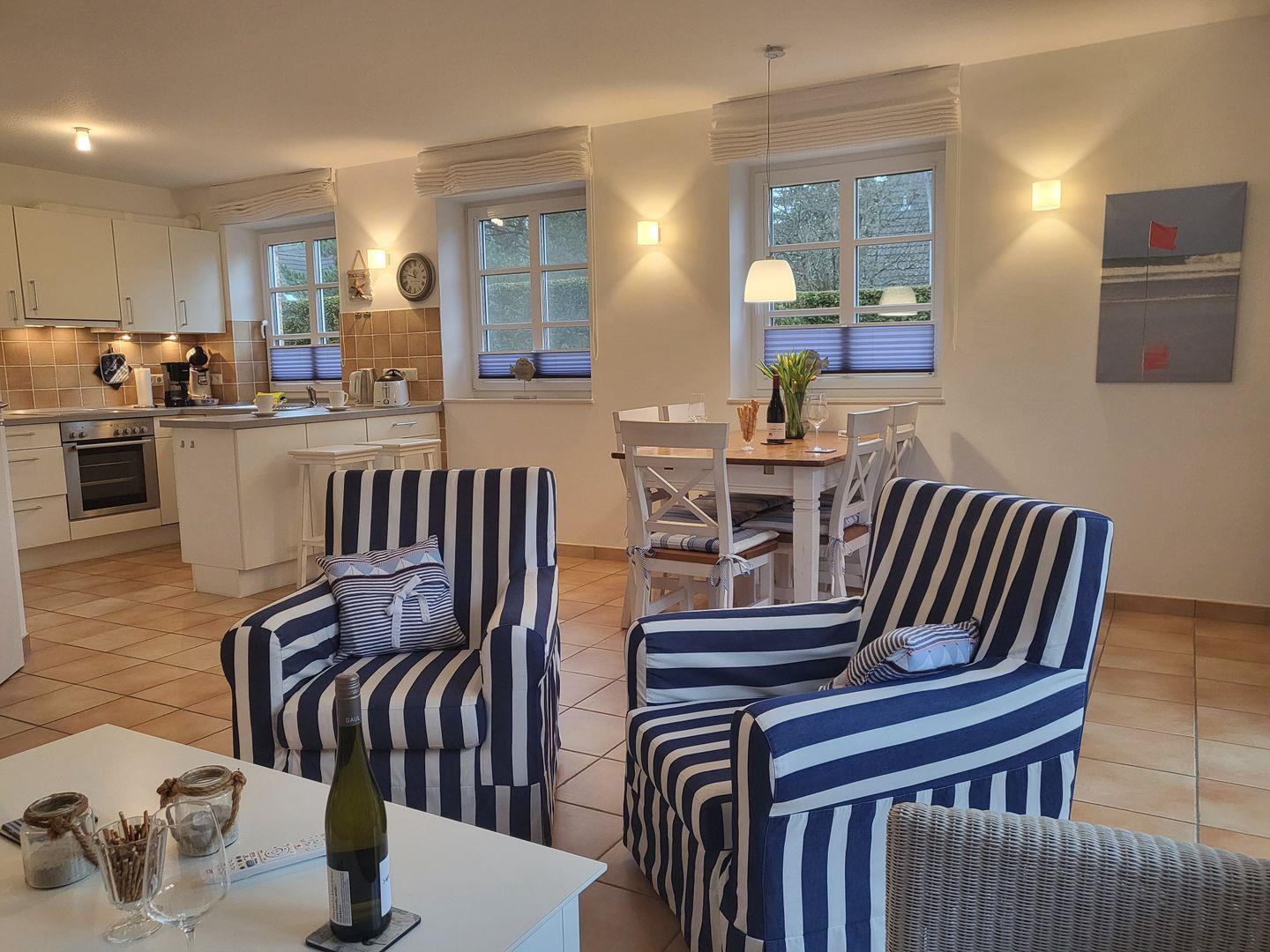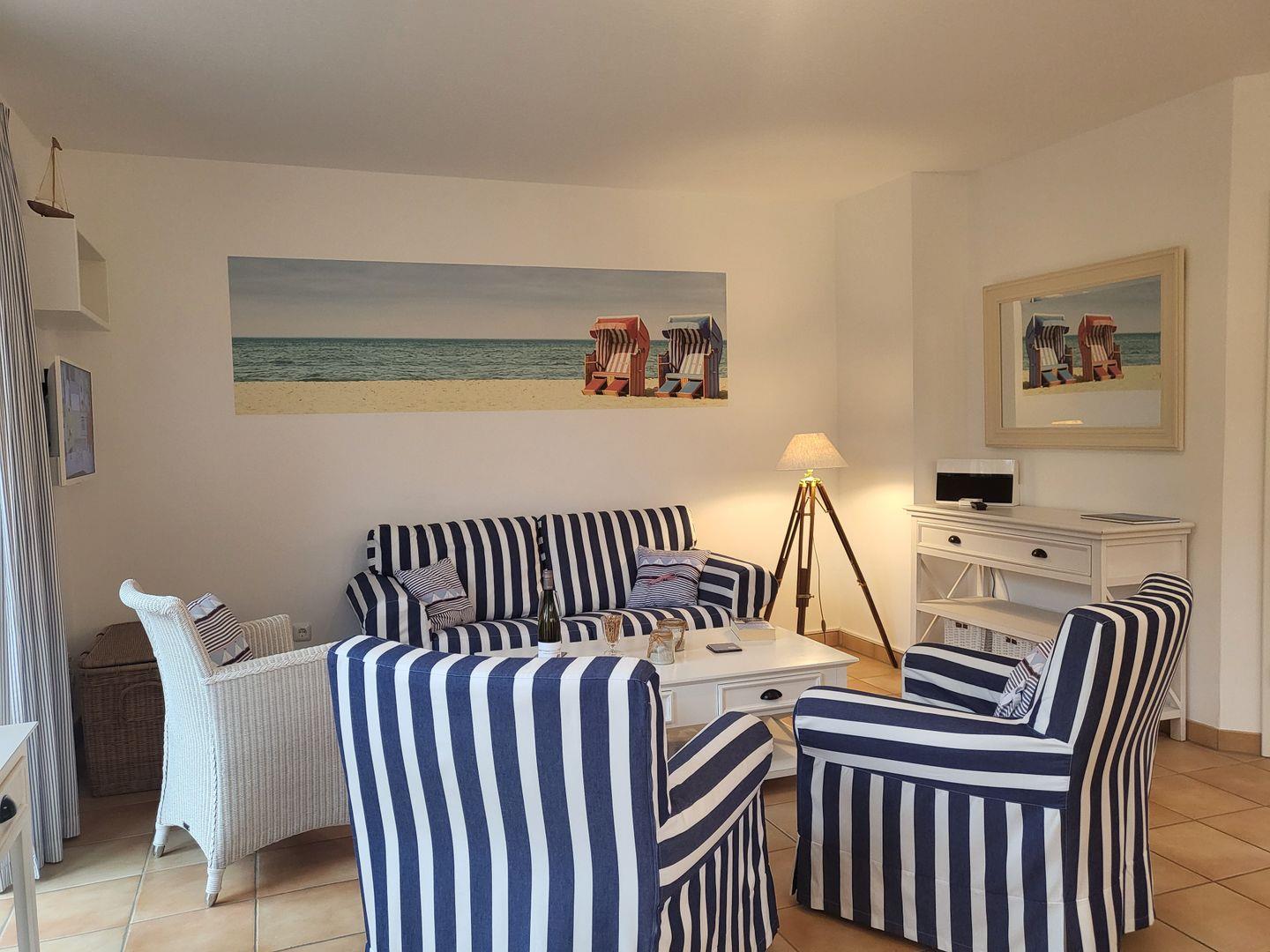 Durch den Übergang zur großen Terrasse wirkt das maritim und freundlich eingerichtete Wohnzimmer wunderbar hell und einladend. Hier gehört eine gemütliche Sitzgruppe aus Couch und Sesseln zur Ausstattung, für die multimediale Unterhaltung sorgen Flachbild-TV und kostenfreies W-LAN. Am Esstisch ist Platz für die ganze Familie, eine große Auswahl an Büchern steht zur Verfügung.