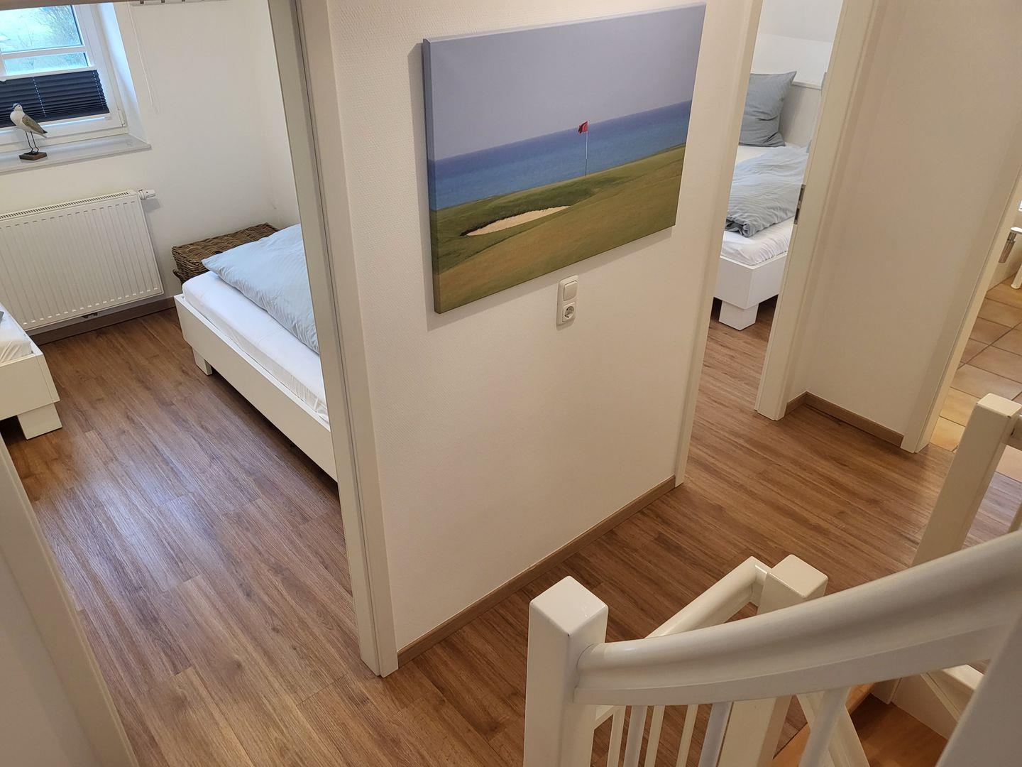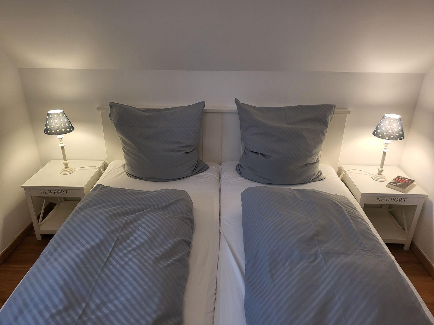 Im Obergeschoss stehen 2 Schlafzimmer zur Verfügung. Eines ist ausgestattet mit komfortablem 180x200cm Doppelbett, das zweite mit zwei Einzelbetten.