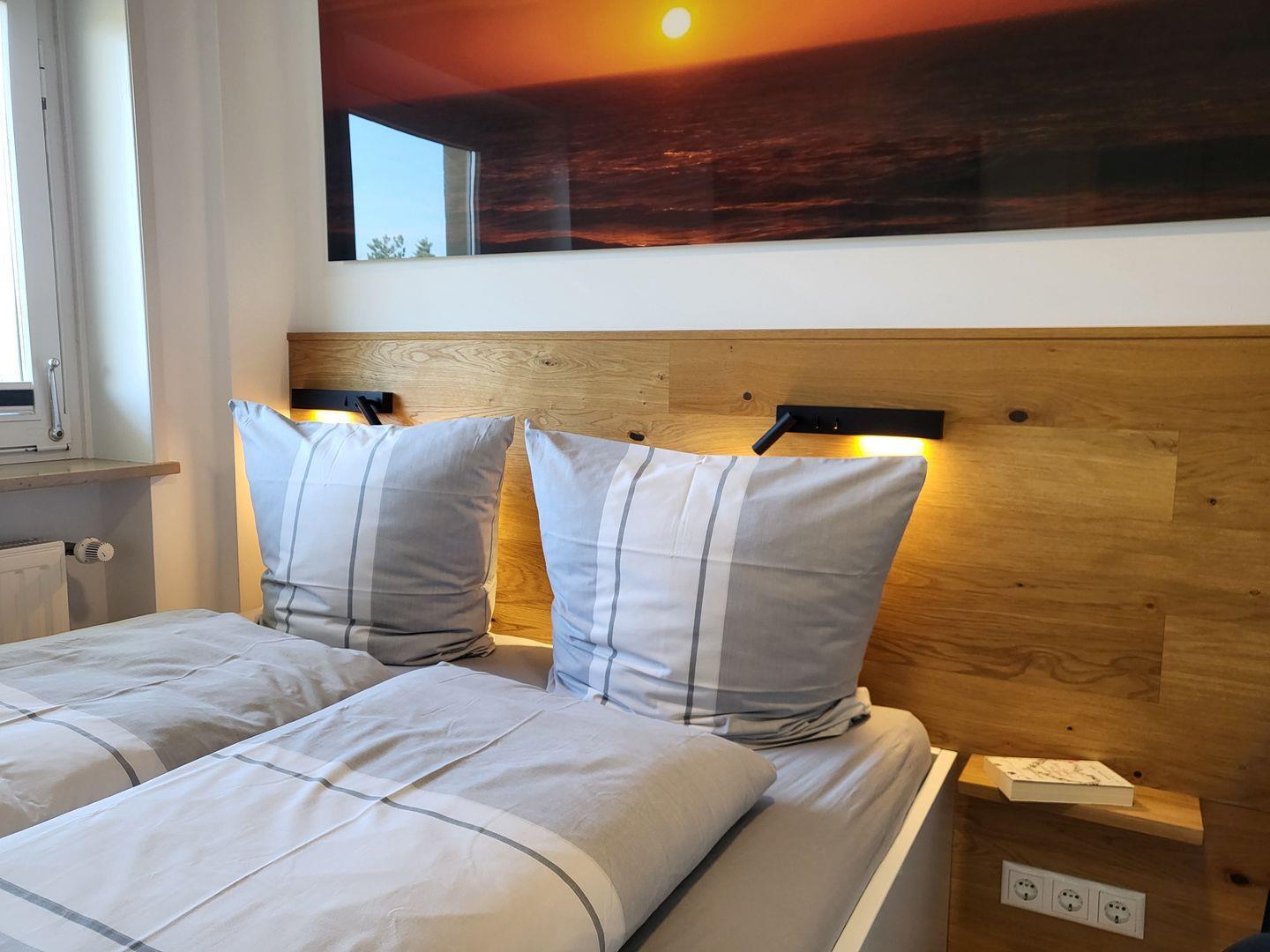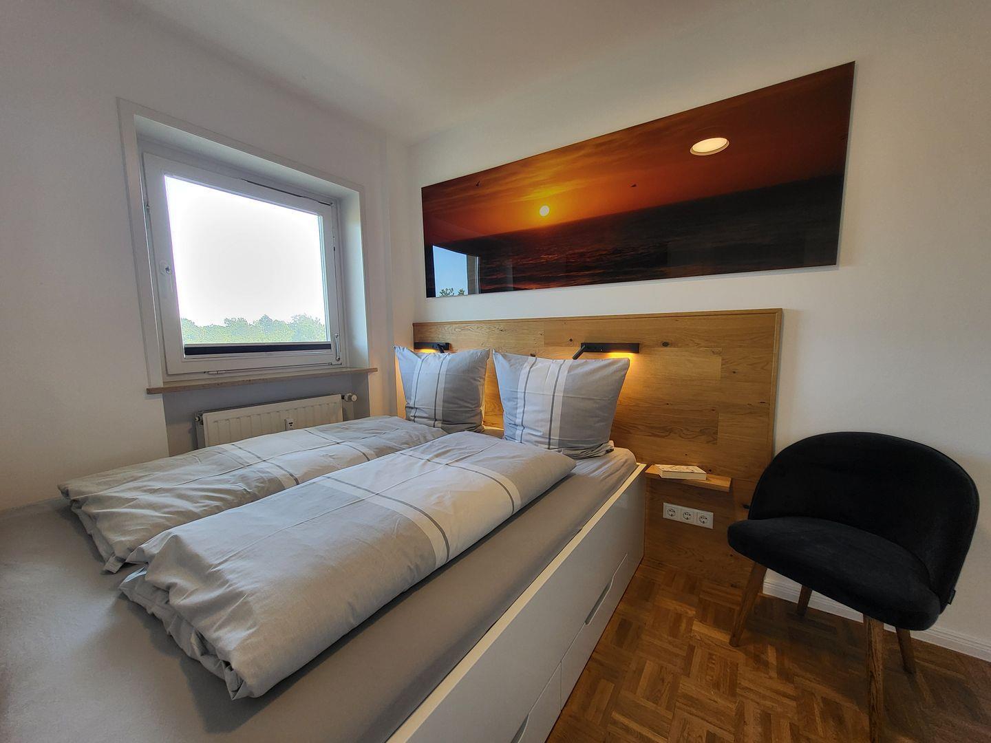 Eine Mikrowelle ist als Funktion im Ofen gegeben. Im separaten Schlafzimmer steht ein 180x200xm Doppelbett mit einseitigem Einstieg bereit, eine moderne Kommode sorgt für zusätzlichen Stauraum und ein Smart-TV ist ebenfalls vorhanden..