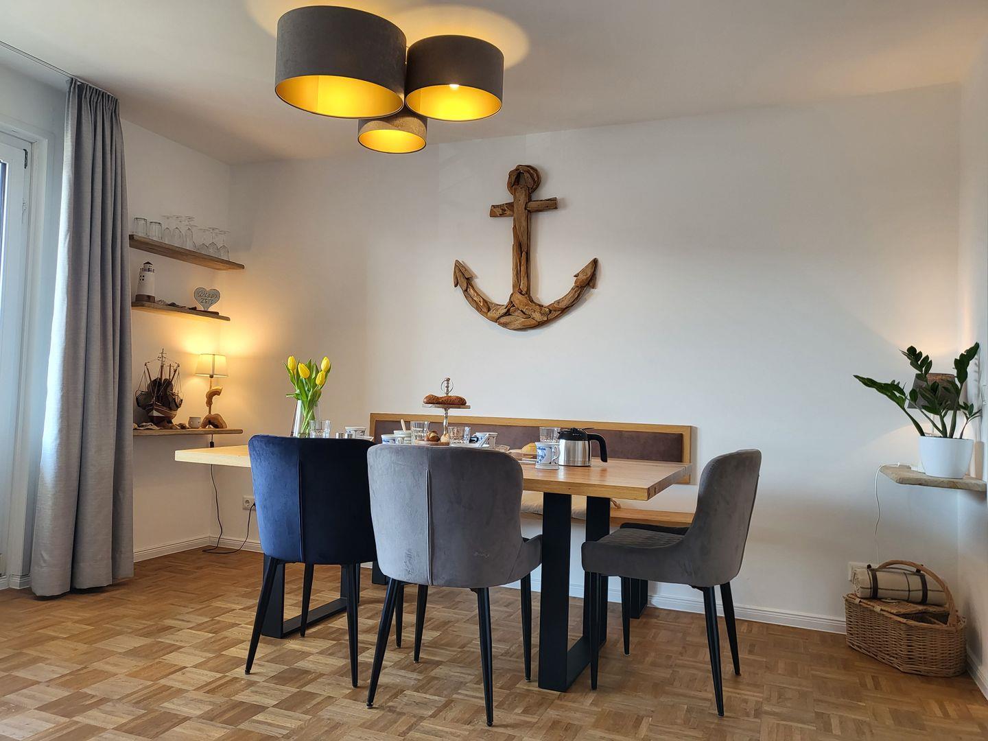 Kunstvoll verarbeitetes Treibholz, elegant drapierte Muscheln und andere Eindrücke aus der Region Nordfriesland liefern ein wunderbares Nordseefeeling. Ein einladender Essbereich sowie ein großer Flachbild-TV mit DVD- und Blu-Ray-Player, Playstation und Sky (Sport- und Entertainment) und DAZN (Sportkanal) sorgen für viele schöne, gemeinsame Stunden, eine Auswahl an Büchern und Spielen eröffnet zusätzliche Möglichkeiten der Freizeitgestaltung. Das komfortable Sofa lässt sich mit wenigen Handgriffen zur gemütlichen Schlafcouch mit Federkernmatratze umwandeln. Angrenzend an den Wohnraum befindet sich die kompakte, offene Küche des Apartments.
