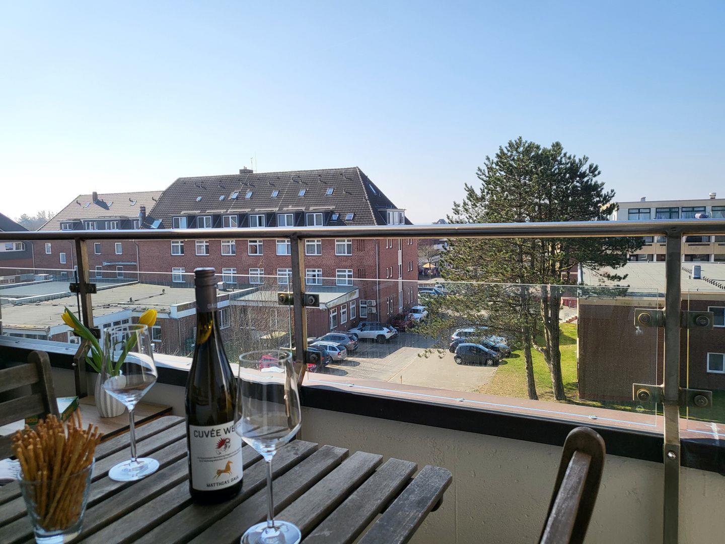 Durch die große Fensterfront und den Übergang zum Balkon wirkt das maritim und modern eingerichtete Wohnzimmer wunderbar hell und einladend. Eine neue Markise (aus 2021) ist auf dem Balkon vorhanden.