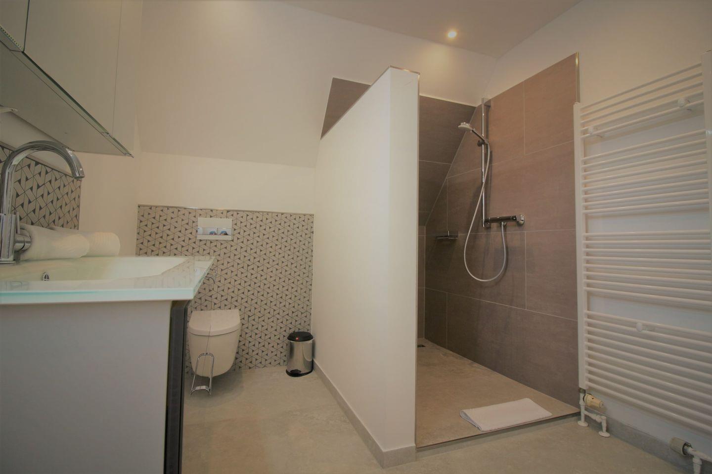 Duschbad mit WC, Fenster und Fussbodenheizung.