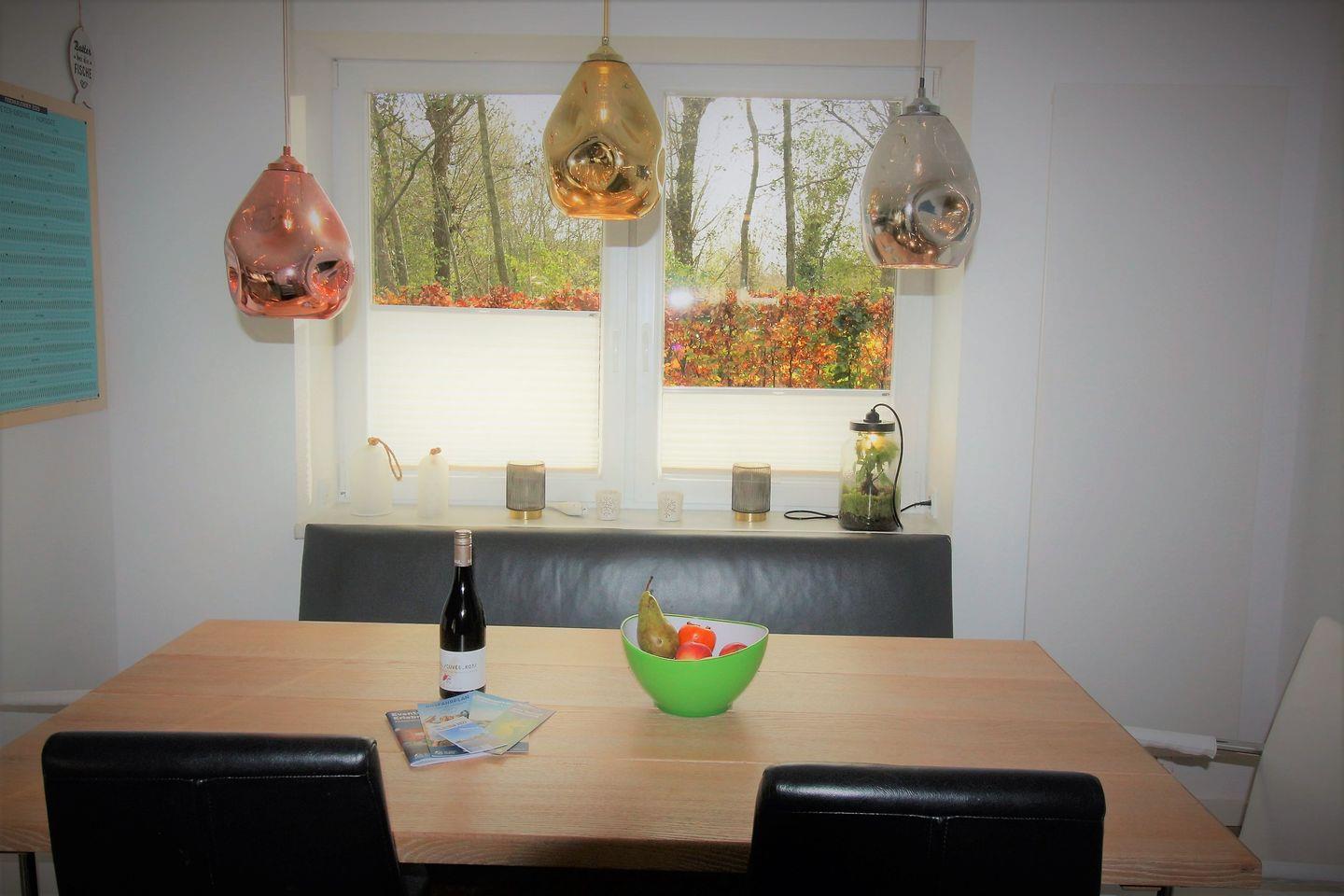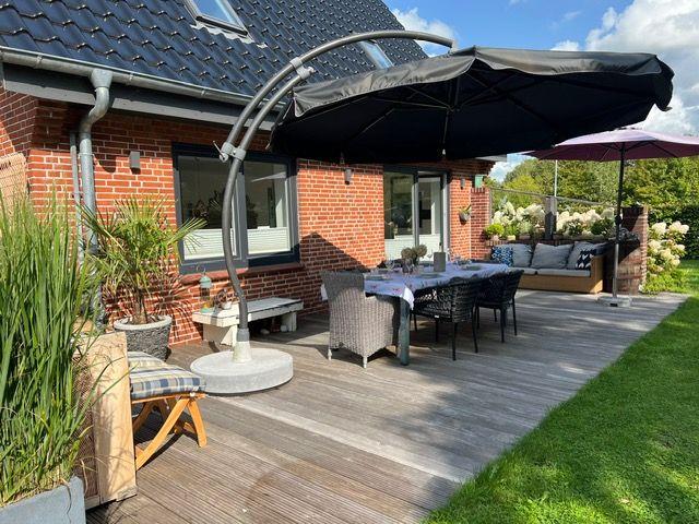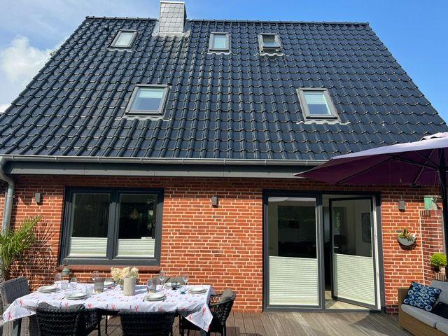 Einfamilienhaus mit Garten und schöner Terrasse, Aussen-Warmwasserdusche, EG: Flur, Gäste-WC, separate Küche, großes Esszimmer mit Tisch, Bank und Stühlen und Sofa, Kaminofen, Wohnzimmer mit Sofa und TV,1.OG 3 Schlafzimmer, Duschbad mit WC, Dachgeschoß: 1 Schlafzimmer mit TV, Aufenthaltsrqaum mit Sofa, Nichtraucherhaus, keine Tierhaltung erlaubt, WLAN, Waschmaschine u.Trockner