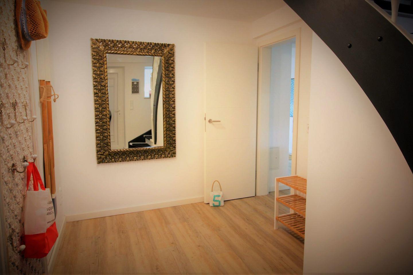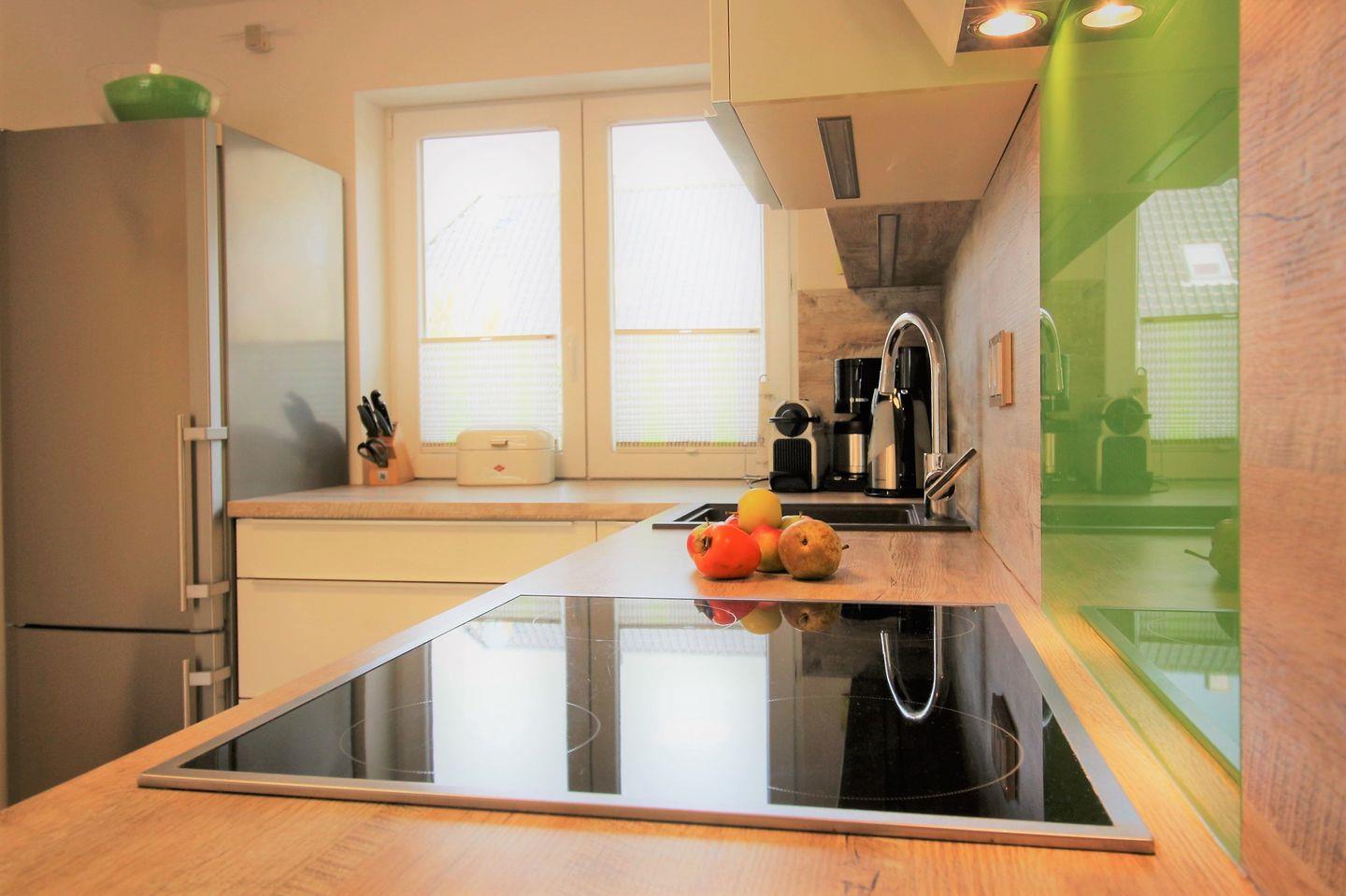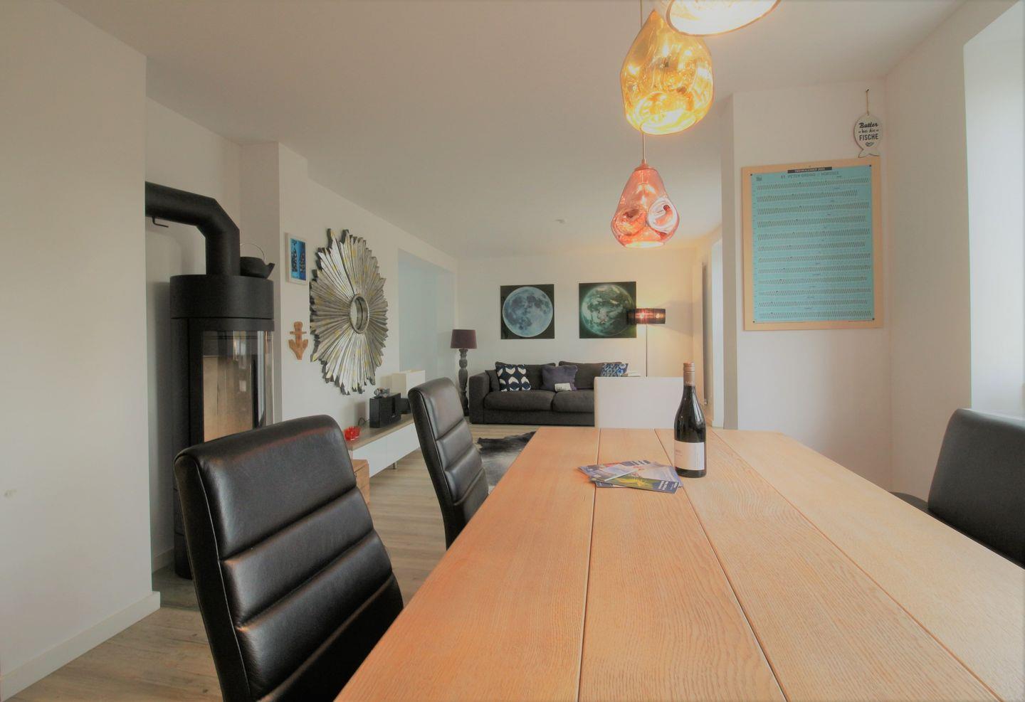 Im Erdgeschoß gibt es einen Flur mit Garderobe, Gäste-WC, eine schöne und gut ausgestattete Küche mit Zugang zum großzügigen Ess-Wohnbereich mit Kaminofen.