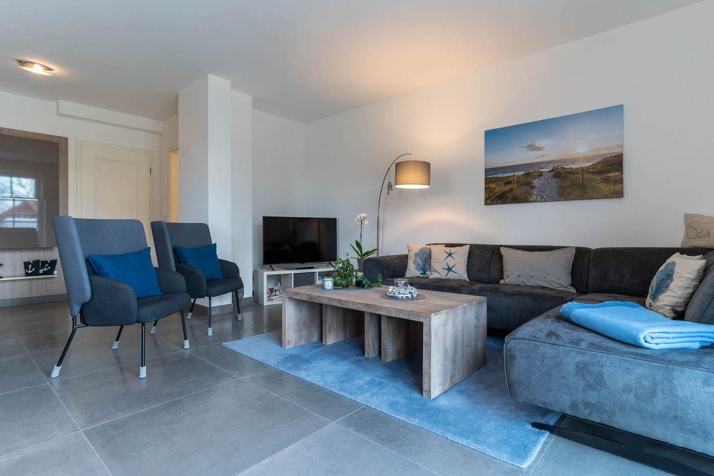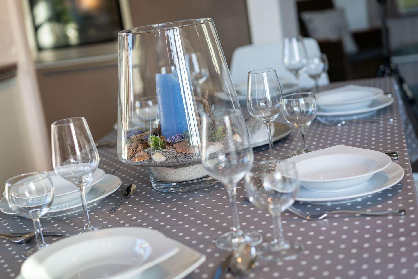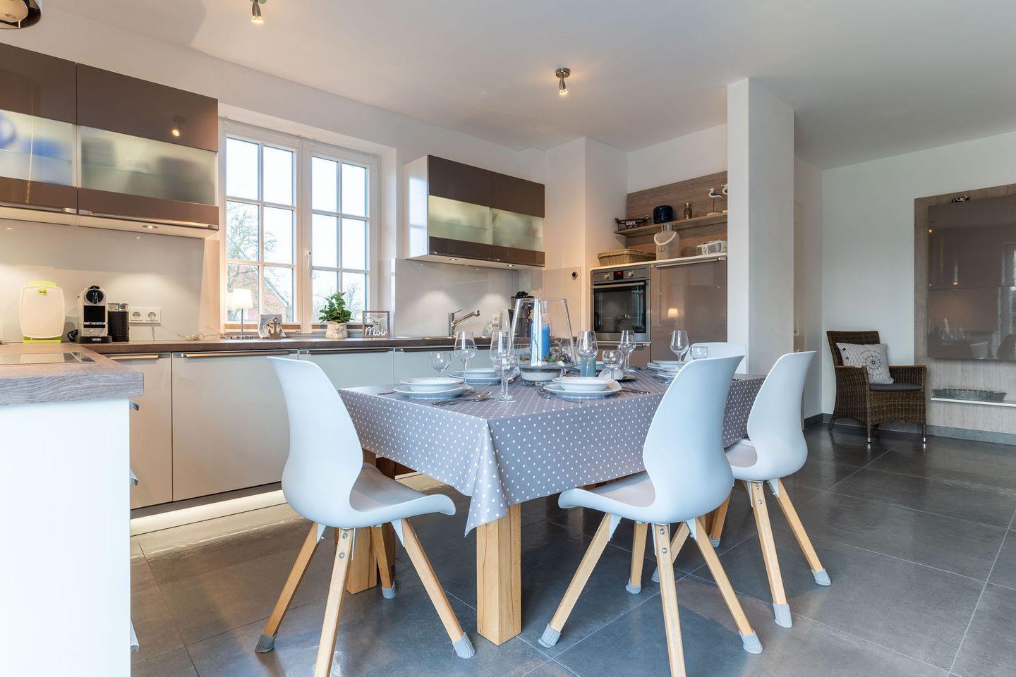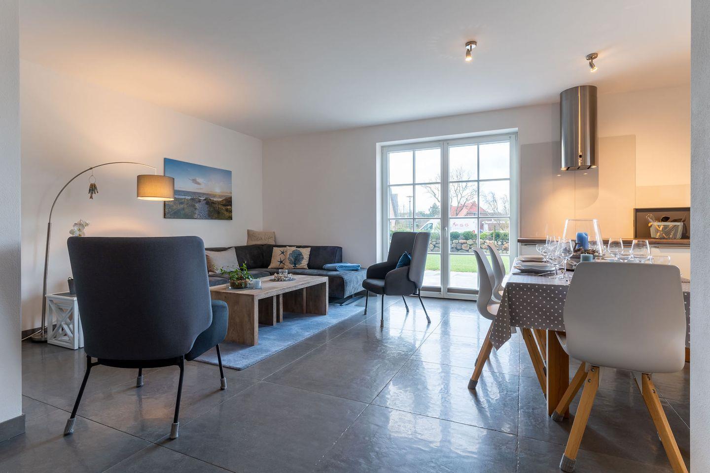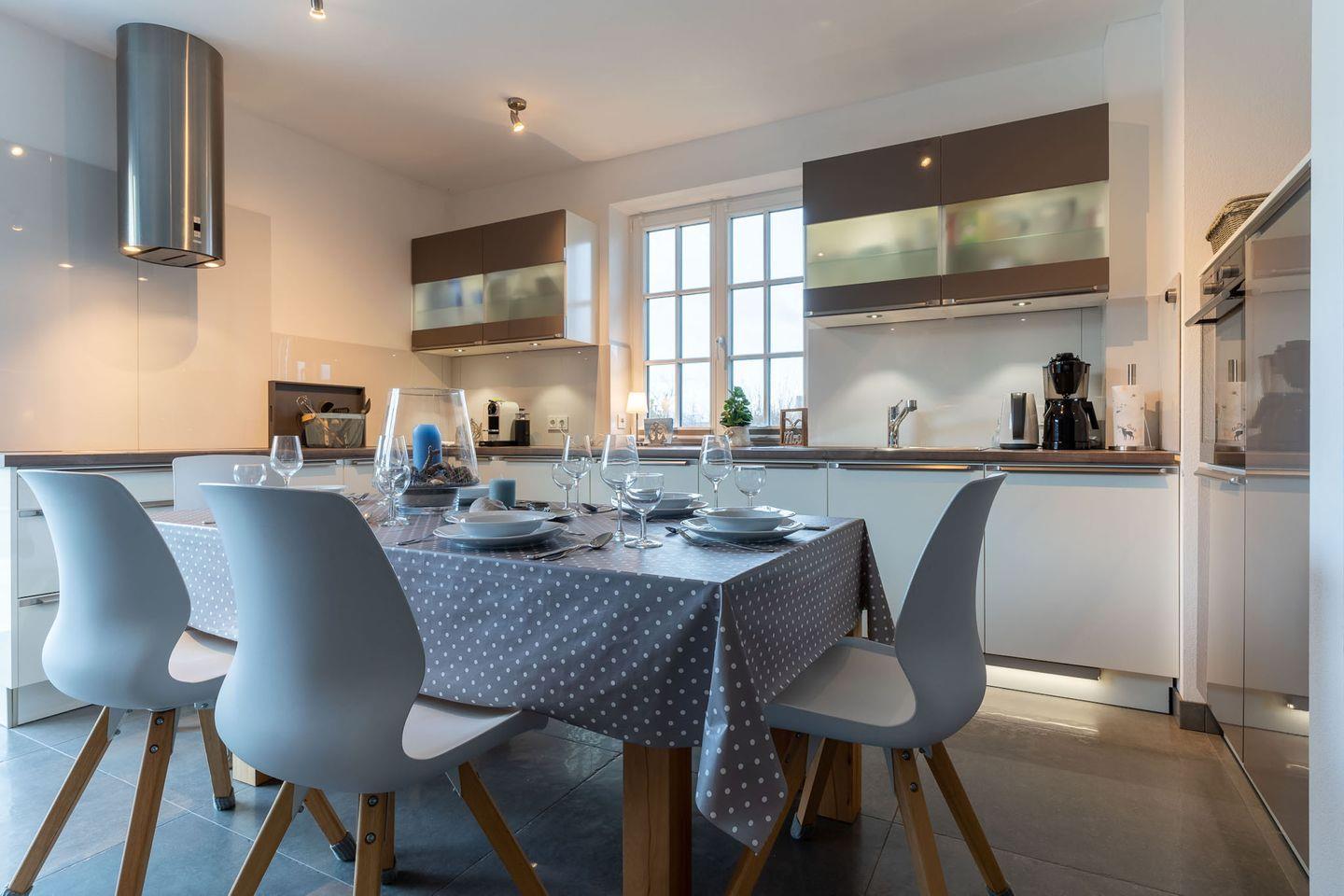 Im Erdgeschoss befindet sich der lichtdurchflutete Wohnraum mit TV, einem Bluetoothspeaker, einer offenen Küche sowie einem stilvollen Essbereich. Die Wohnräume sind mit exklusiven Möbeln ausgestattet.