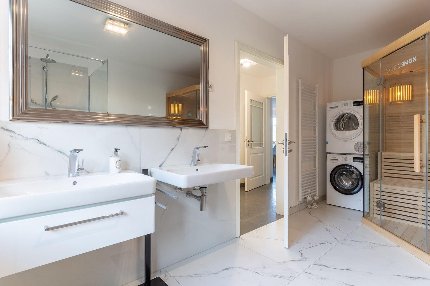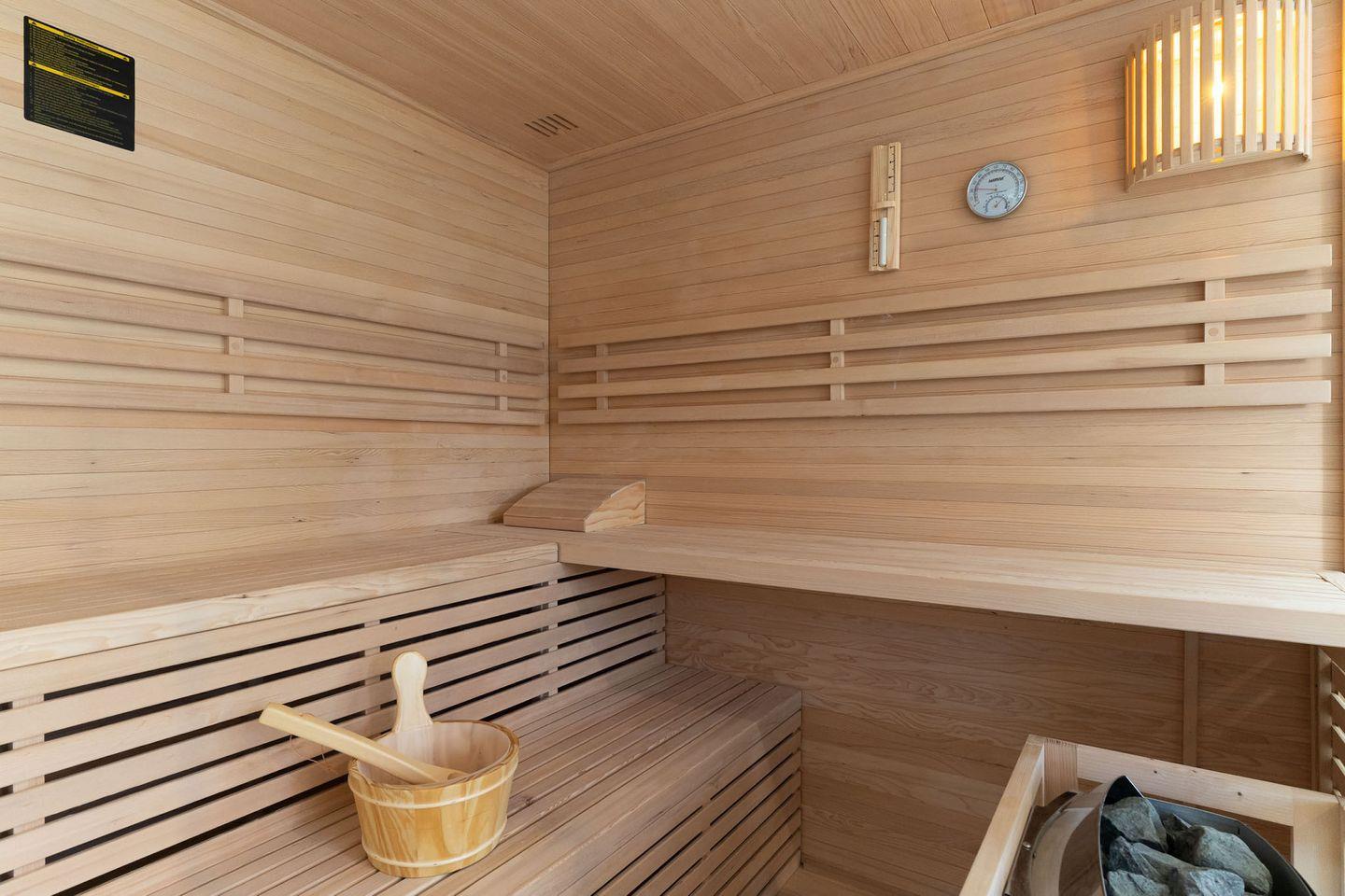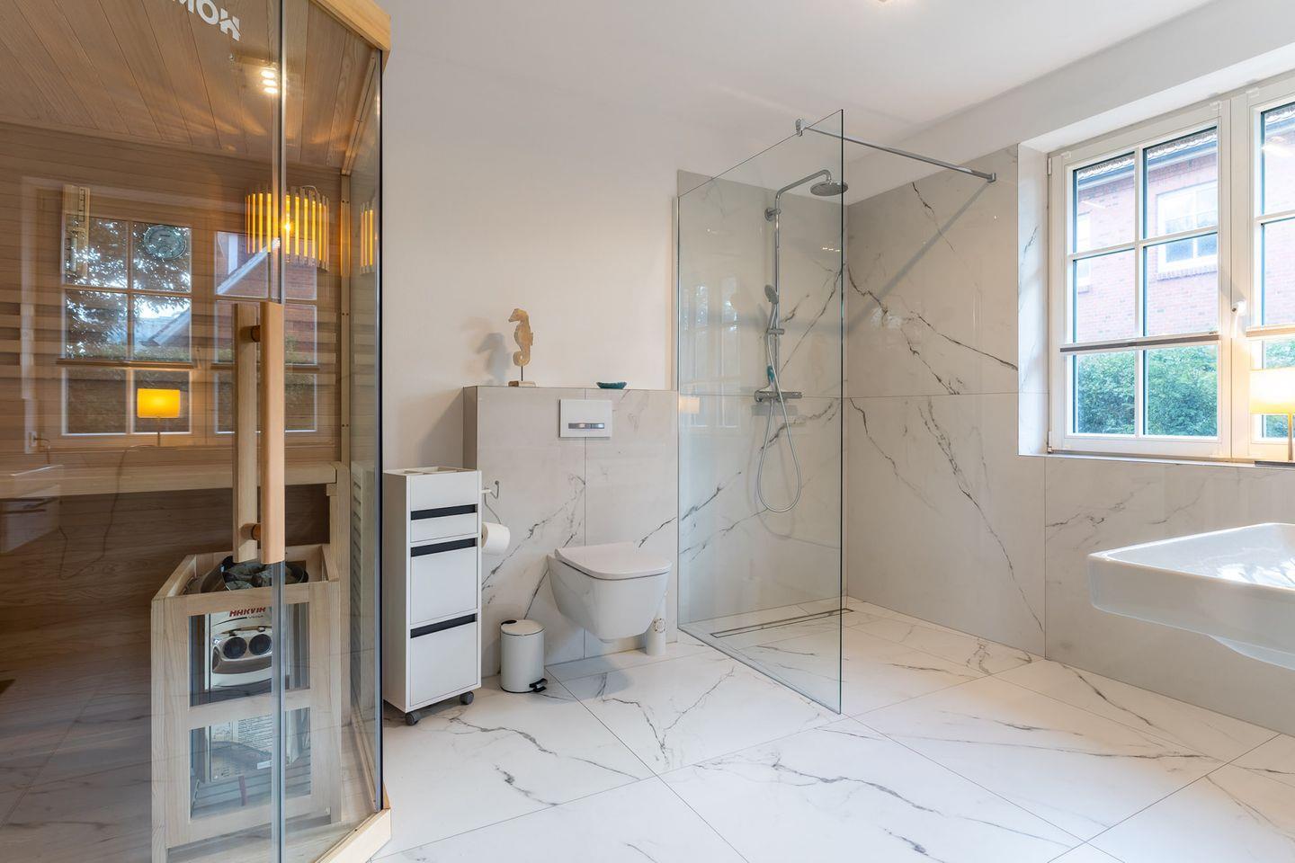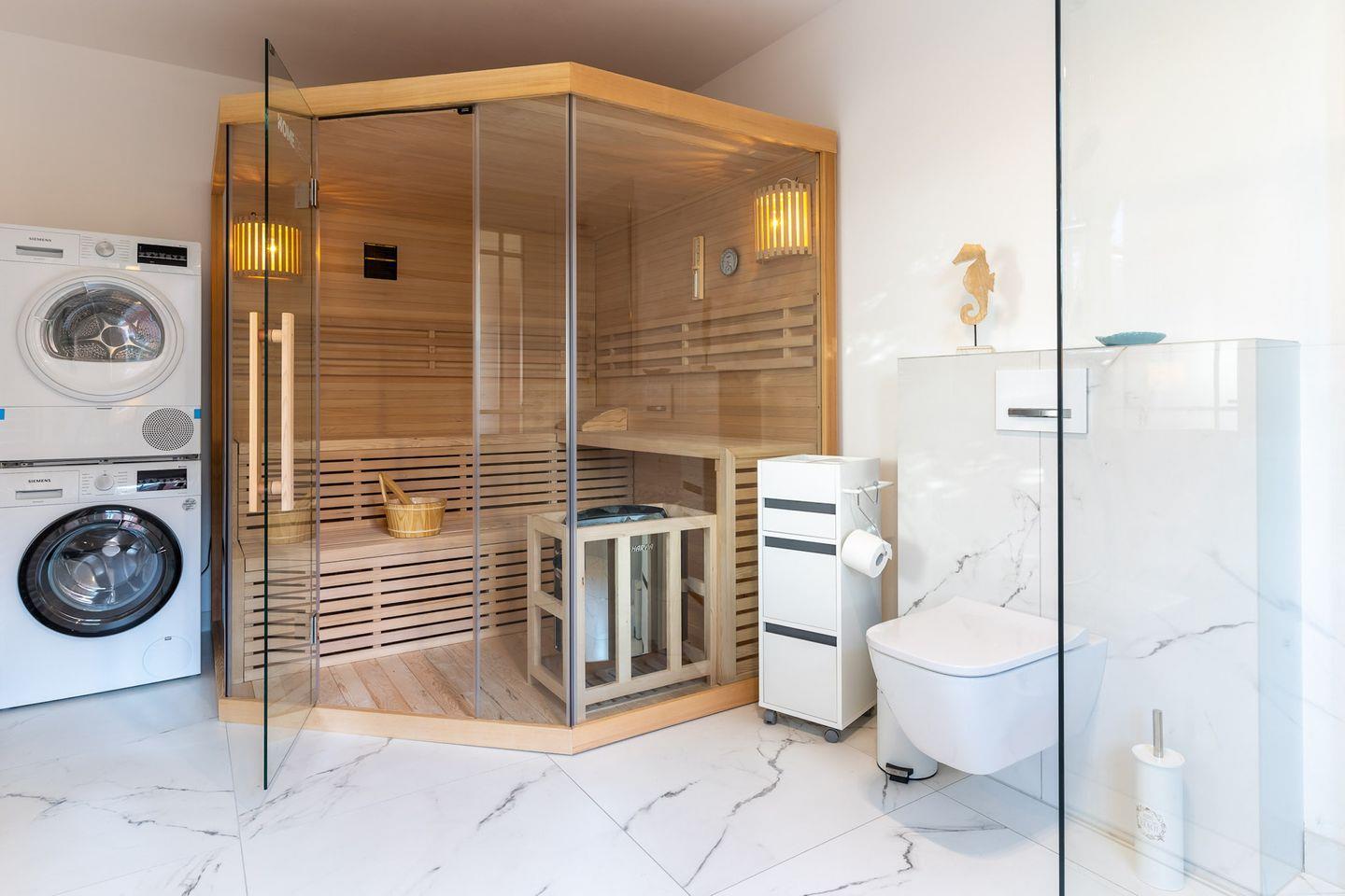 Für eine angenehme Auszeit sorgt das großzügige Badezimmer mit einer Sauna.