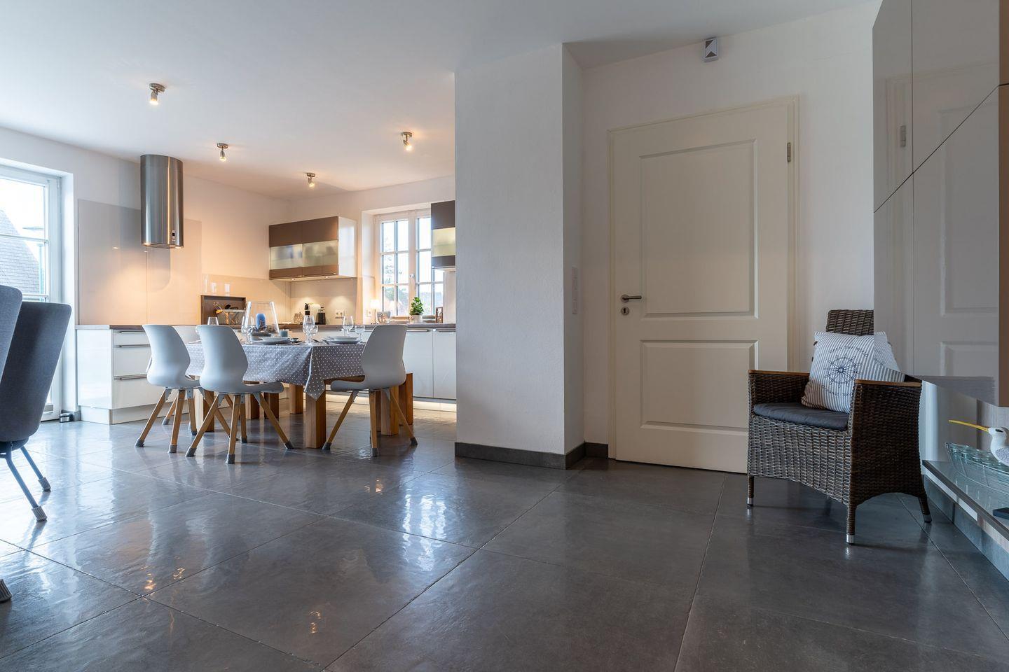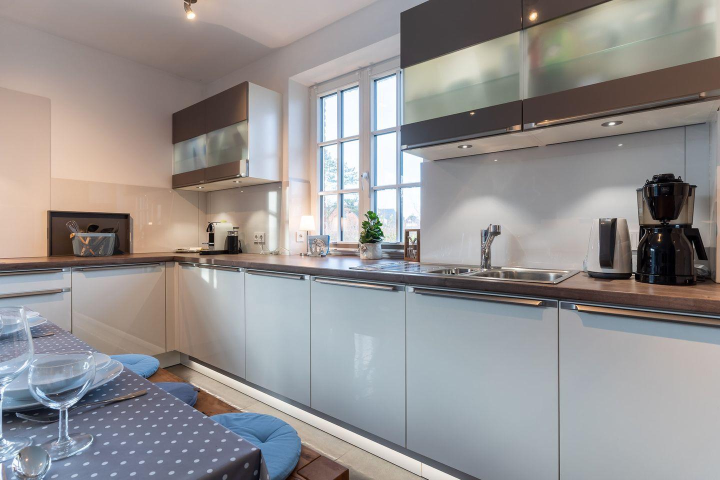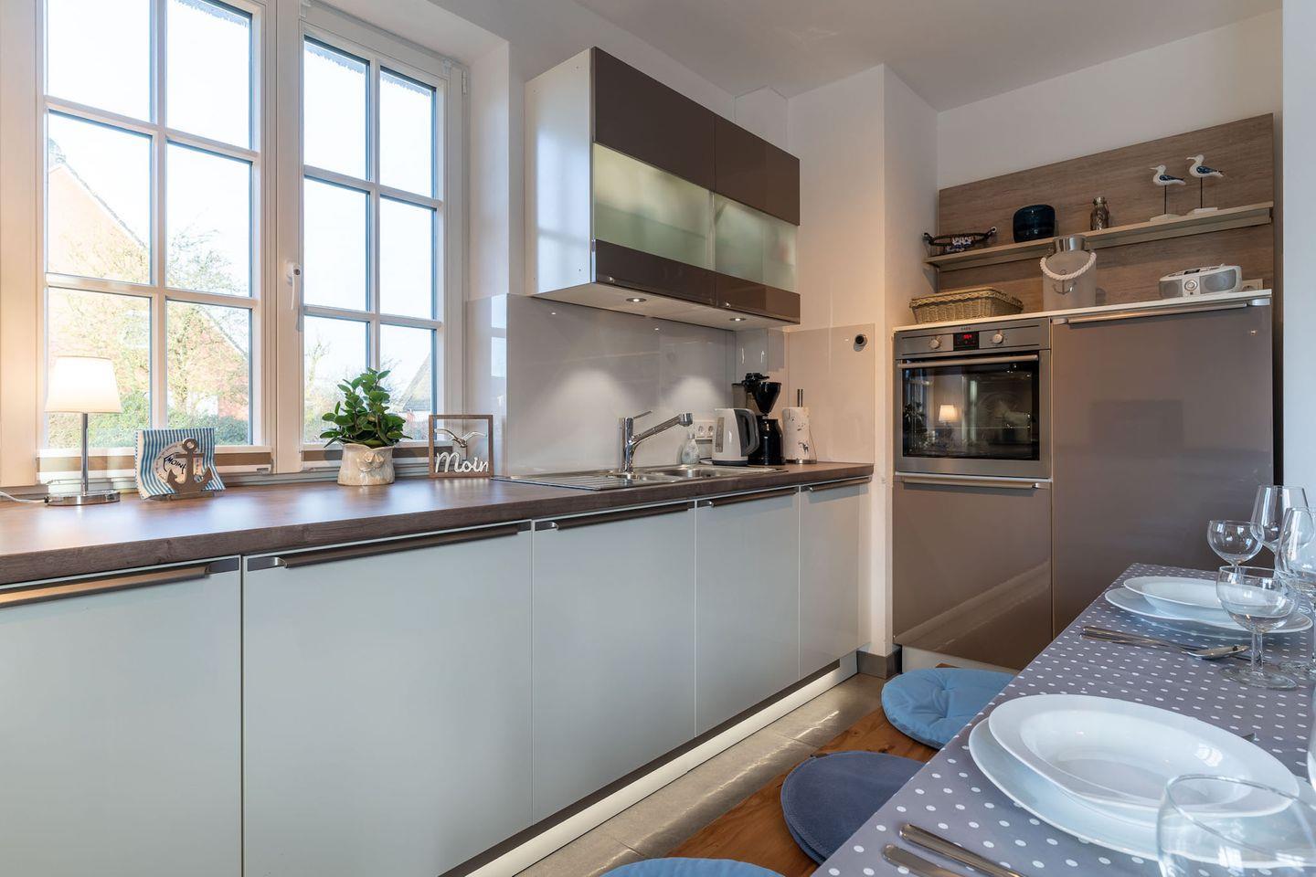 Die Küche verfügt über hochwertige Elektrogeräte und genügend Platz zum gemeinsamen Kochen. An den Wohnbereich schließen sich ein Flur, ein Gäste-WC und ein Doppelschlafzimmer an.