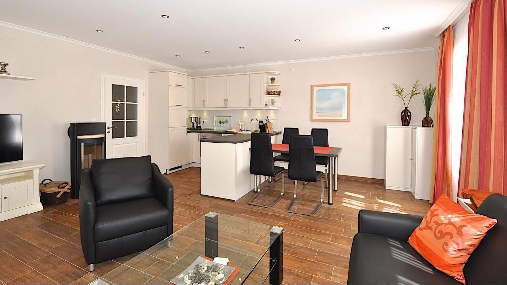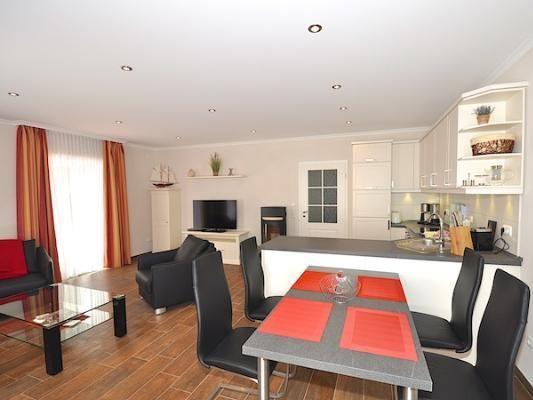 Das Appartement ist mit einer Fußbodenheizung ausgestattet und auf der Terrasse in Westausrichtung finden Sie Gartenmöbel und einen Strandkorb.