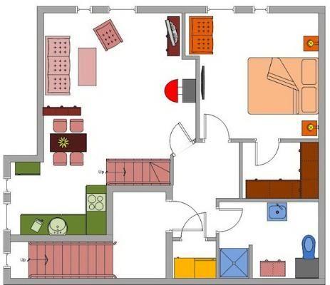 Obergeschoss: Eingangsbereich, Wohnraum mit integrierter Küche, Essbereich und Kamin, ein Schlafzimmer mit Doppelbett (180 x 200 cm - Einzelmatratzen) und begehbarem Kleiderschrank, ein Duschbad / WC