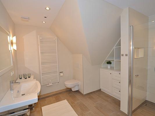 Dachgeschoss: ein Schlafzimmer mit 2 Einzelbetten (je 90 x 200 cm), ein Duschbad / WC mit Sauna.