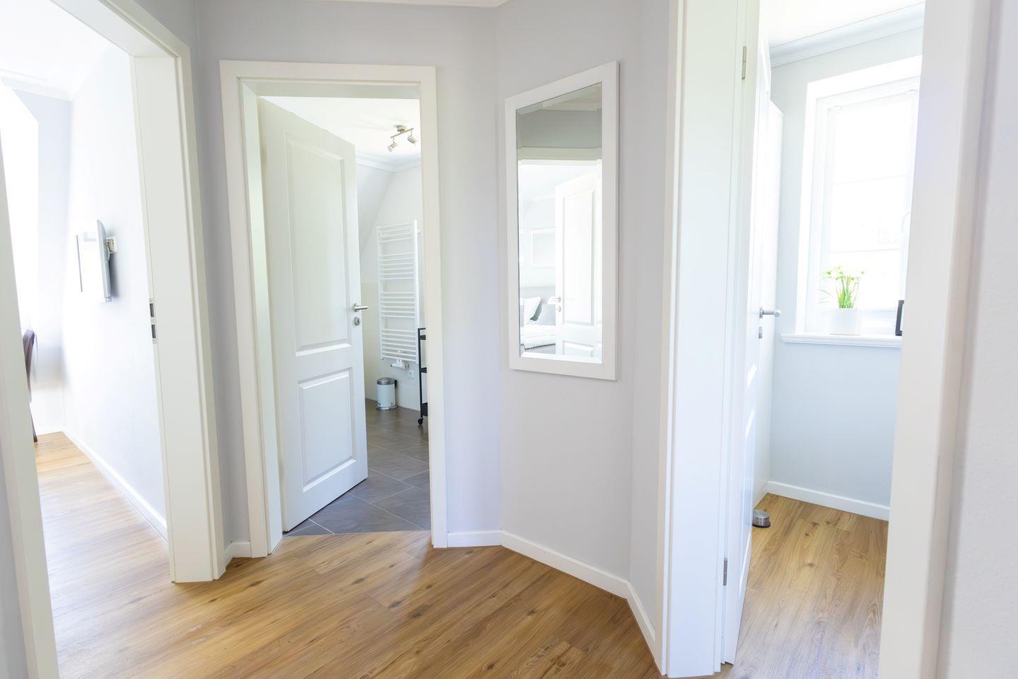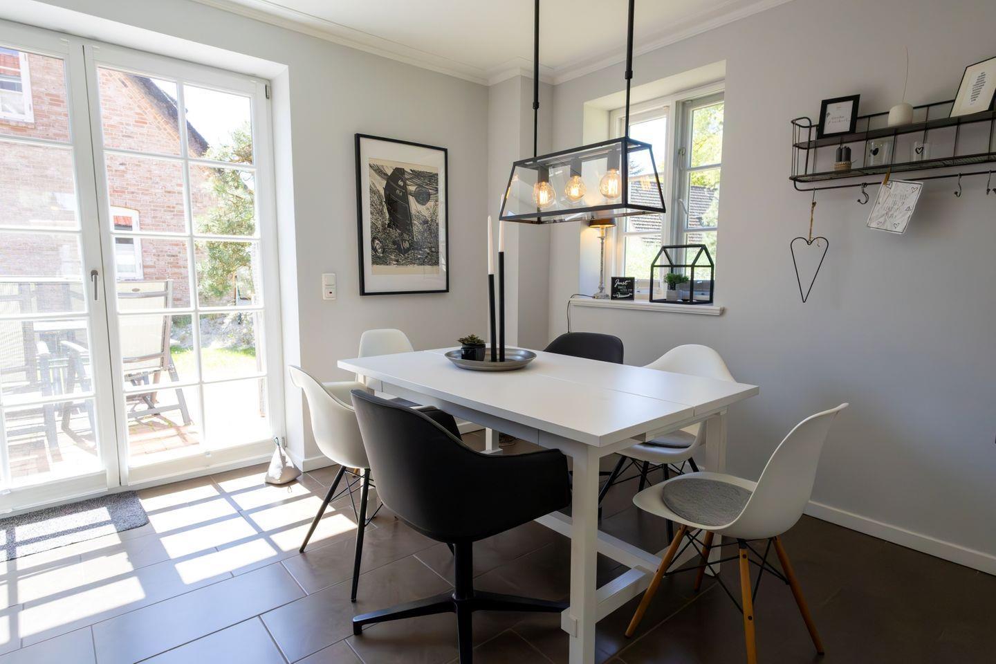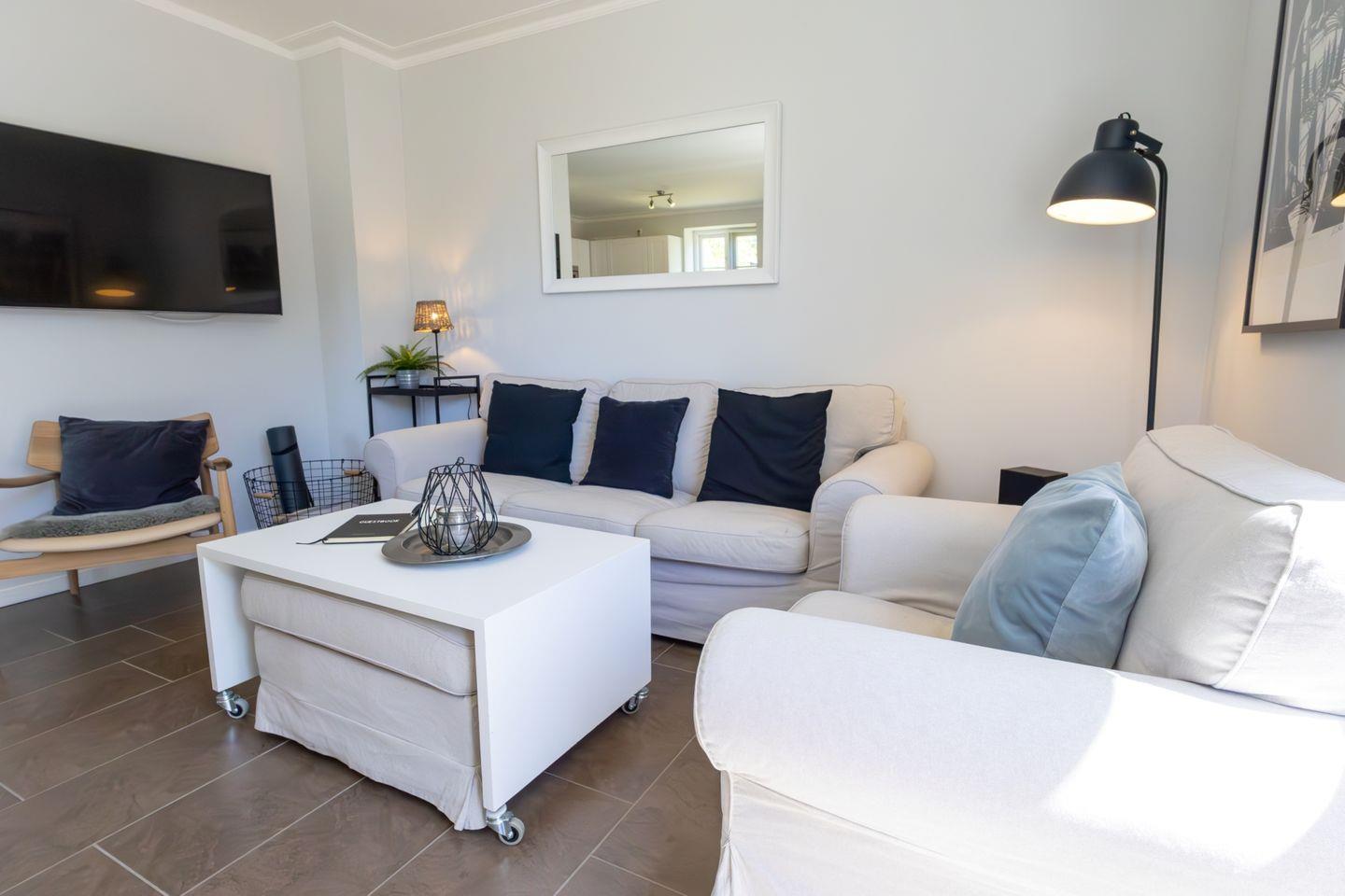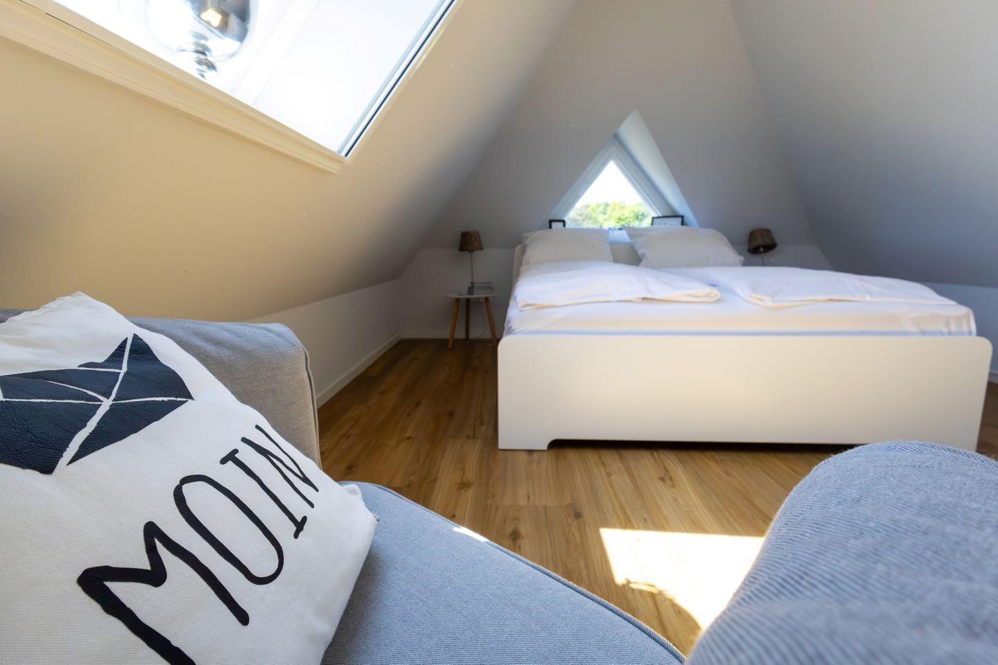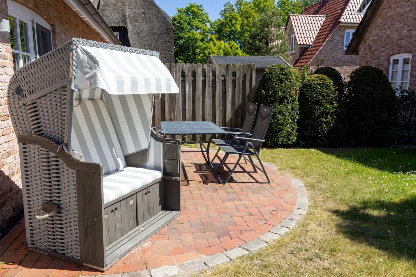 Im Erd- und Obergeschoss sorgt eine Fußbodenheizung für ein angenehmes Raumklima. Die Terrasse ist in der Saison mit Gartenmöbeln und einem Strandkorb ausgestattet.