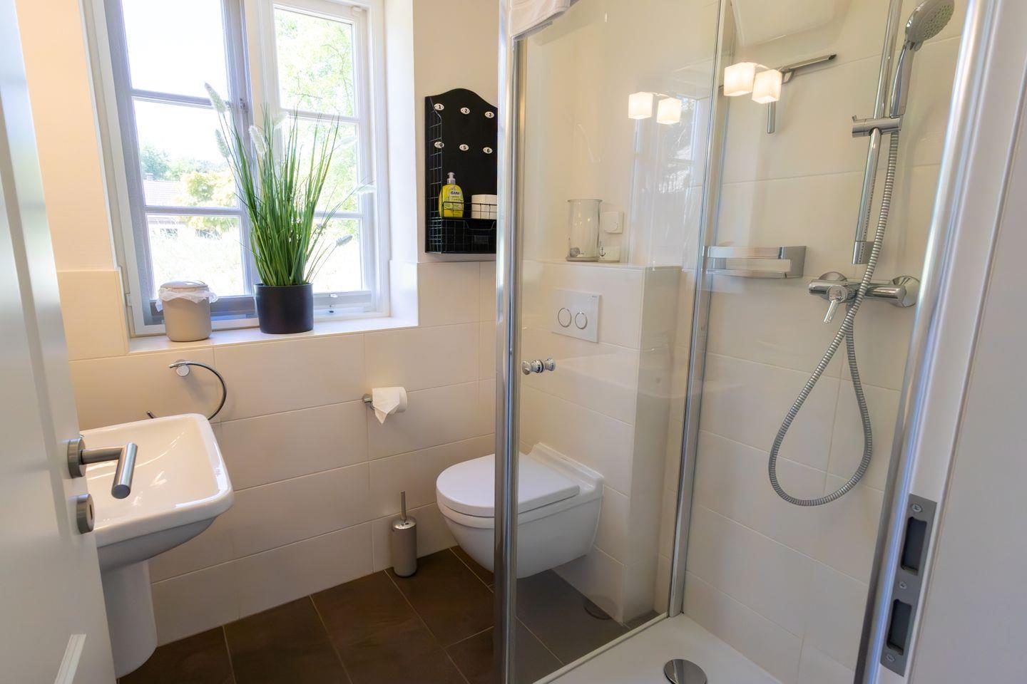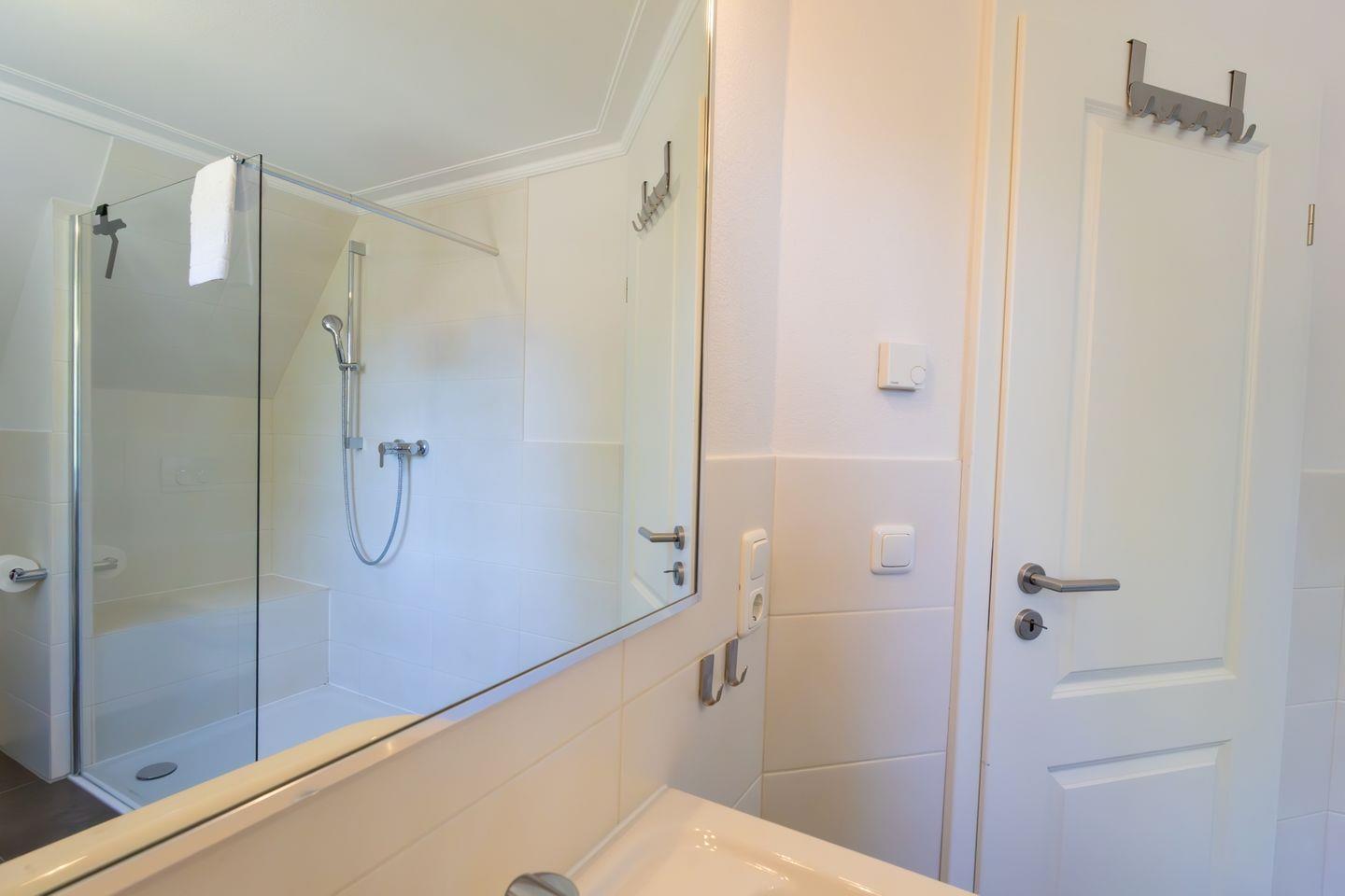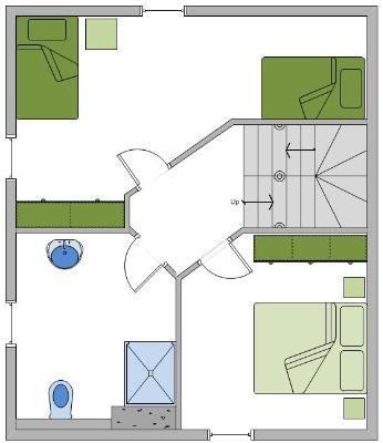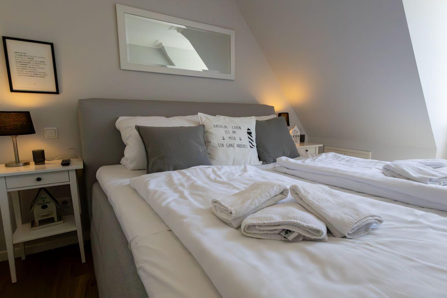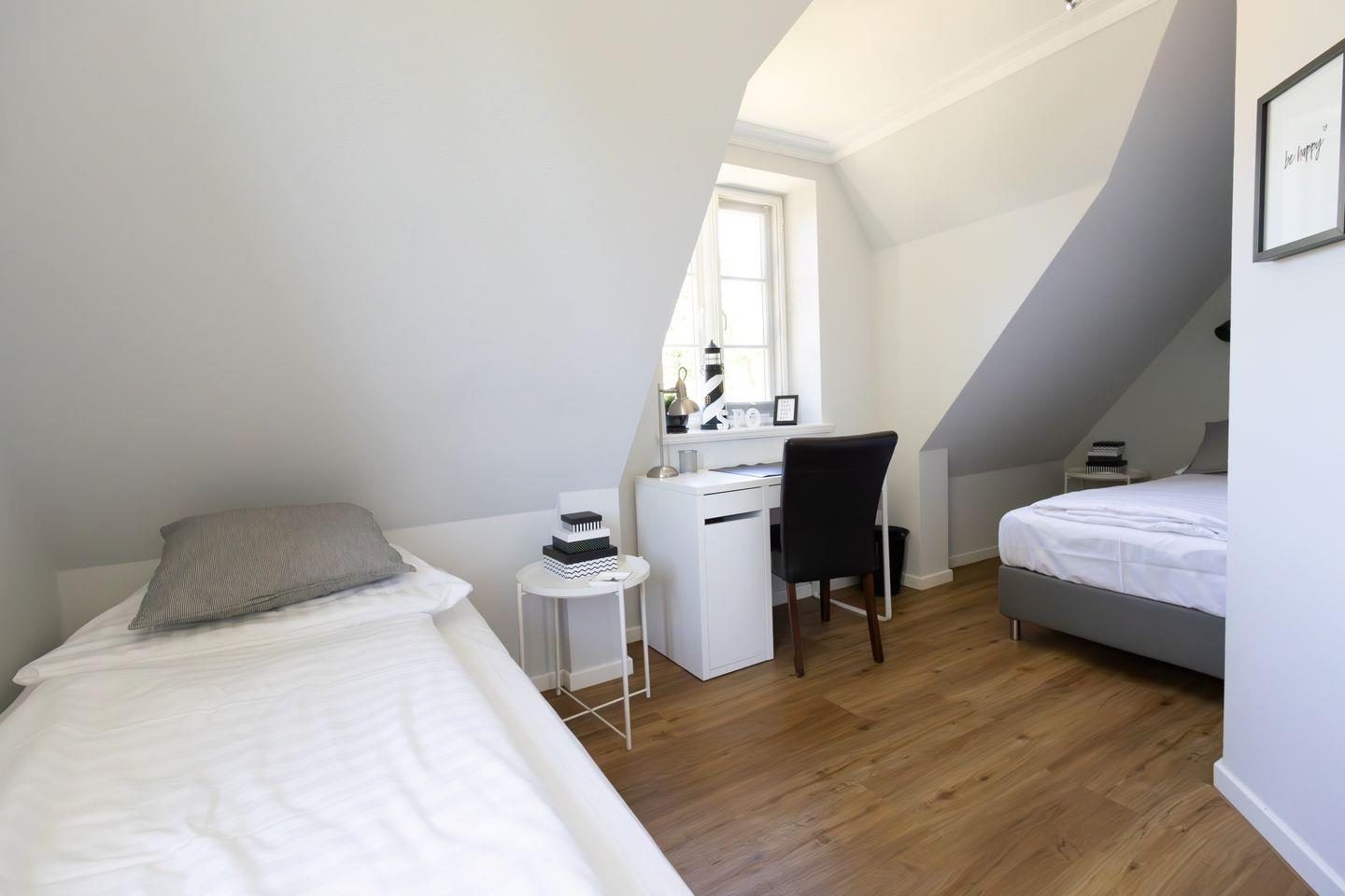 Obergeschoss: ein Schlafzimmer mit Boxspringbett (180 x 200 cm - durchgehender Topper), ein Schlafzimmer mit 2 Einzelbetten (je 90 x 200 cm), ein Duschbad / WC