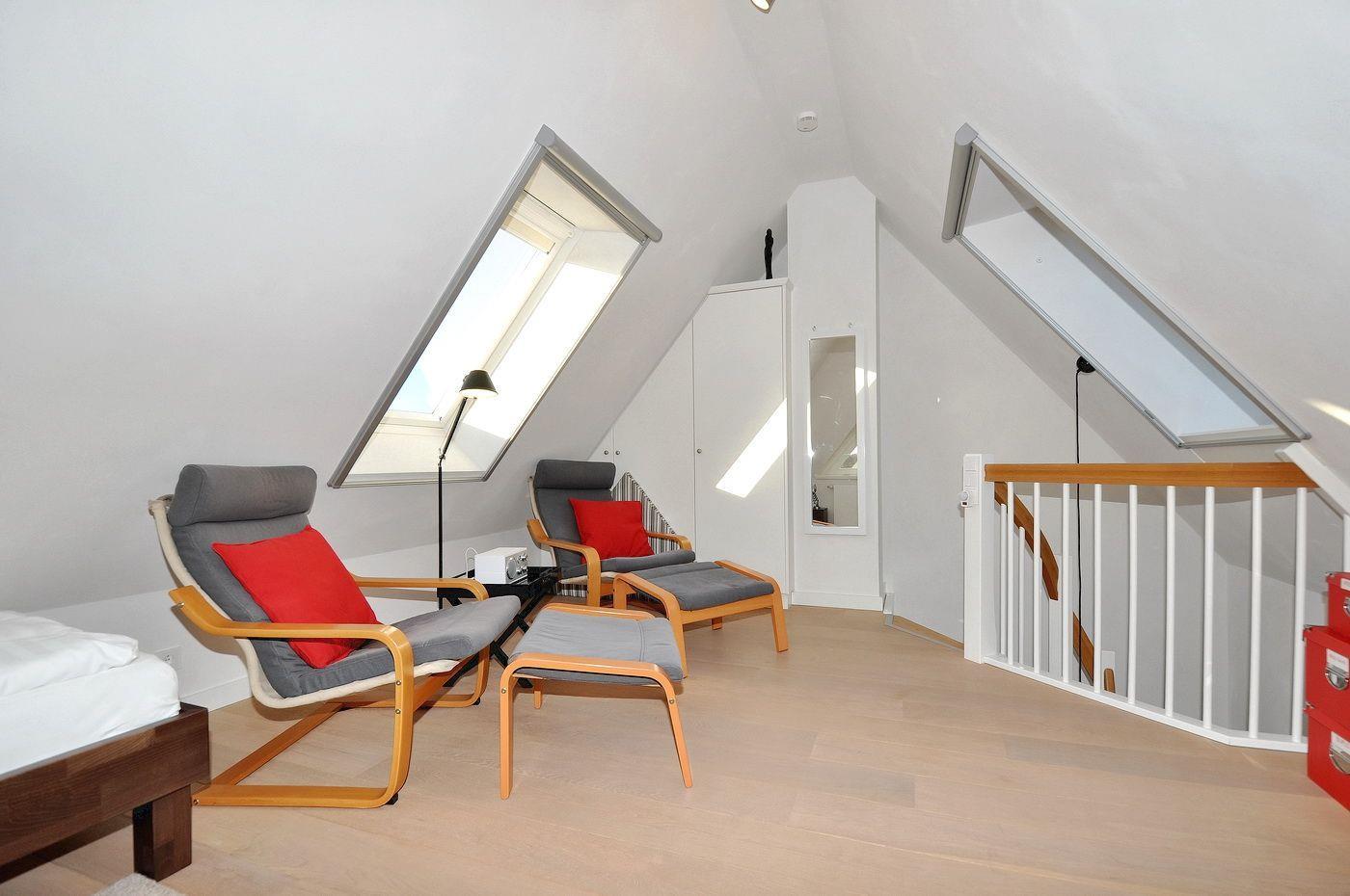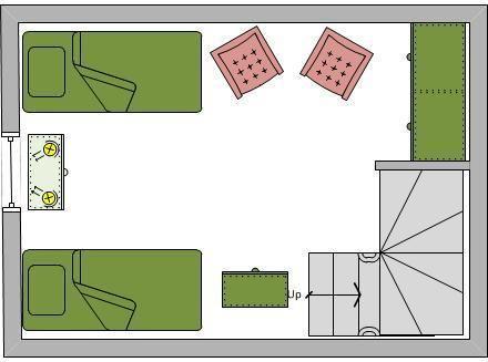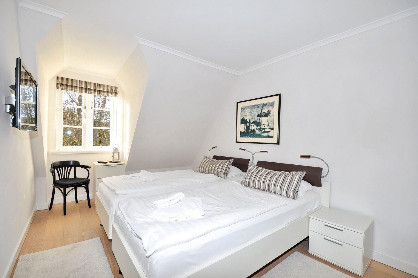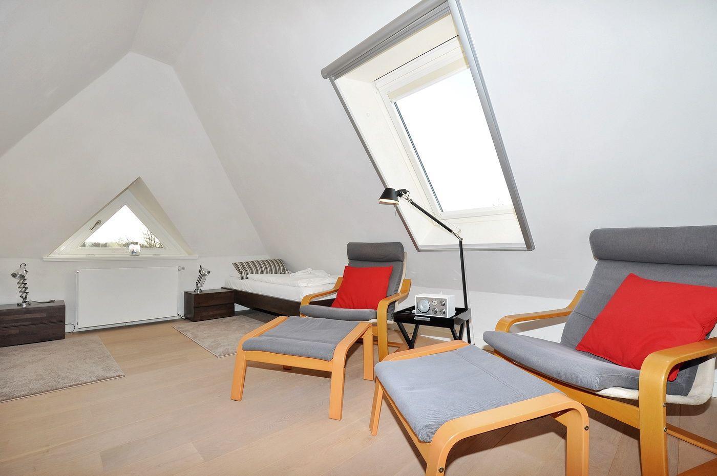 Dachgeschoss: ein Schlafzimmer mit 2 Einzelbetten (je 90 x 200 cm), Kleiderschrank und 2 Sesseln
