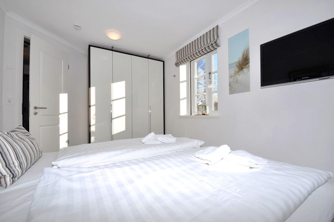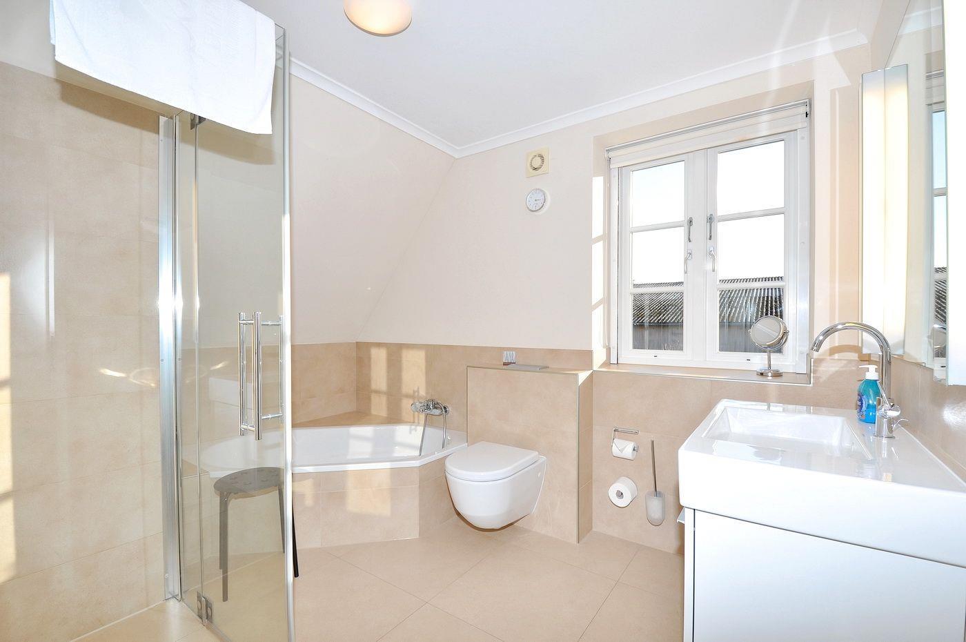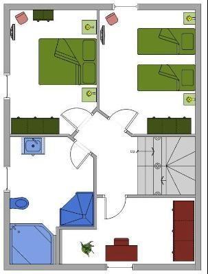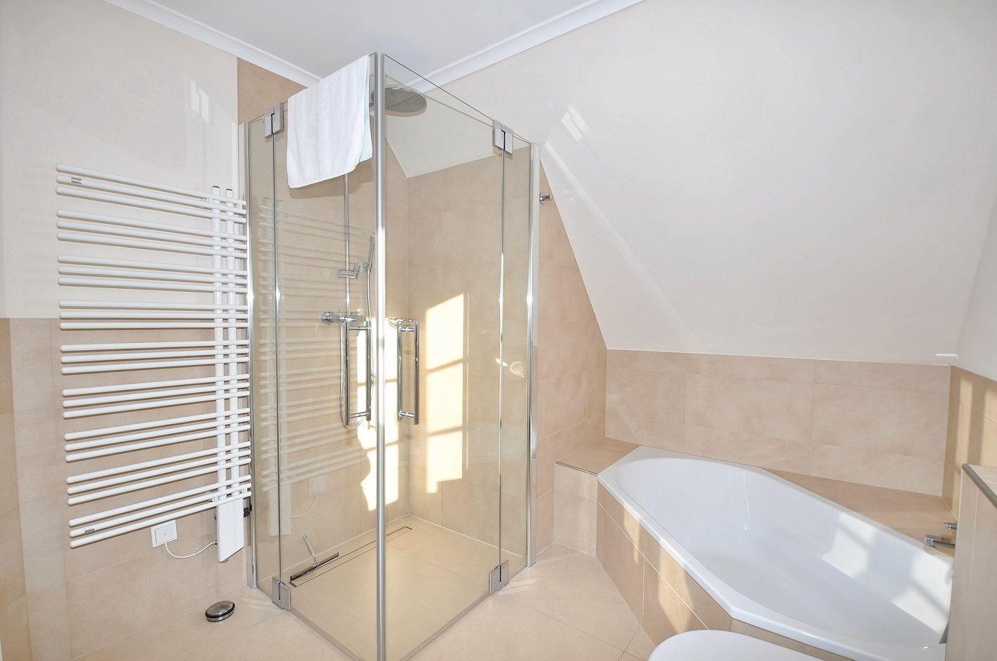 Obergeschoss: 1 Schlafzimmer mit Doppelbett (je 180 x 200 cm - Einzelmatratzen), 1 Schlafzimmer mit 2 Einzelbetten (je 90 x 200 cm), ein Wannenbad / WC mit separater Dusche und Handtuchheizung, ein kleiner Arbeitsraum