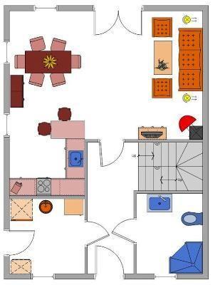 Erdgeschoss: Eingangsbereich, Wohnraum mit offener Küche, Essbereich, Kamin und Zugang zur Terrasse, ein Duschbad / WC und Handtuchheizung, ein Hauswirtschaftsraum