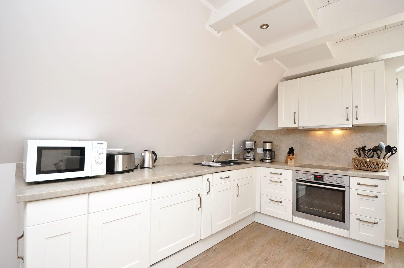 Obergeschoss: Eingangsbereich, Wohnraum mit integrierter Küche, Essbereich und Zugang zum Balkon, ein Schlafzimmer mit Doppelbett (180 x 200 cm), ein Duschbad / WC