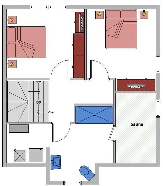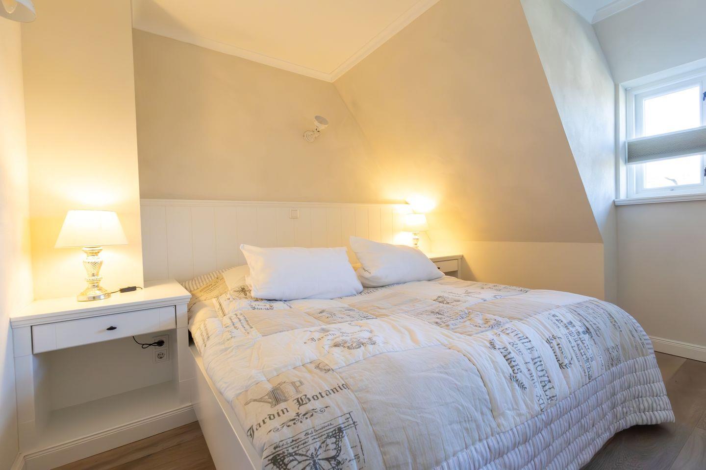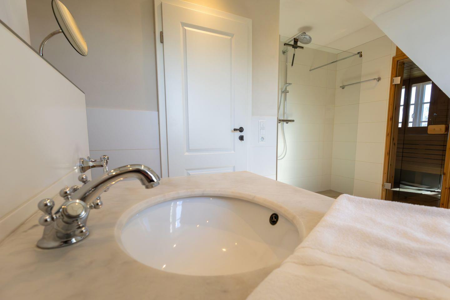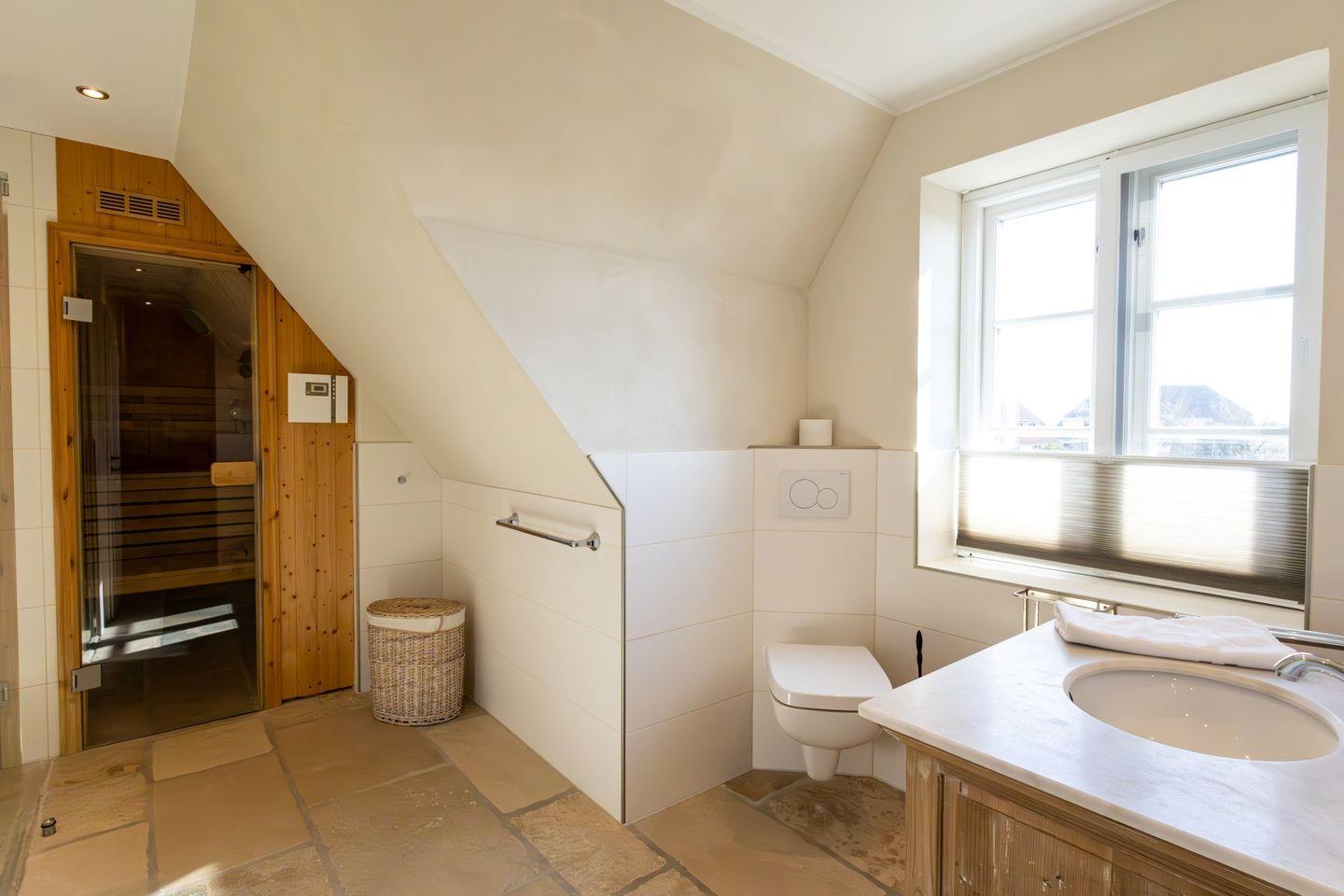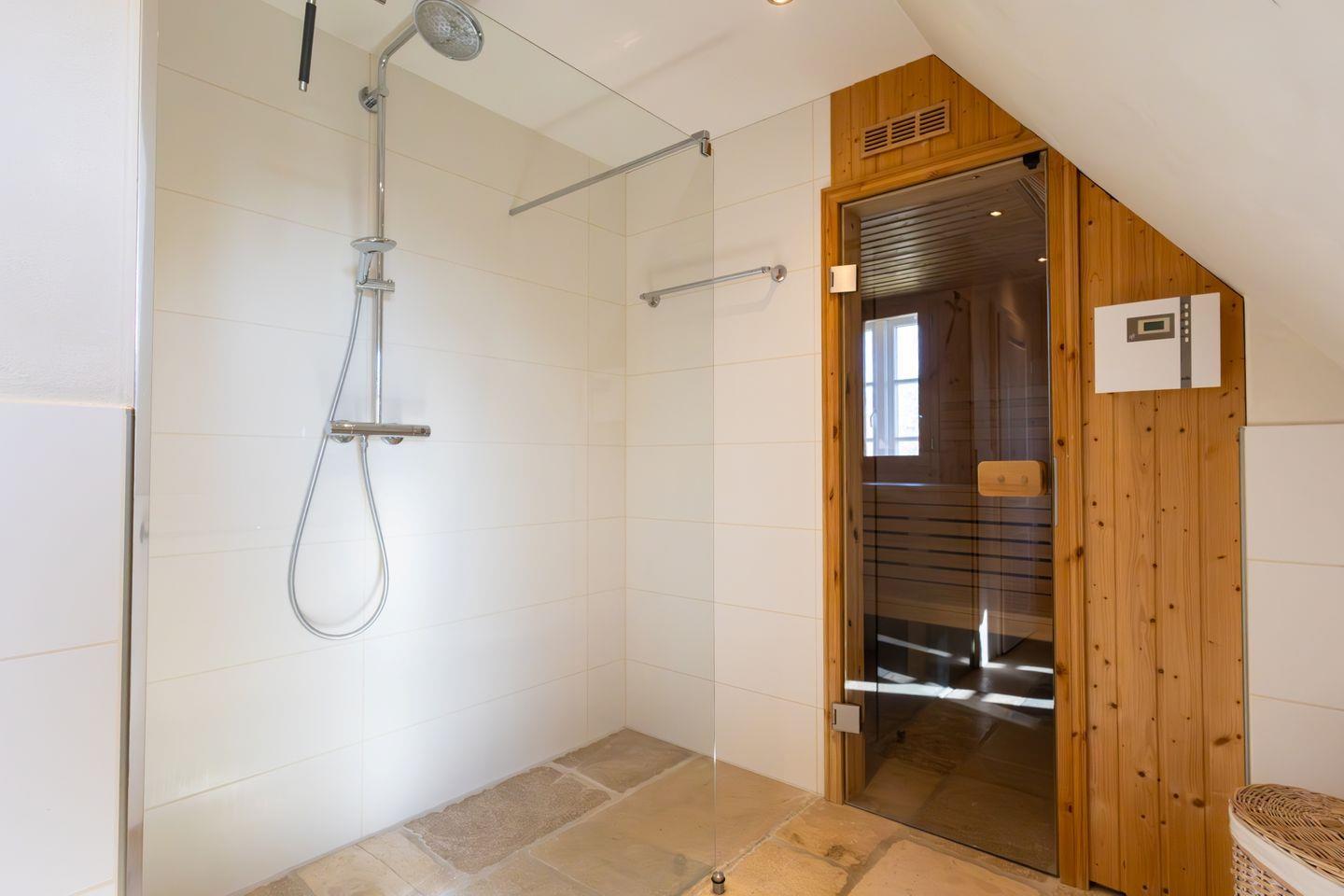 Obergeschoss: 2 Schlafzimmer mit Doppelbett (1x 180 x 200 cm - Einzelmatratzen und 1x 200 x 200 cm - Einzelmatratzen) und TV, ein Duschbad / WC mit Handtuchwärmer und Sauna