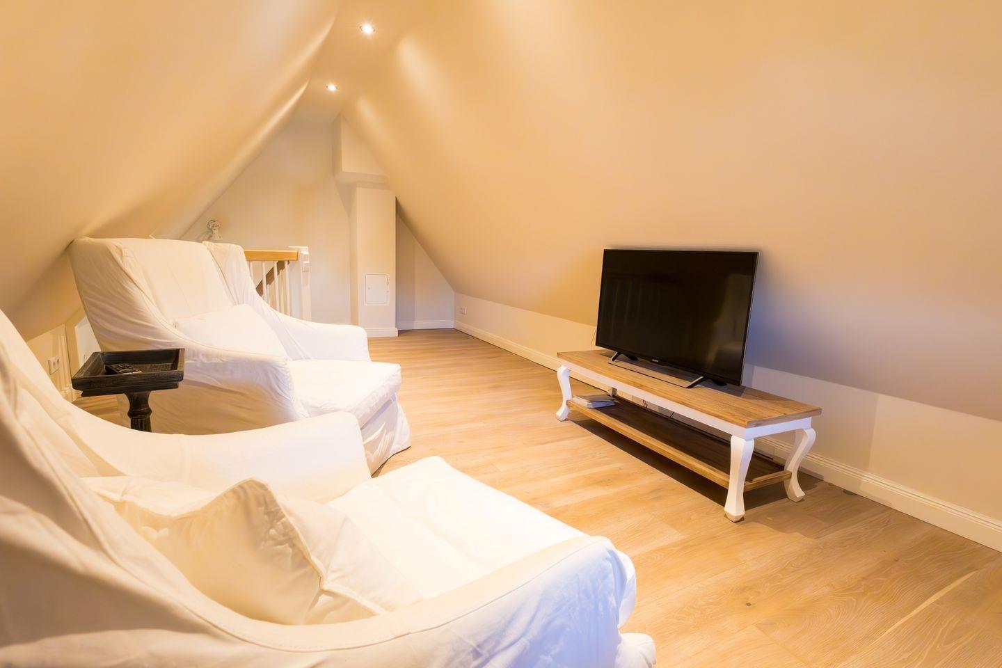 Dachgeschoss: gemütlicher Wohnbereich mit 2 bequemen Sesseln und TV