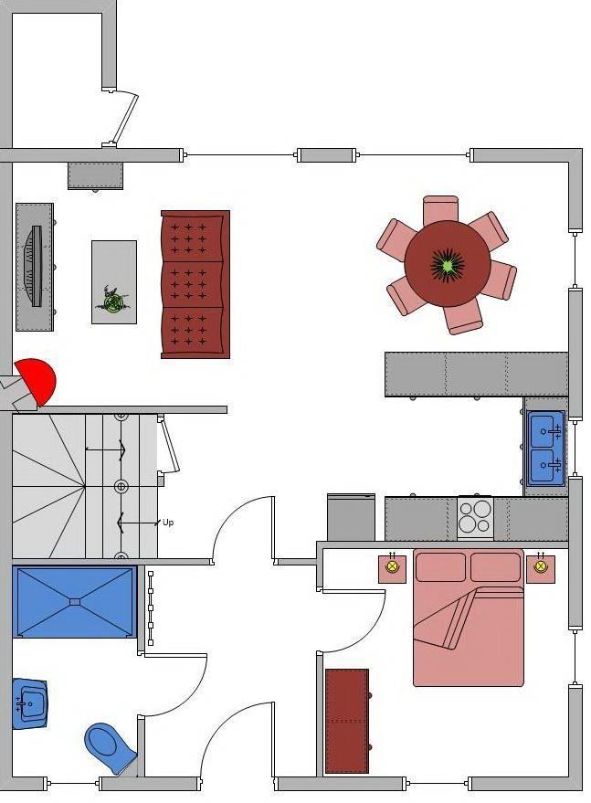 Erdgeschoss: Eingangsbereich, Wohnraum mit offener Küche, Essbereich, Kamin und Zugang zur Terrasse, ein Schlafzimmer mit Doppelbett (160 x 200 cm - Einzelmatratzen), ein Duschbad / WC, ein Hauswirtschaftsraum