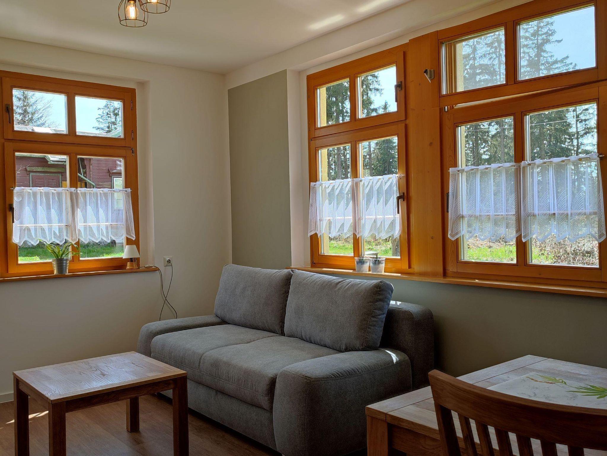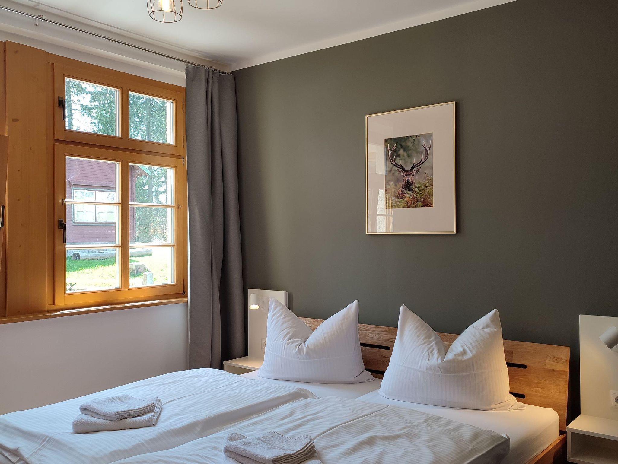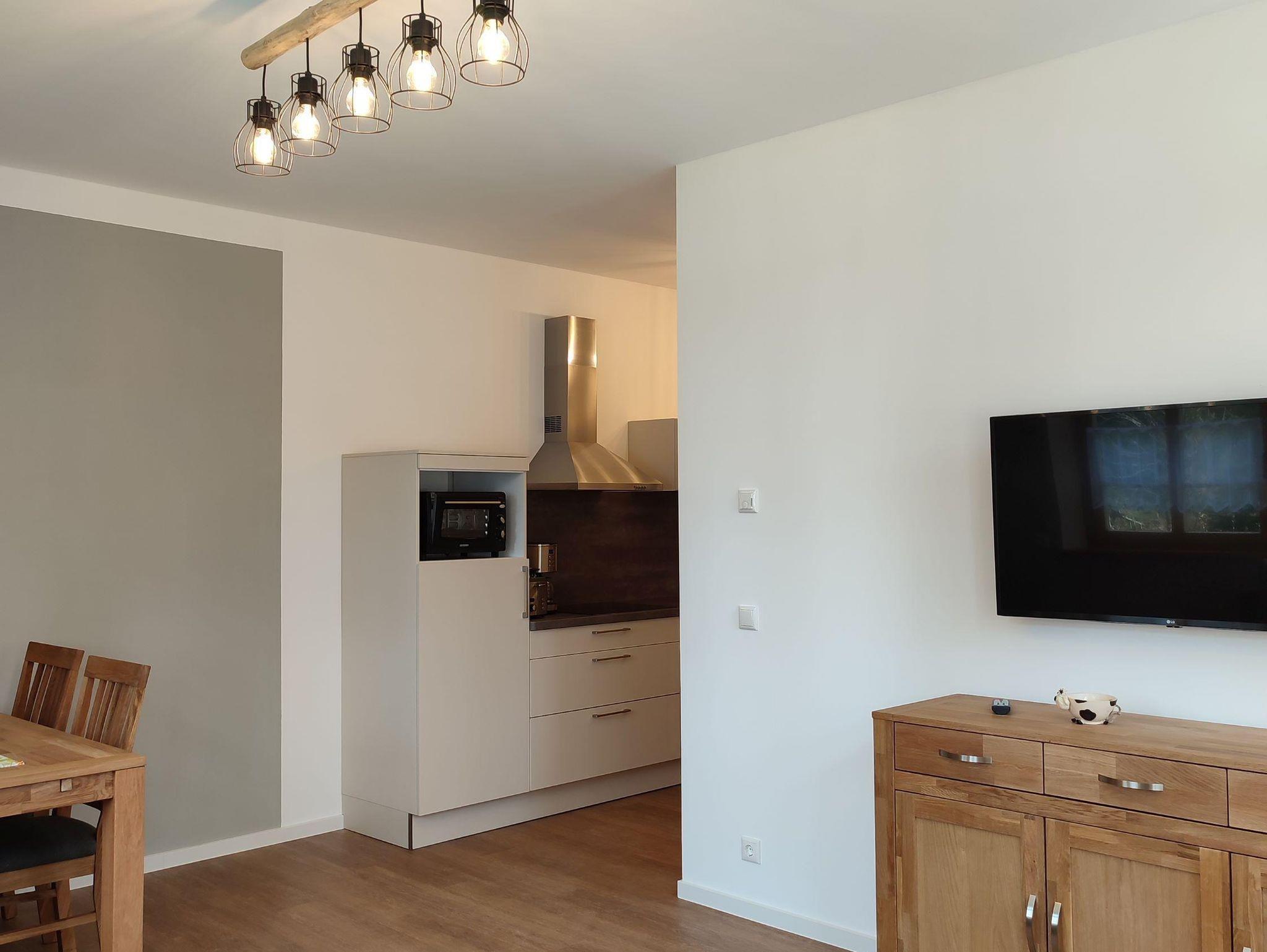 Entdecken Sie Jutta, ein barrierearmes Zwei-Raum-Apartment im Erdgeschoss mit ca. 45 qm für 2 bis 4 Personen. Erleben Sie das großzügige Wohnzimmer mit ausziehbarem Schlafsofa, TV/WLAN und großem Esstisch, die moderne Küchenzeile, das Schlafzimmer mit Doppelbett und das stilvolle Badezimmer mit ebenerdiger Dusche. Der direkte Zugang zur Terrasse nach Südost und dem Garten lädt zum Entspannen ein. Haustiere sind herzlich willkommen.