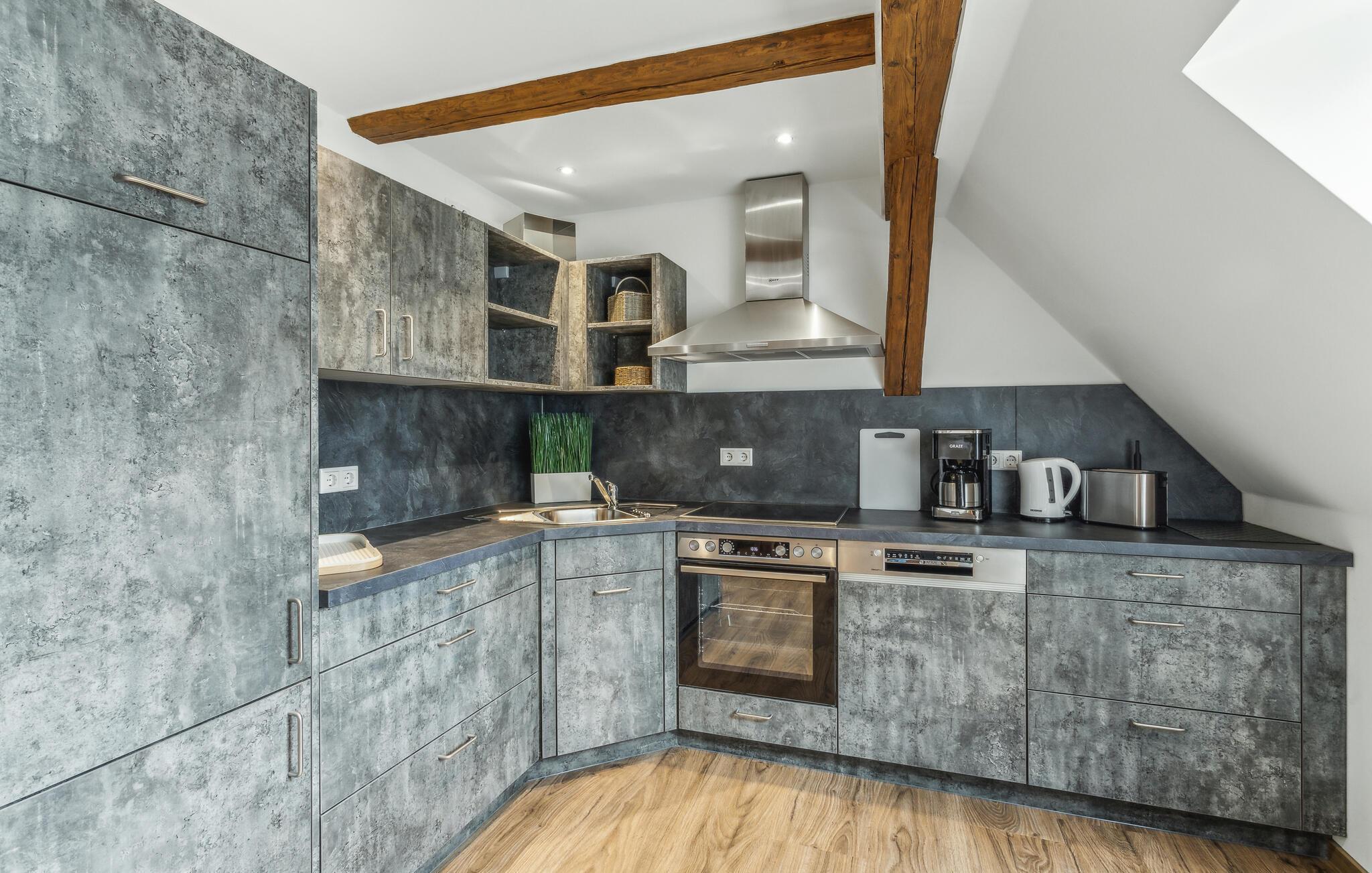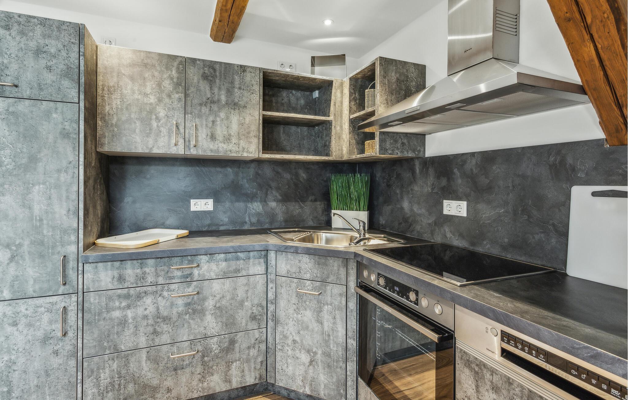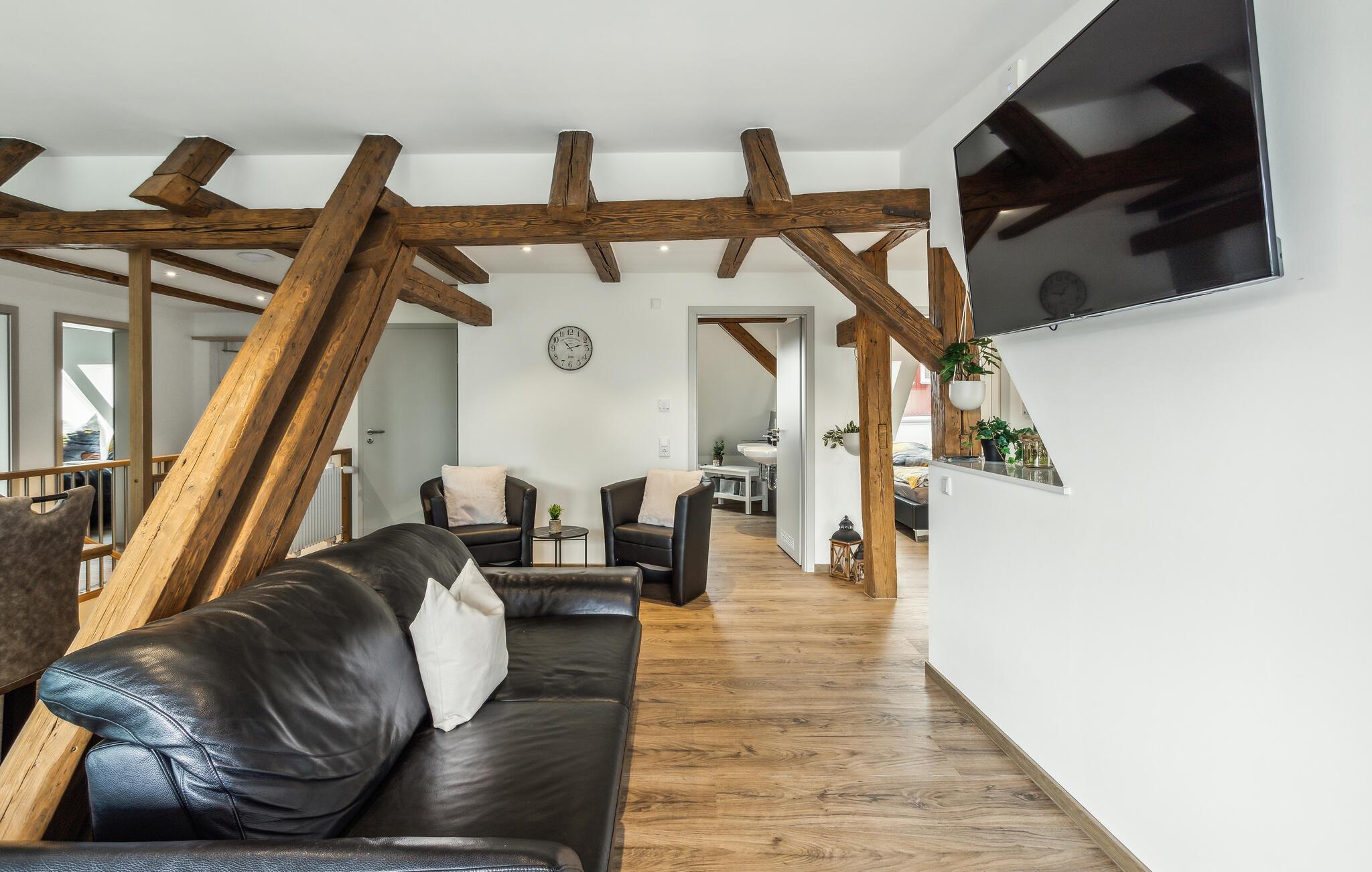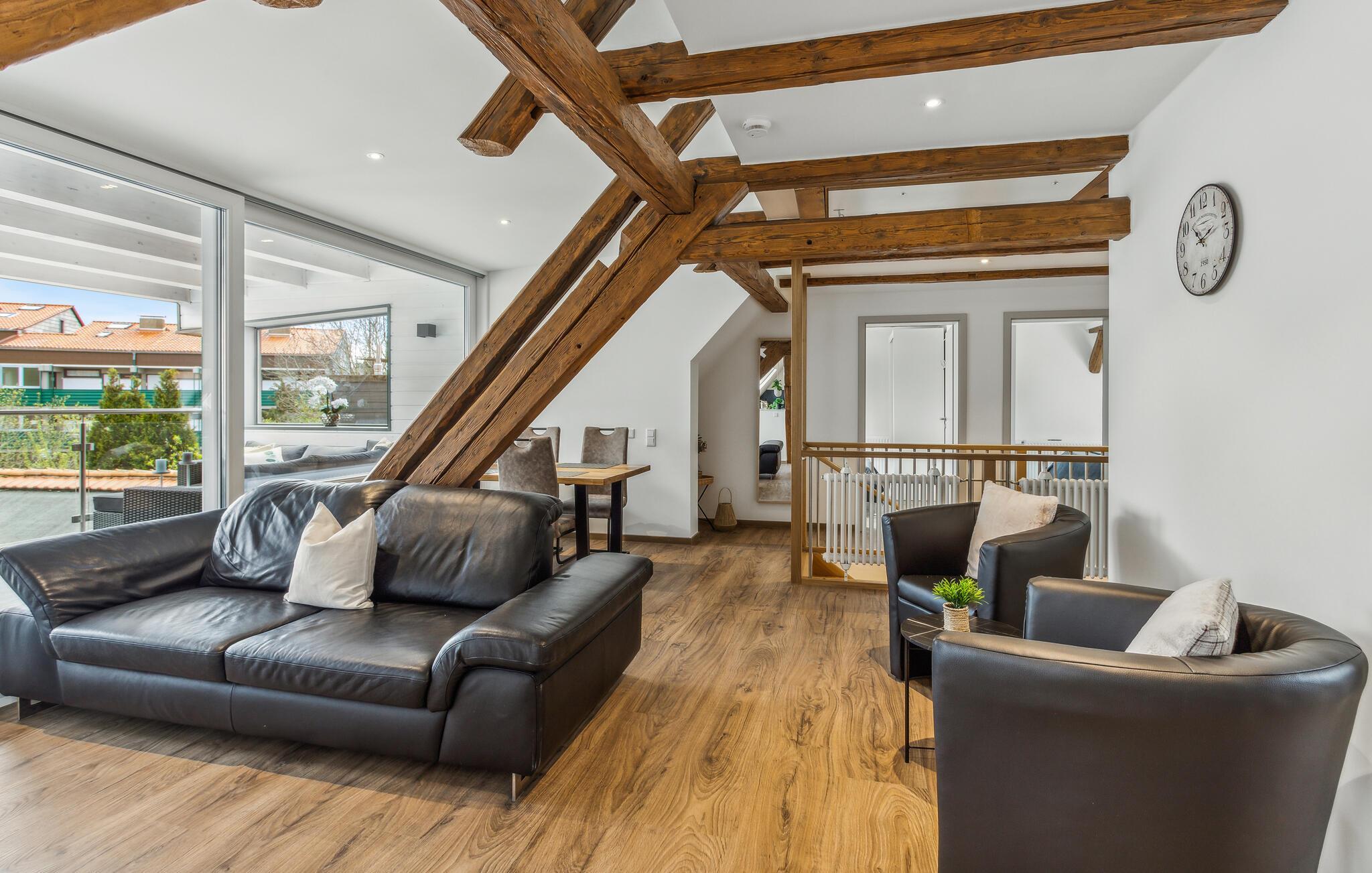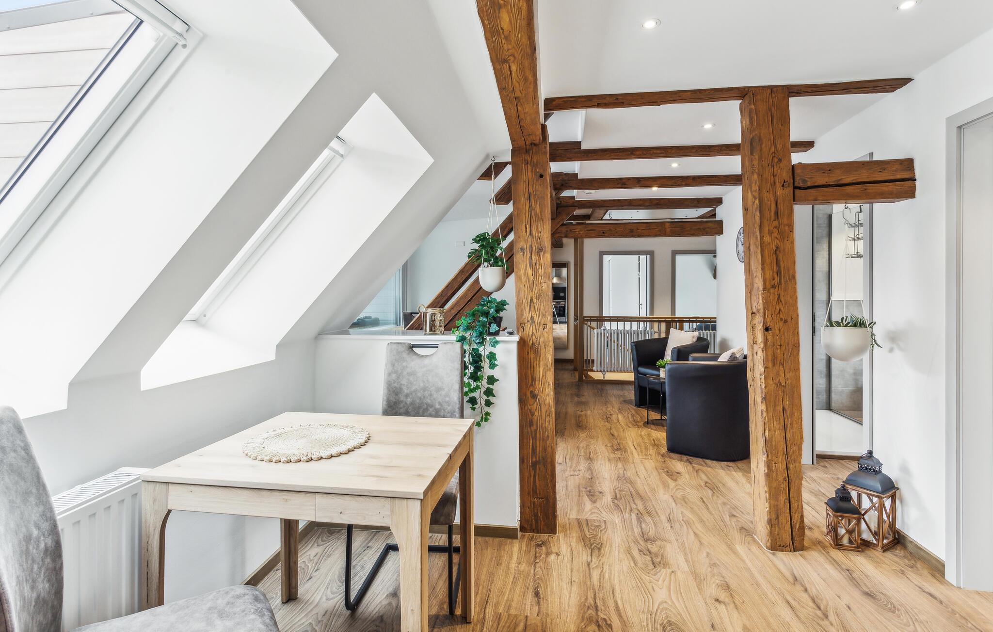 Velkommen til denne attraktive lejlighed, hvor I får den perfekte base for en ferie med mange spændende udflugter. Boligen er flot indrettet med massive træbjælker, komfortable møbler og gode faciliteter, der gør det nemt for jer at slappe af og sænke skuldrene efter en aktiv feriedag. Lav noget god mad, nyd den ved spisebordet og rund en smuk dag af i stuen med brætspil eller en god film.