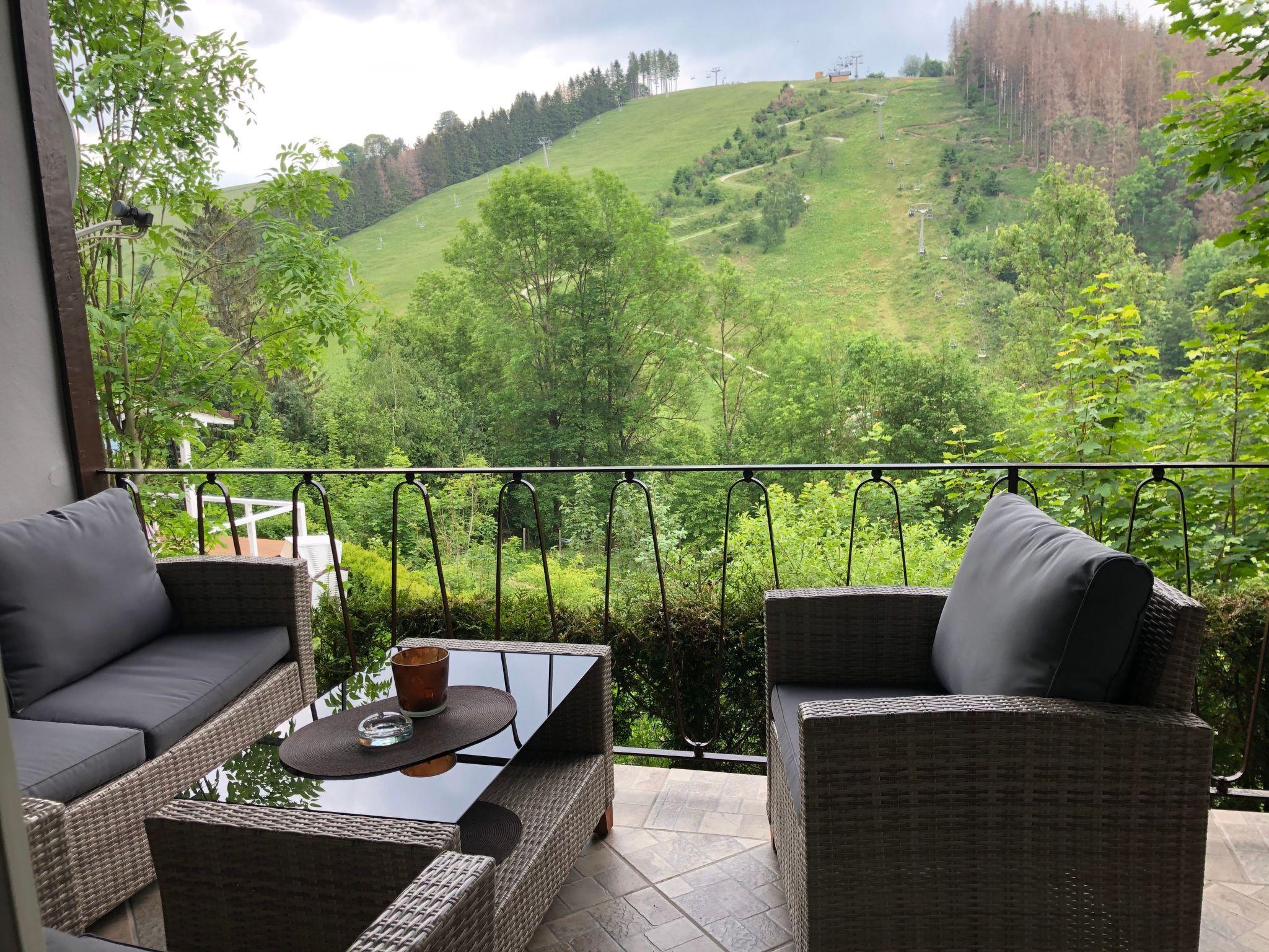 Fantastic holiday home in a prime location opposite the ski slope with panoramic views The property is in a prime location with a direct view of the ski area and the summer toboggan run, which are just 100 metres away. Recently, in addition to the toboggan run, a mountain bike downhill course with various levels of difficulty has also been created. At weekends and on public holidays, the slope is floodlit so that it can be used even after dark. All everyday amenities are just a few minutes' walk away. The house itself is part of a holiday complex with a total of 9 houses on 12,000 square metres of land. A special feature compared to the other properties is the highest location with the resulting unobstructed view and the possibility to park 2 cars directly in front of the house - weather permitting. The Mathias-Schmidt-Berg opposite offers excellent winter sports opportunities with its 4 downhill runs and 3 lifts, and from spring it boasts one of the longest summer toboggan runs in the country.