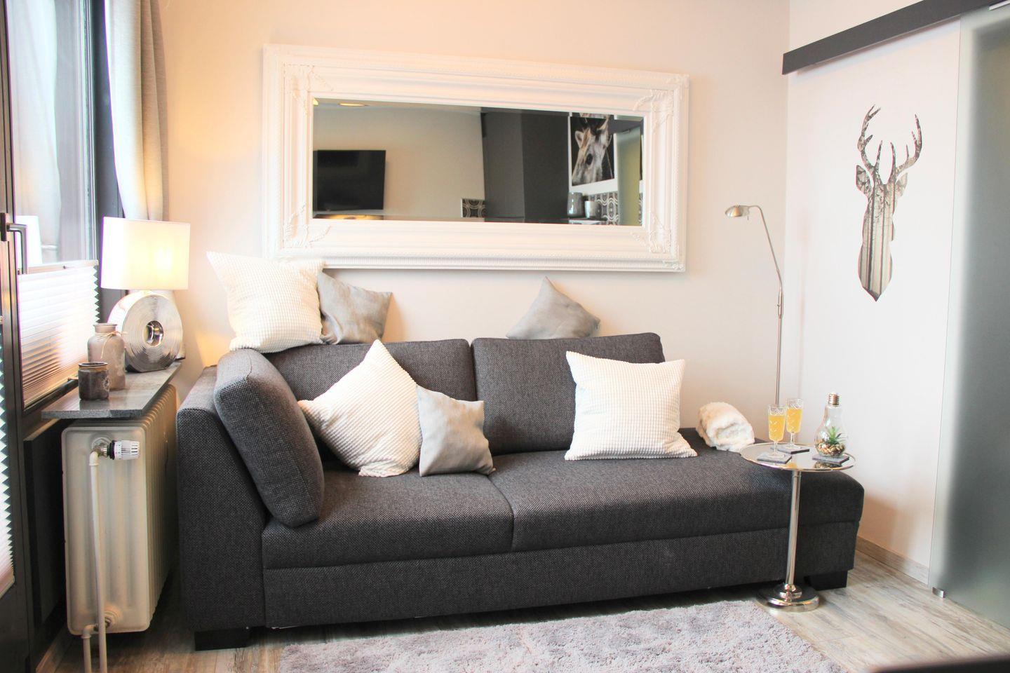 Der kombinierte Wohn- und Schlafbereich ist der zentrale Ort der Wohnung. Du findest hier ein bequemes Sofa zum Entspannen und große Fenster, die viel Licht hereinlassen und den Blick auf die Natur freigeben. Eine voll ausgestattete Küchenzeile mit Herd, Backofen, Kühlschrank, Kaffeevollautomat, Spülmaschine und Mikrowelle steht Dir zur Verfügung. Der kleine Essbereich bietet Platz für zwei Personen. Das Bad ist modern und mit einer ebenerdigen Dusche, Waschbecken und WC ausgestattet.