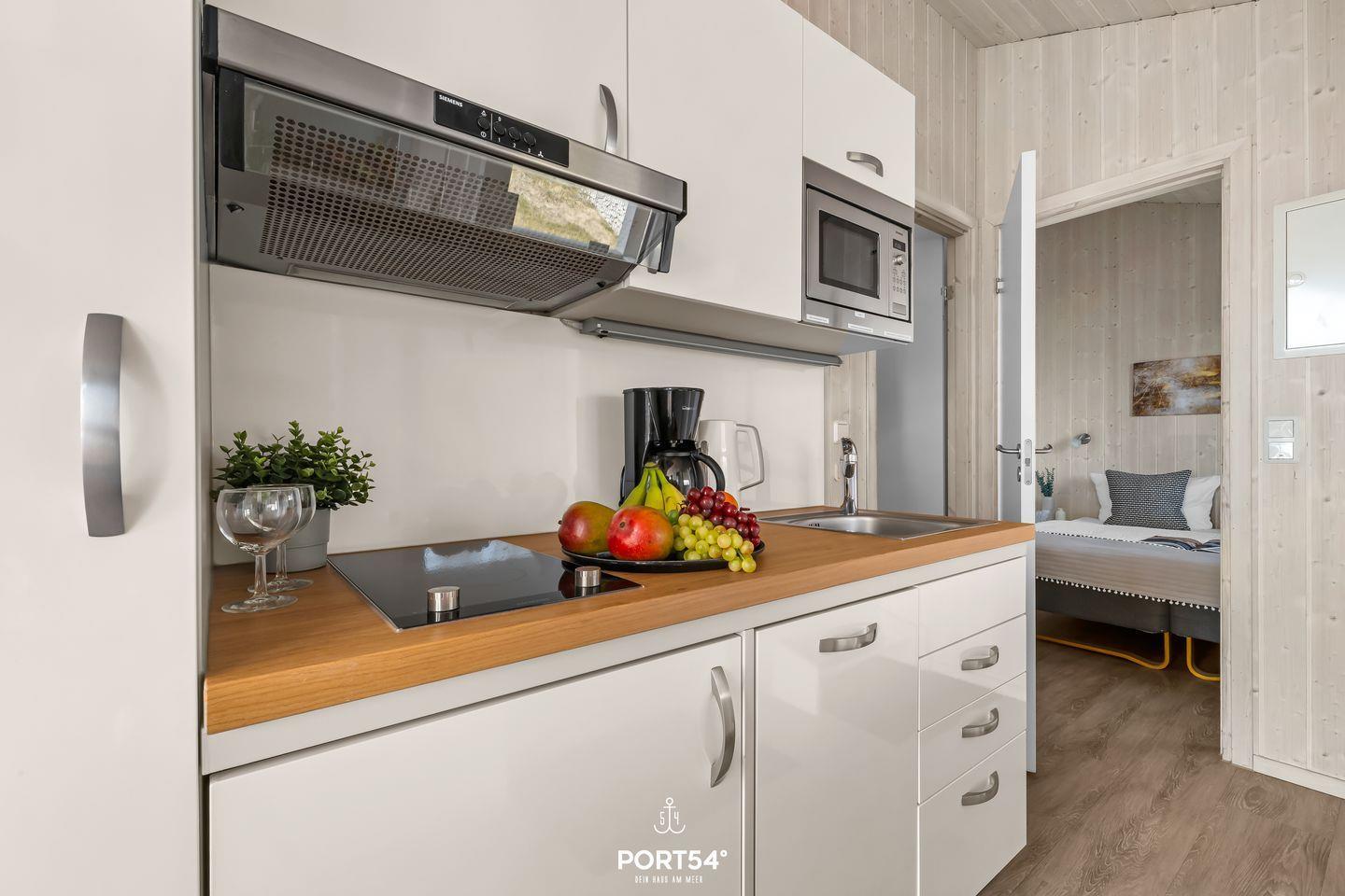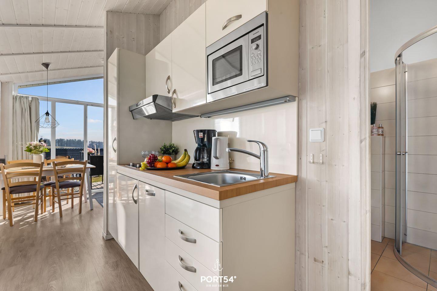 Die angrenzende, kompakte Küche ist bestens ausgestattet und bietet alles, was Sie brauchen, um gemeinsam zu kochen und kulinarische Genüsse zu zaubern. Der kleine, gemütliche Essbereich lädt zu genussvollen Mahlzeiten und langen Gesprächen ein – ein perfekter Ort, um den Tag Revue passieren zu lassen. Die Küche ist ausgestattet mit 2-Platten-Cerankochfeld, Kühlschrank mit Gefrierfach, Mikrowelle und Kaffeemaschine.