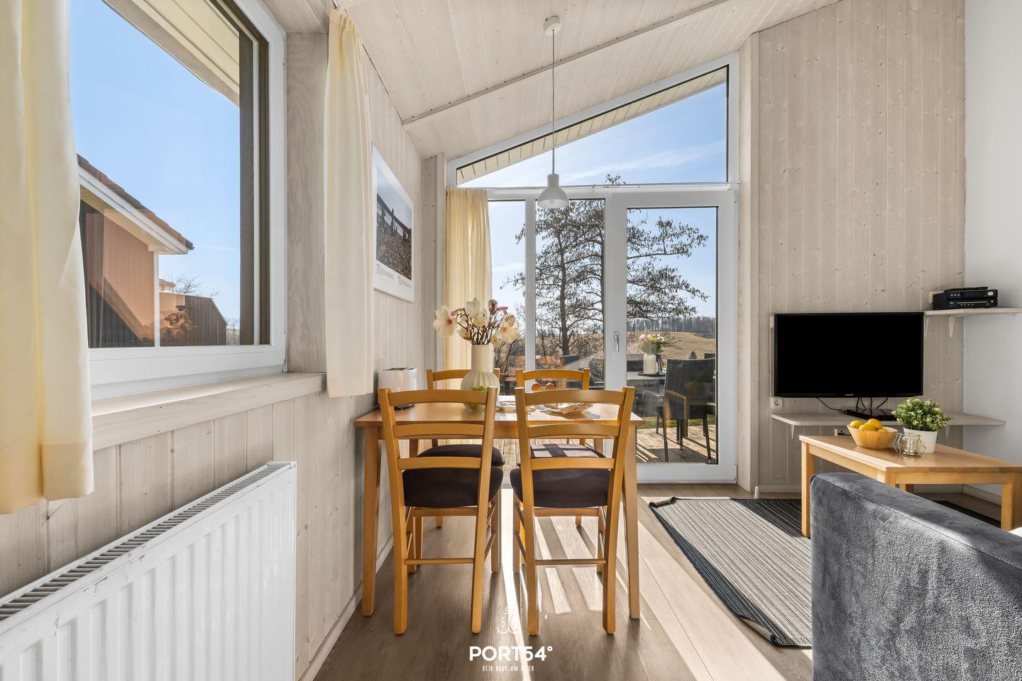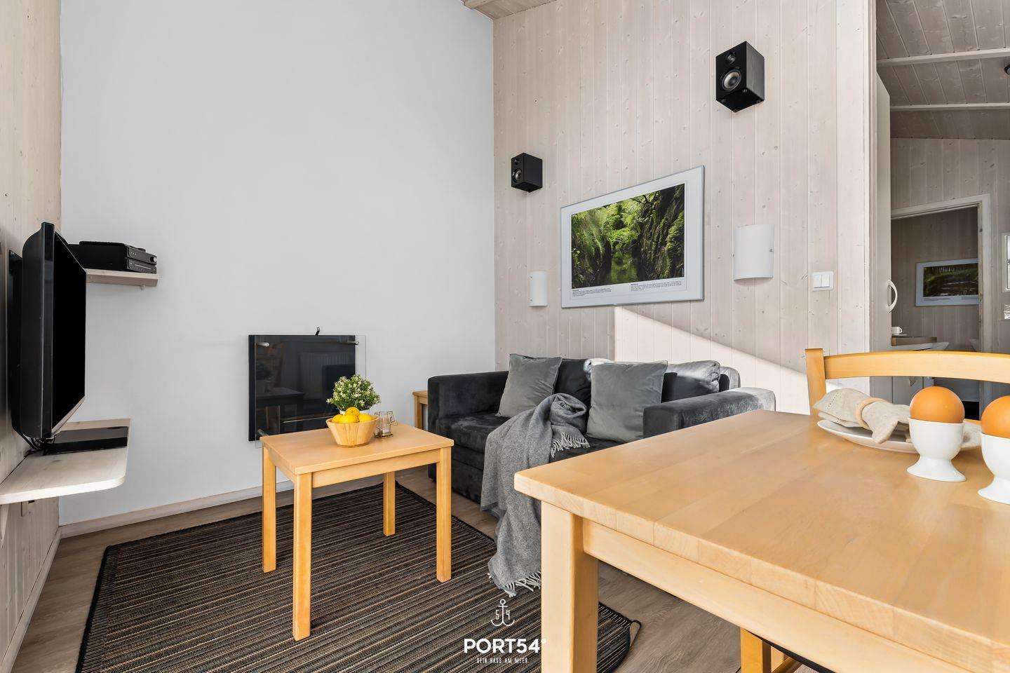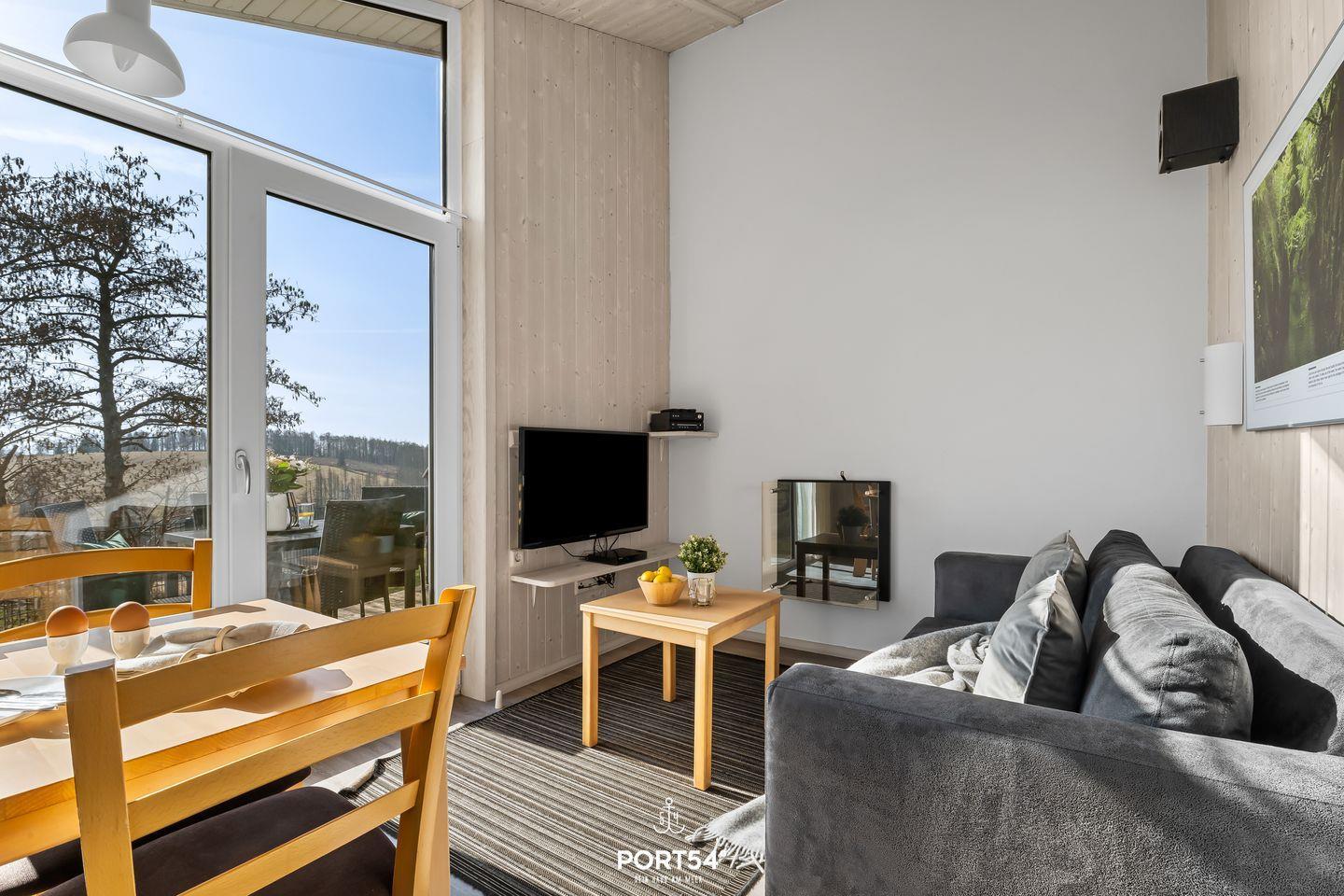 Der offene Wohnbereich bildet das Herzstück des Hauses. Mit seiner gemütlichen Couch, rustikalen Holzelementen und einem Bio-Ethanol-Kaminofen lädt er zu entspannten Abenden in wohliger Atmosphäre ein. Große Fenster holen die umliegende Natur ins Innere und lassen den Raum lichtdurchfluten. Hier können Sie auf der Couch entspannen, ein Buch lesen oder bei einer Tasse Tee den Ausblick genießen. Ein Flachbild-TV und eine Musikanlage sorgen für zusätzliche Unterhaltung.