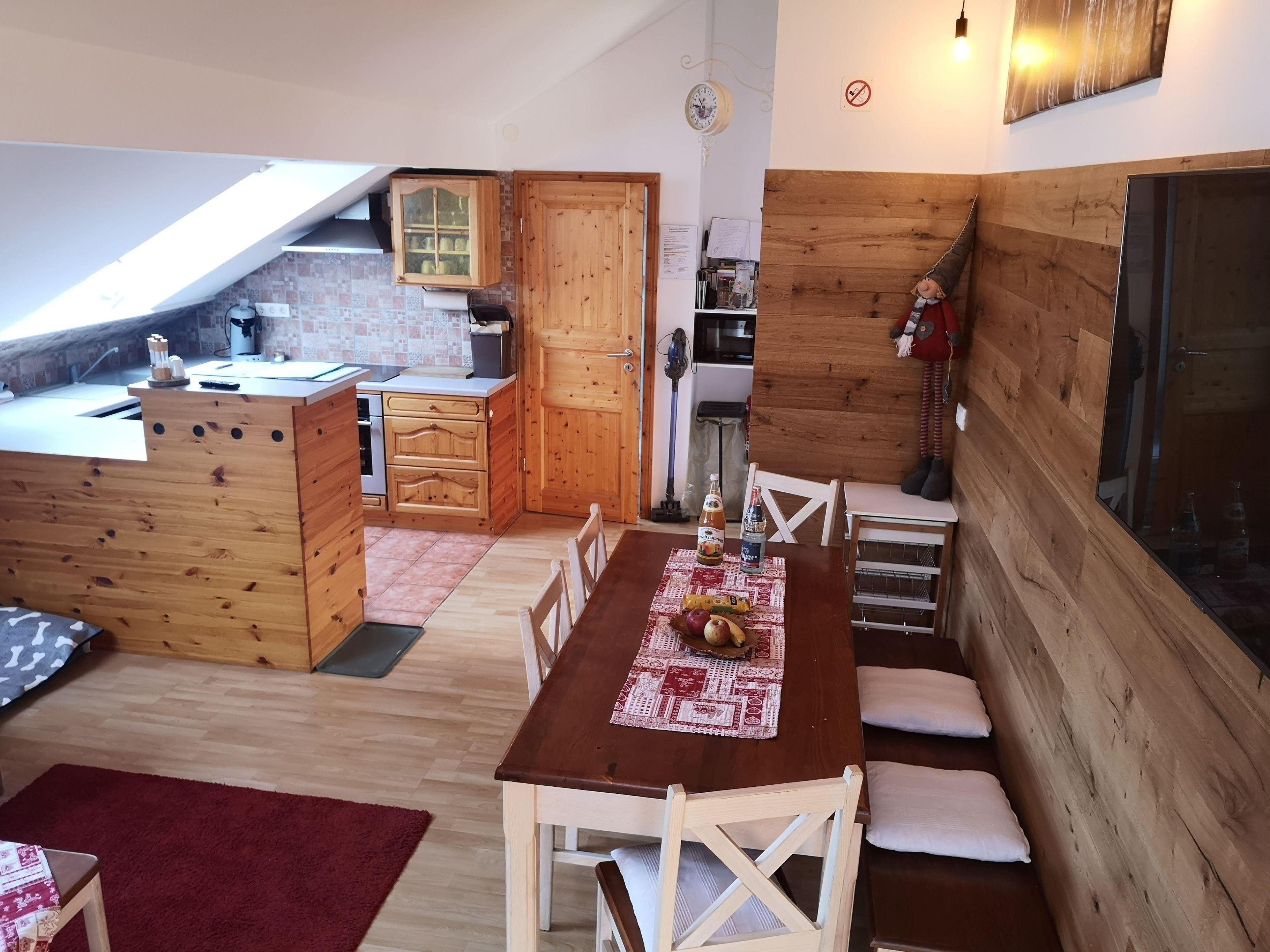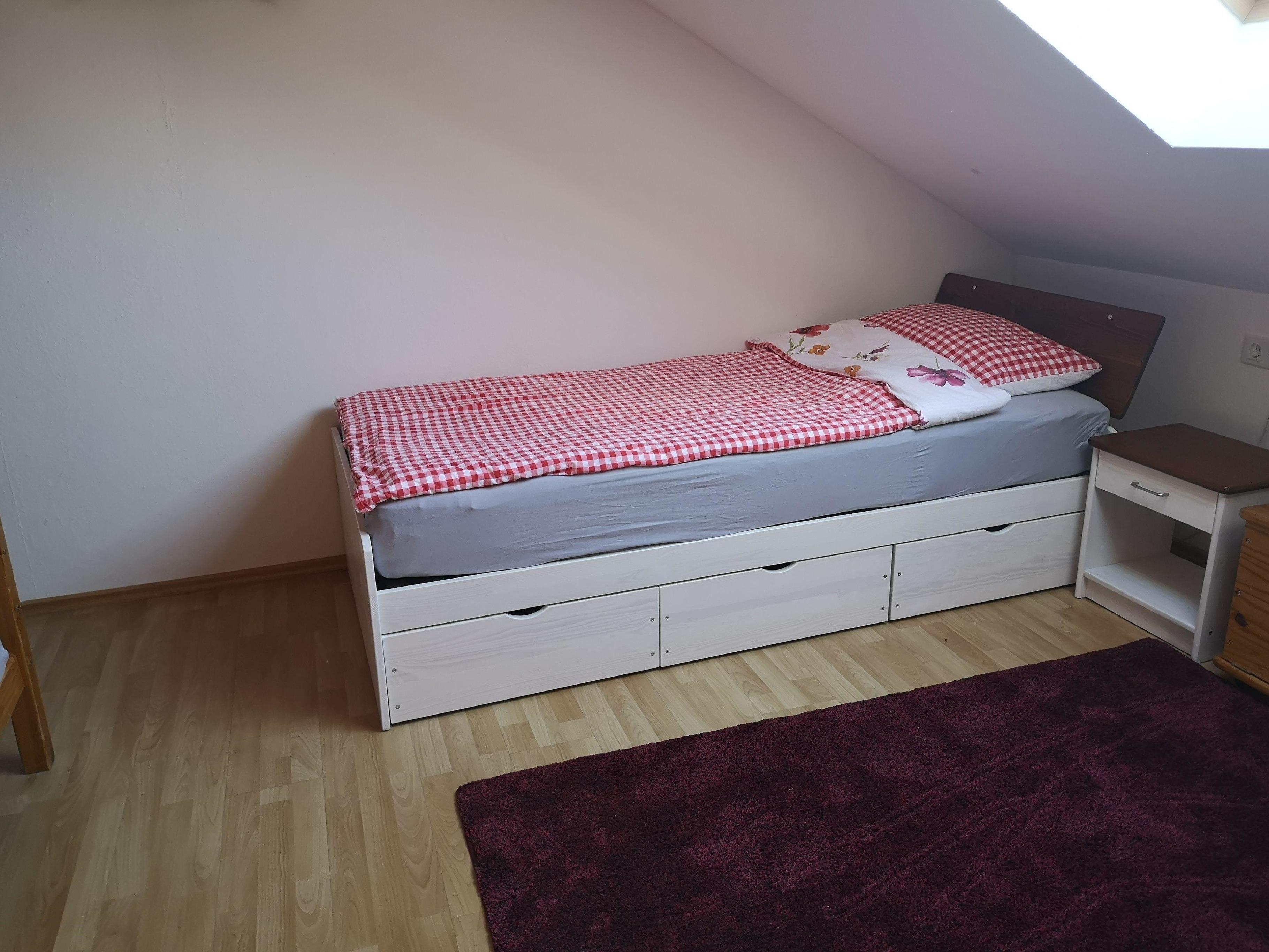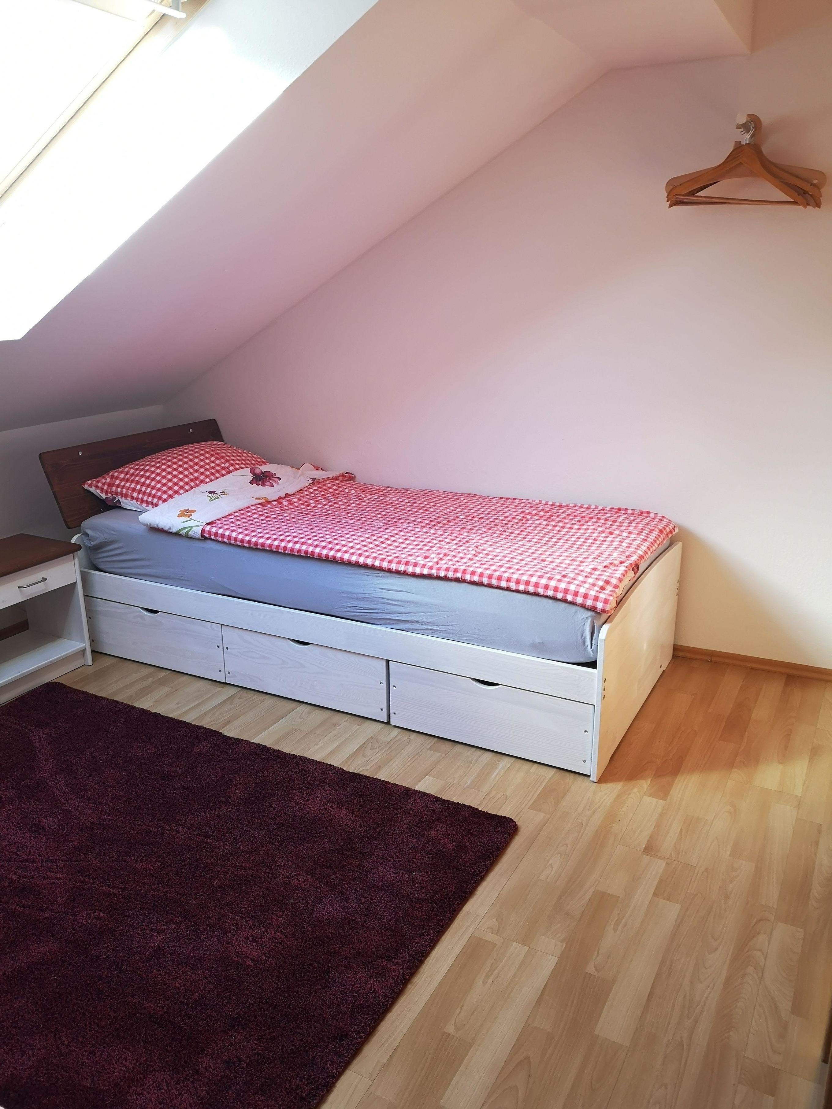 Wir wohnen unten die Ferienwohnung ist im 1.OG im Dachgeschoss.