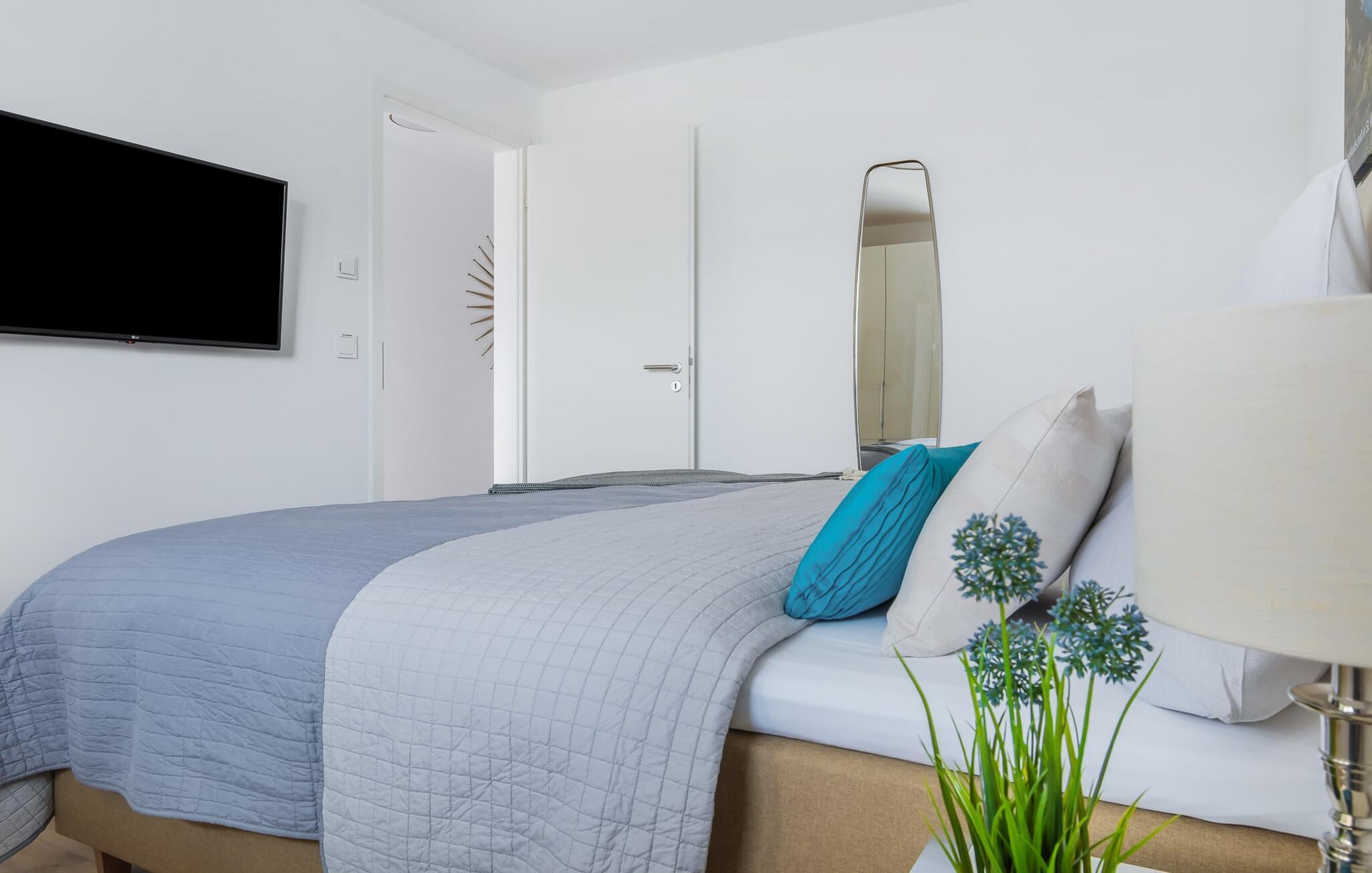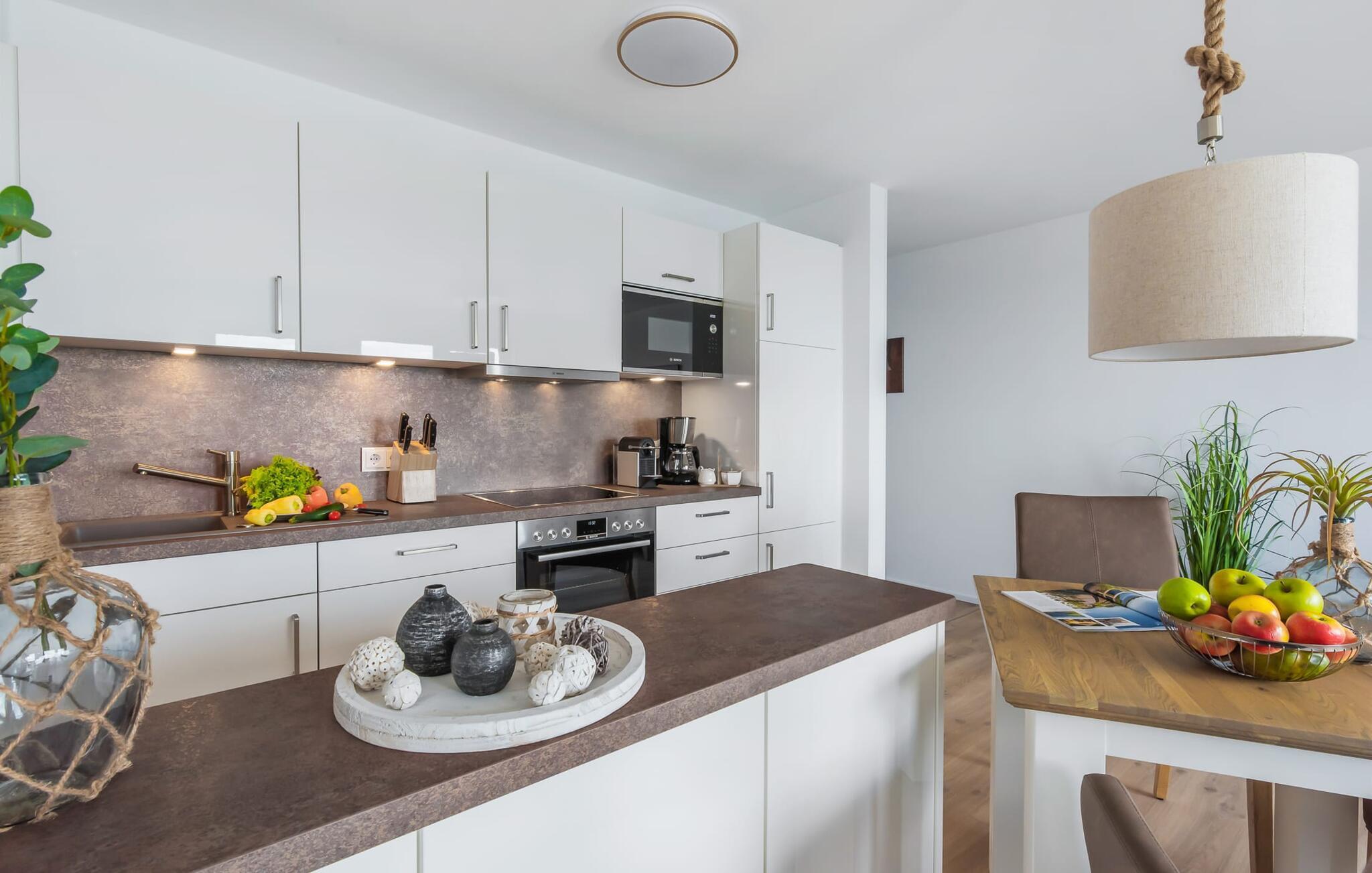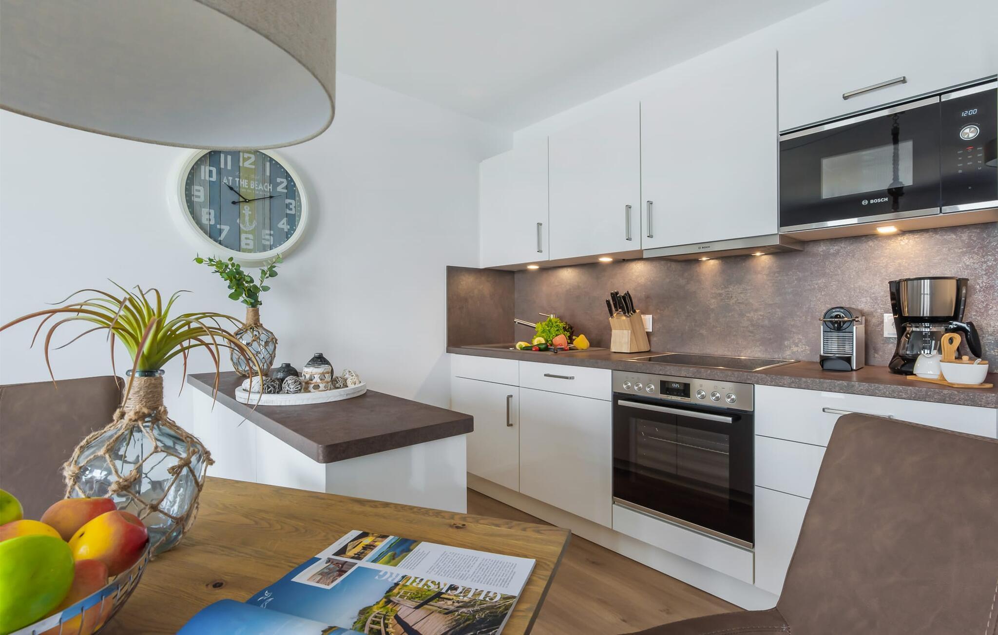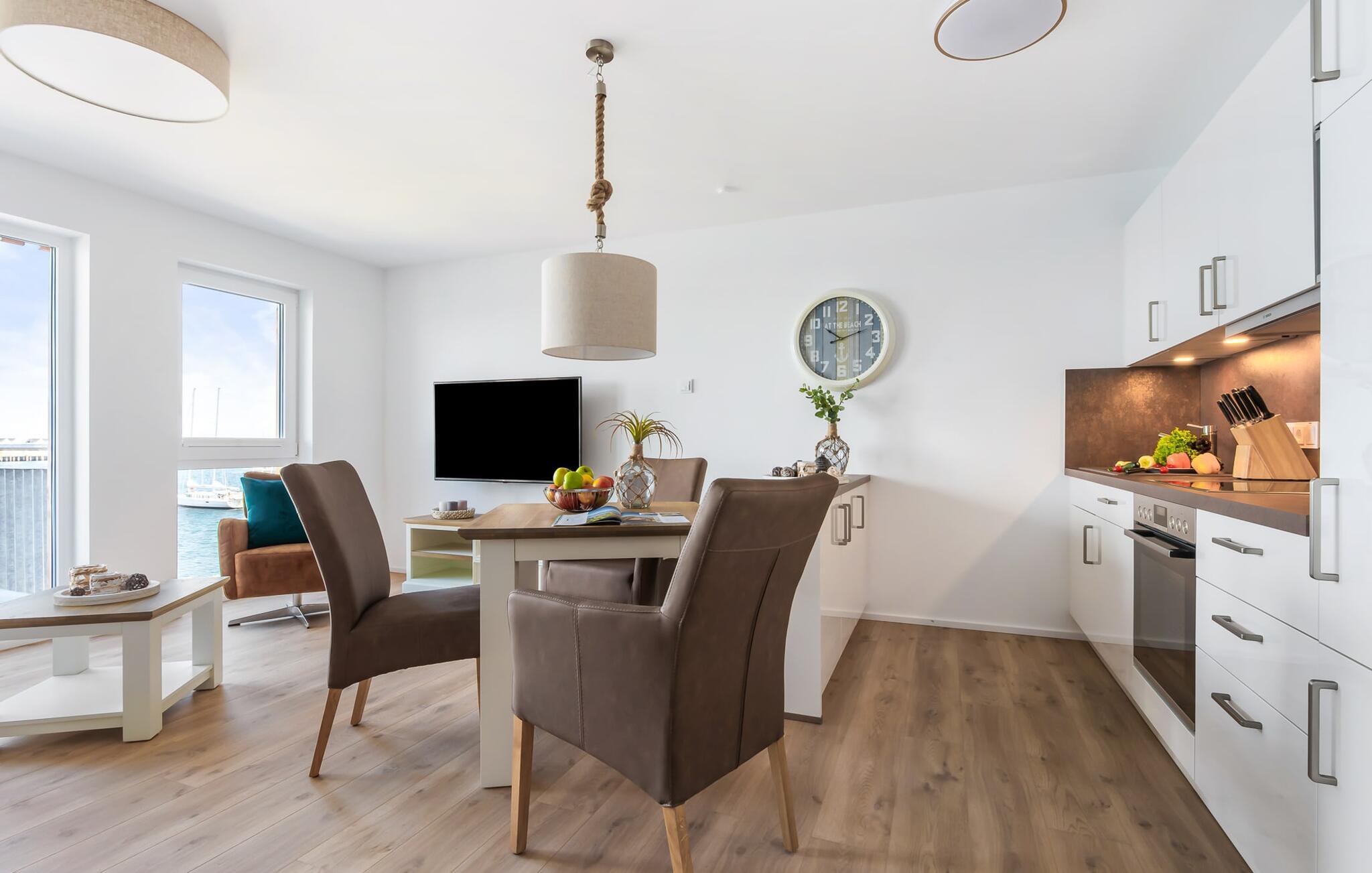 Beliggende direkte på havnepromenaden i feriestedet Olpenitz ved Østersøen, ligger ferielejligheden ST. MALO sover 2 personer og byder på alt hvad I kan forestille jer til en afslappende ferie ved vandet. Promenaden med sine små fristende butikker og et velassorteret EDEKA-marked med bageri ligger bogstaveligt talt for gæstens fødder og indbyder til slentretur og indkøb. Sandstranden Weidefelder ligger i umiddelbar nærhed og er et must! Her er smukt på alle tider af året, ikke kun når strandstolene kalder om sommeren. I kan tage endeløse gåture her på den åbne Østersø og lade hverdagen bag jer. Lås lejlighedsdøren op, kom ind og føl jer godt tilpas i ST. MALO! jeres udsigt falder direkte gennem gulv-til-loft vinduerne over altanen til havnen og vand til horisonten. Det er ren feriefølelse! Den åbne stue/spisestue med den hyggelige opholdsstue og fjernsyn inviterer jer til at dase og det veludstyrede køkken frister jer til at lave mad sammen, især takket være den integrerede køkkenbord. Spiseområdet lader heller intet tilbage at ønske, og I bliver glad for at blive siddende længere. Soveværelset med sin komfortable dobbeltseng og endnu et fjernsyn tilbyder de bedste betingelser for afslappende nætter. Ud over alt det nyttige, har badeværelset en bruser på gulvniveau til en vellykket start på en ny feriedag. jeres pakke inkluderer en parkeringsplads ved huset og en elevator, der bringer jer komfortabelt til anden sal. Vores foretrukne sted: at tilbringe hyggelige timer på balkonen og se travlheden i havnen... Bemærk venligst: OstseeResort Olpenitz er meget populært, og der bygges fortsat i parken. Ikke desto mindre kan I se frem til en 5-stjernet standard og et førsteklasses ophold. Byggeaktiviteterne kommer ikke til at forstyrre jer på ferien, og derfor gives der ikke yderligere afslag i prisen.
